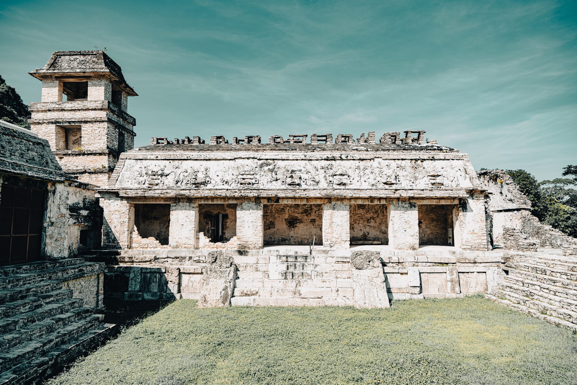 The Palace is a sprawling complex of courtyards, corridors, and towers. It likely served administrative, residential, and ceremonial functions. The four-story tower is unusual in Maya architecture and may have been used for astronomical observation or ritual purposes.
