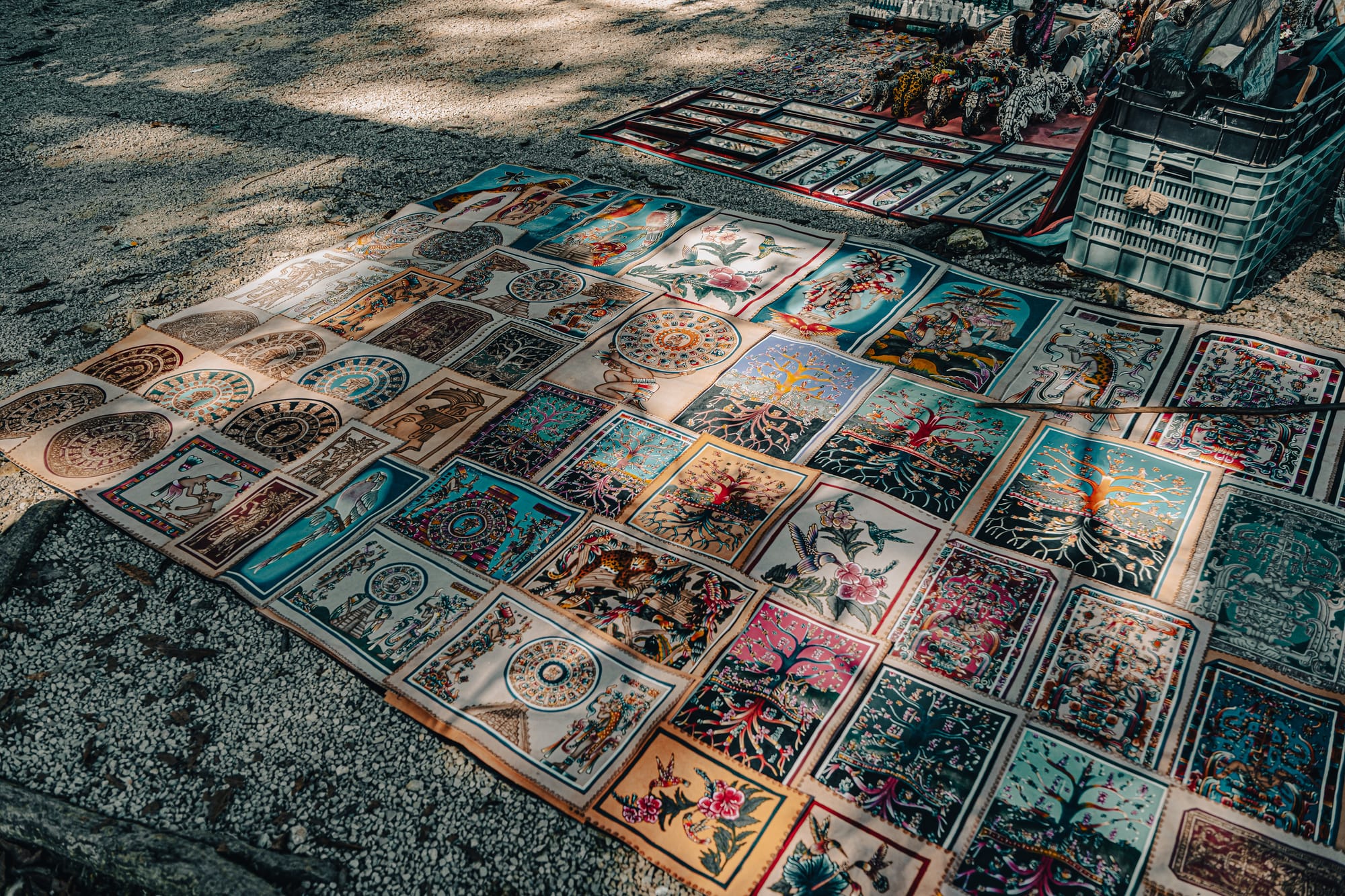 Souvenirs, reproductions, and everyday commerce sit at the edge of the ruins
