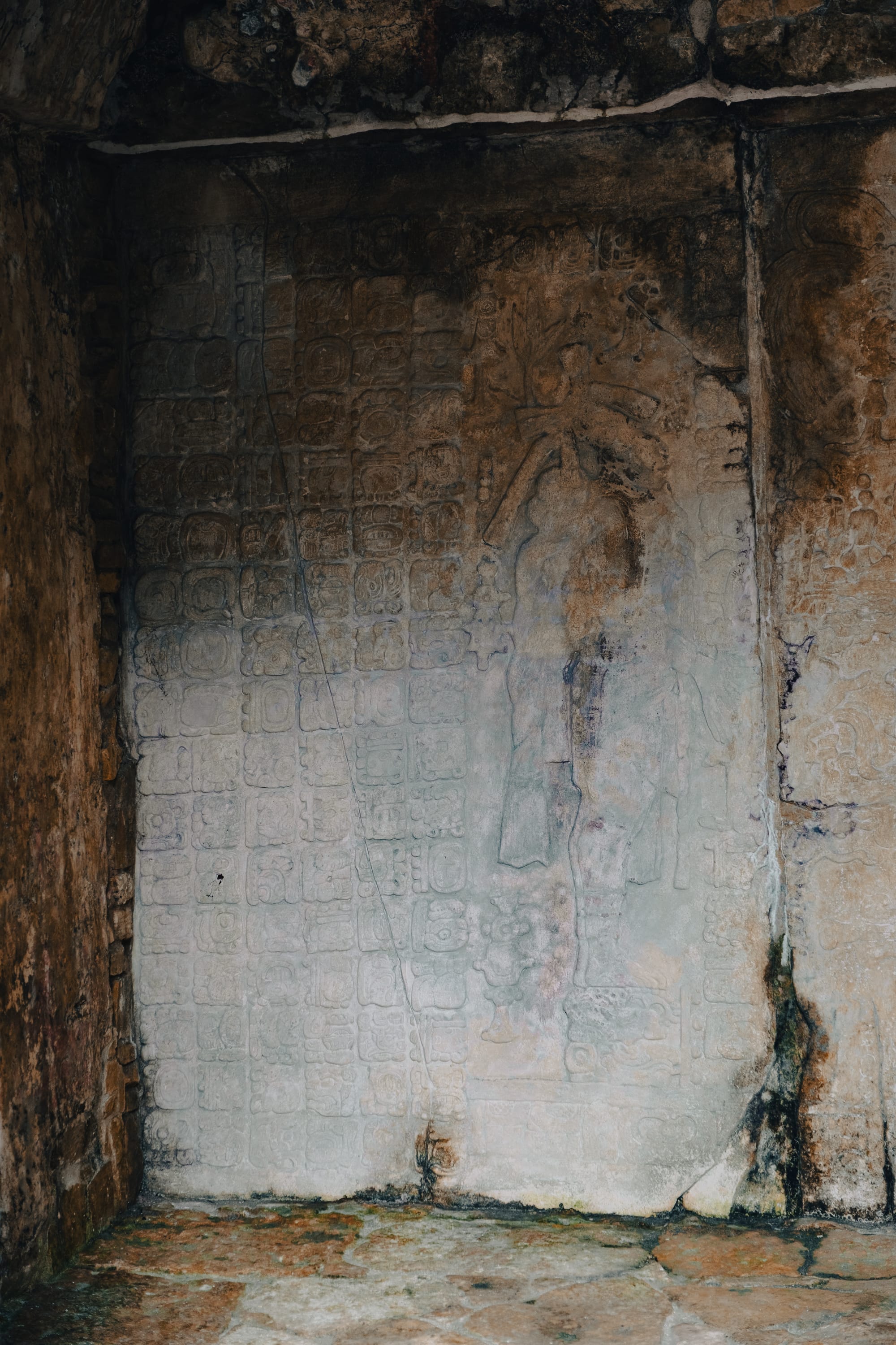 Many of the most important inscriptions are concentrated around the Temple of the Inscriptions, but fragments and panels are scattered throughout the site. Some are crisp enough that individual glyphs stand out clearly: faces, knots, animal forms, calendar symbols. Others are softened by centuries of rain and humidity, their meanings partially eroded, their presence more textural than legible. You don’t need to read Maya script to feel the intention behind them—these were not decorative additions, but records meant to endure.