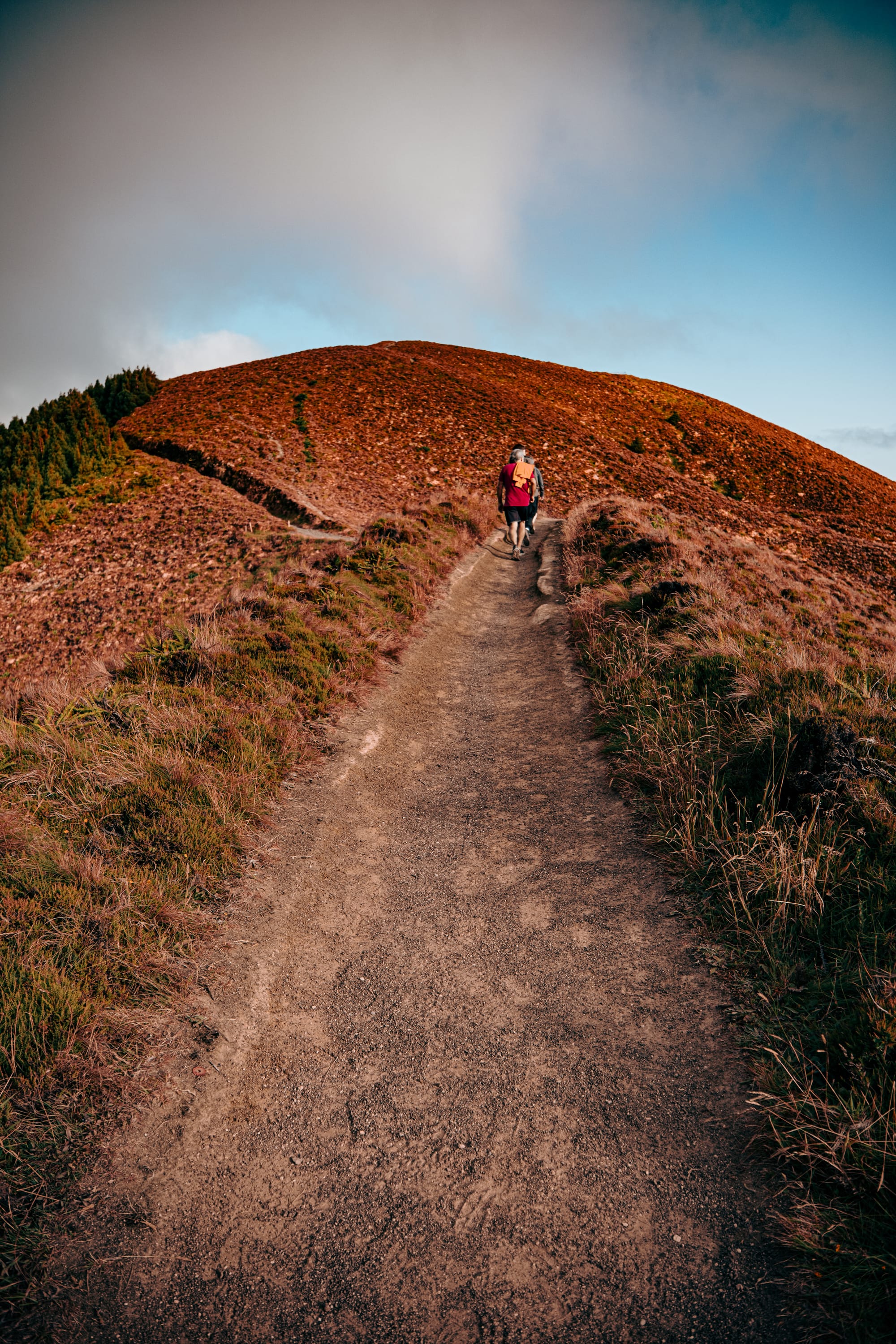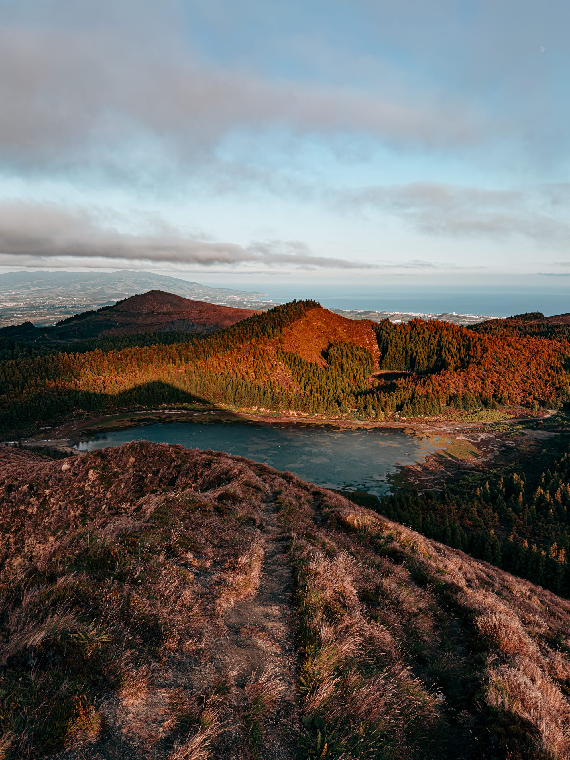 Each lagoa offers its own moment of pause. Some you encounter from above, as still ovals below. Others invite you close, the path dipping briefly toward their edges before leading back upward again. No two feel the same, and that variation becomes a rhythm, a visual counterpoint to the steady forward motion of the trail.