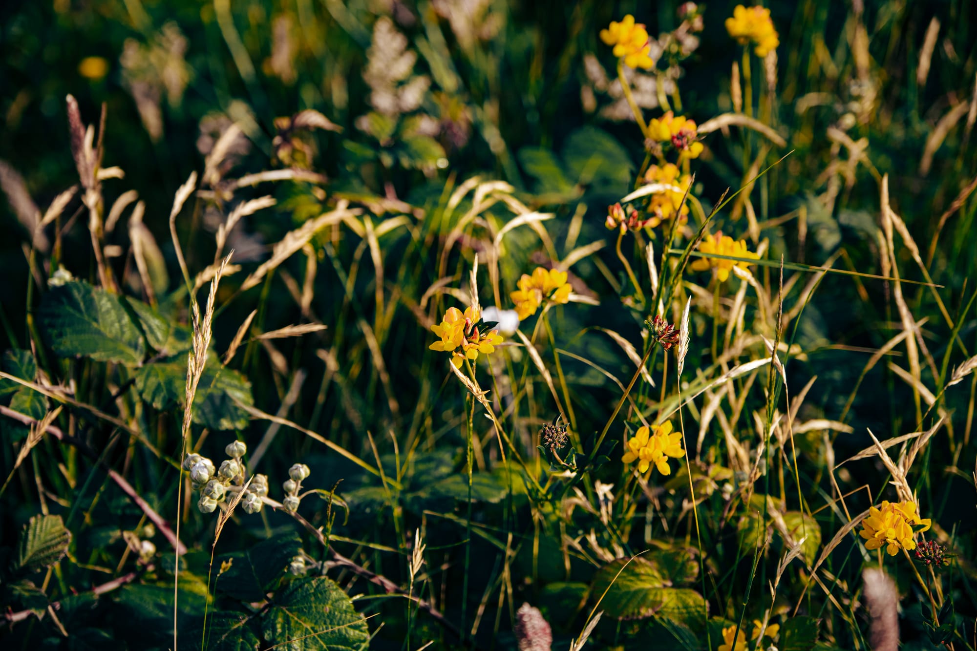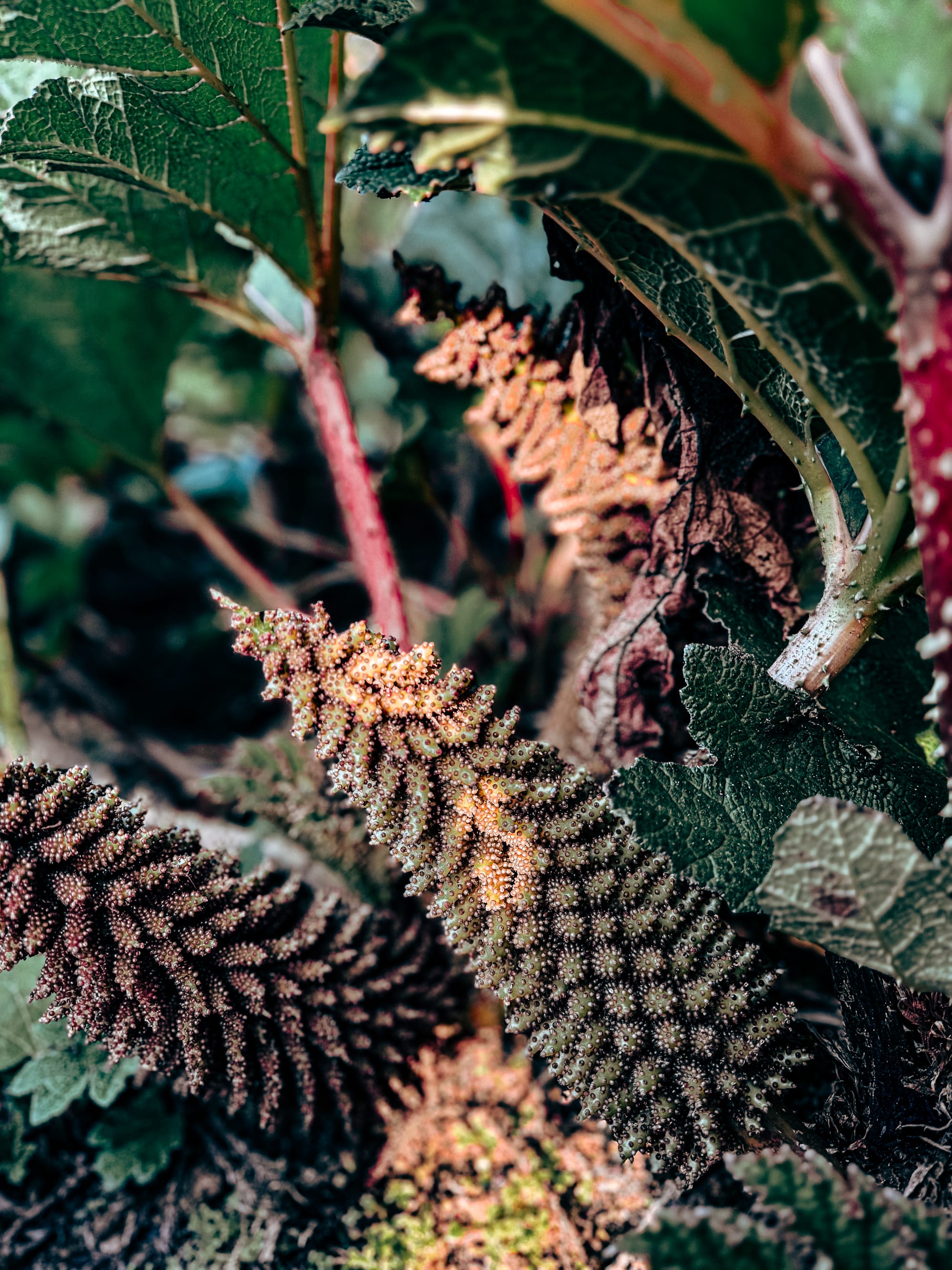 Details from the trail’s edge: yellow wildflowers in the wind and spiked seed heads curled beneath large volcanic leaves