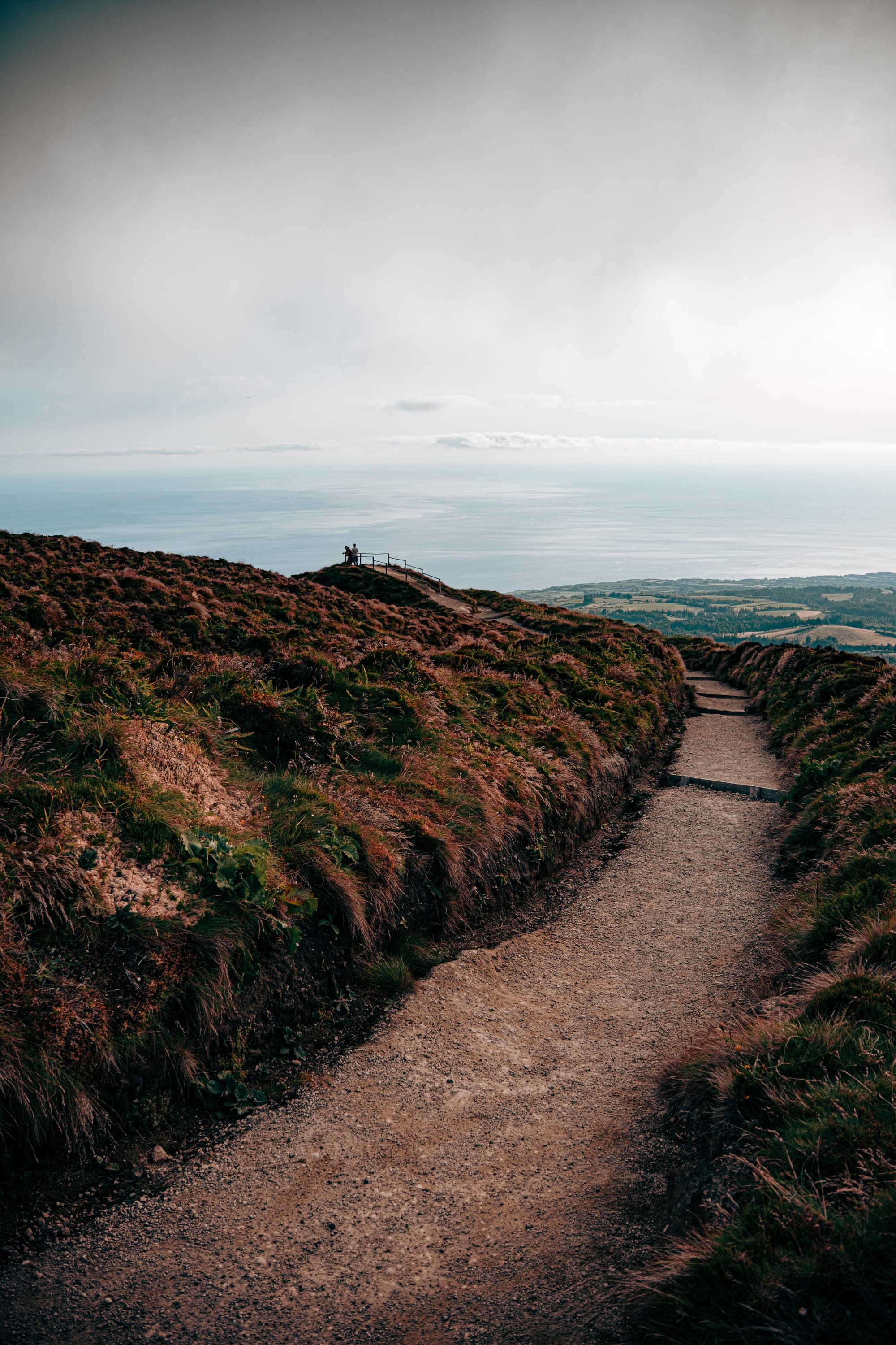 A carved path winding through mossy hills meets a panoramic view of crater lakes