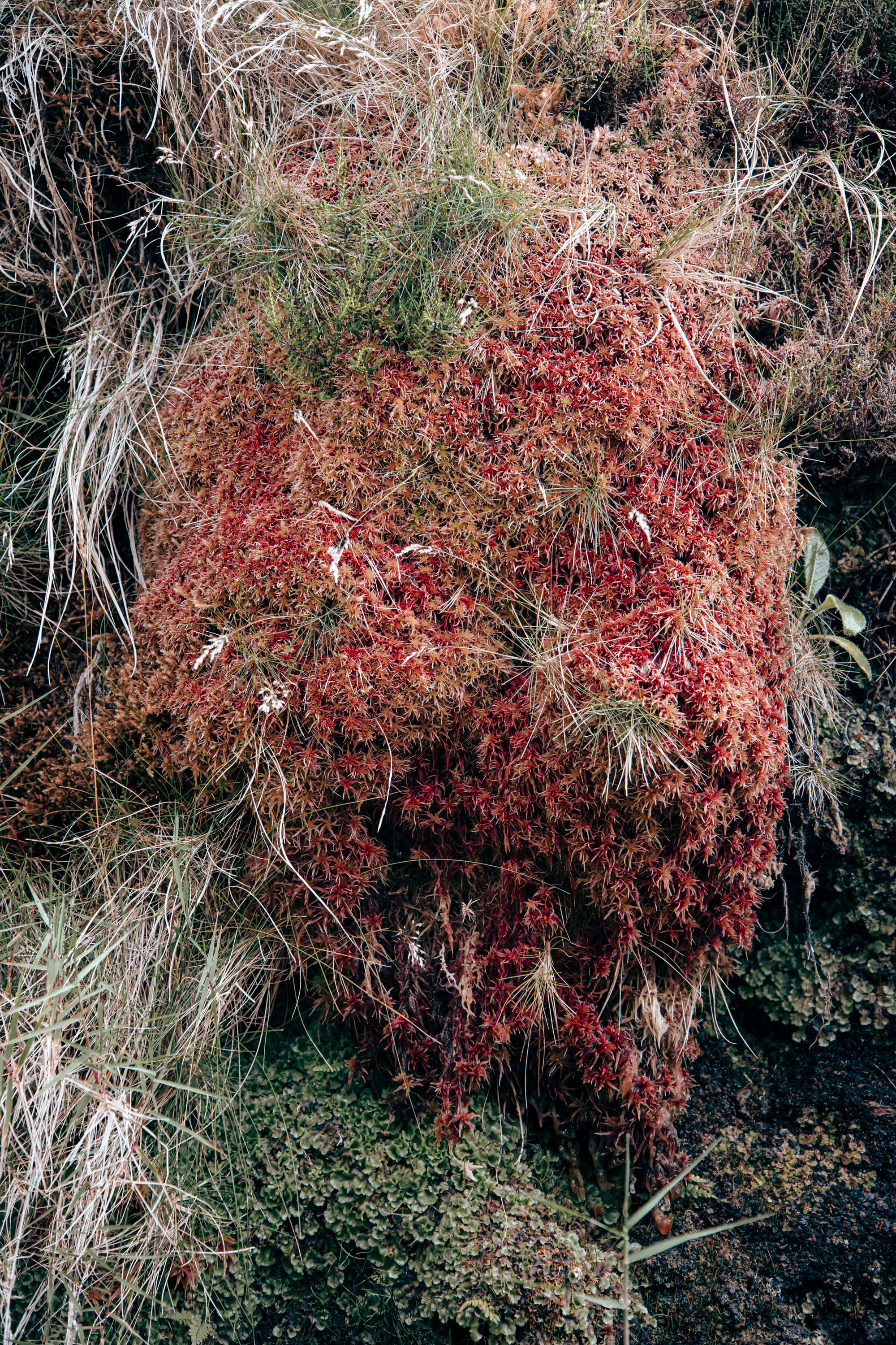 The red moss in particular glows against the volcanic earth. It creeps up boulders and spills over ledges, adding an electric contrast to the rust-colored slopes.
