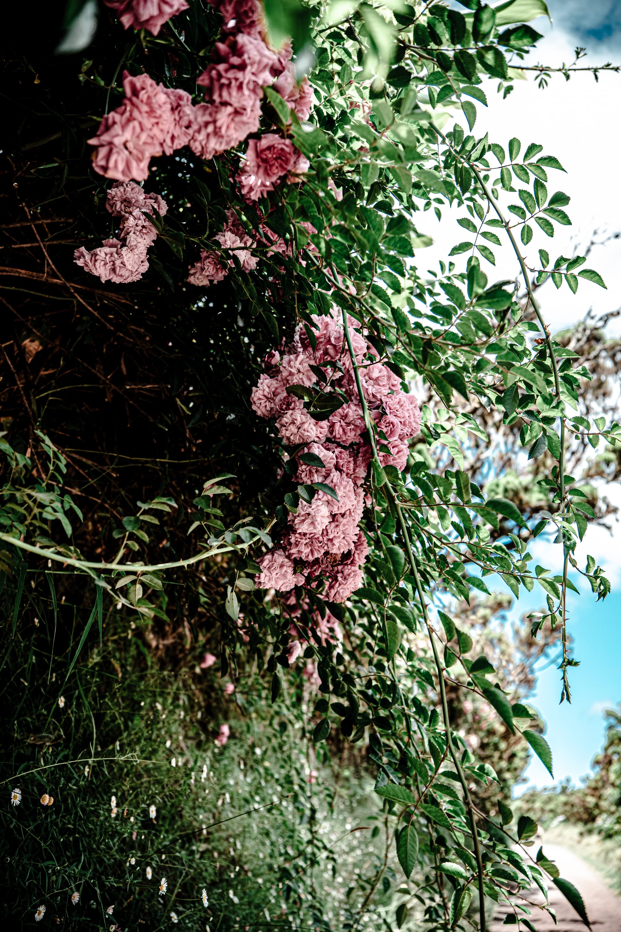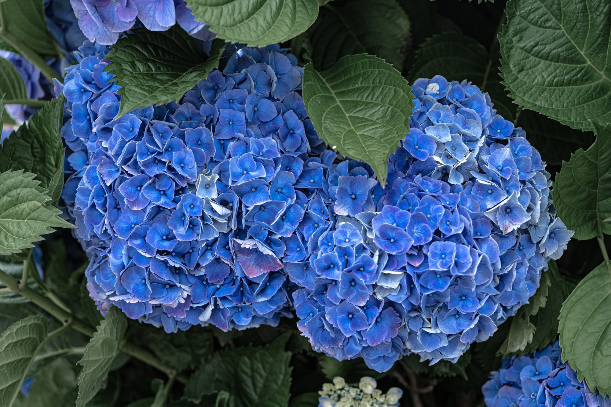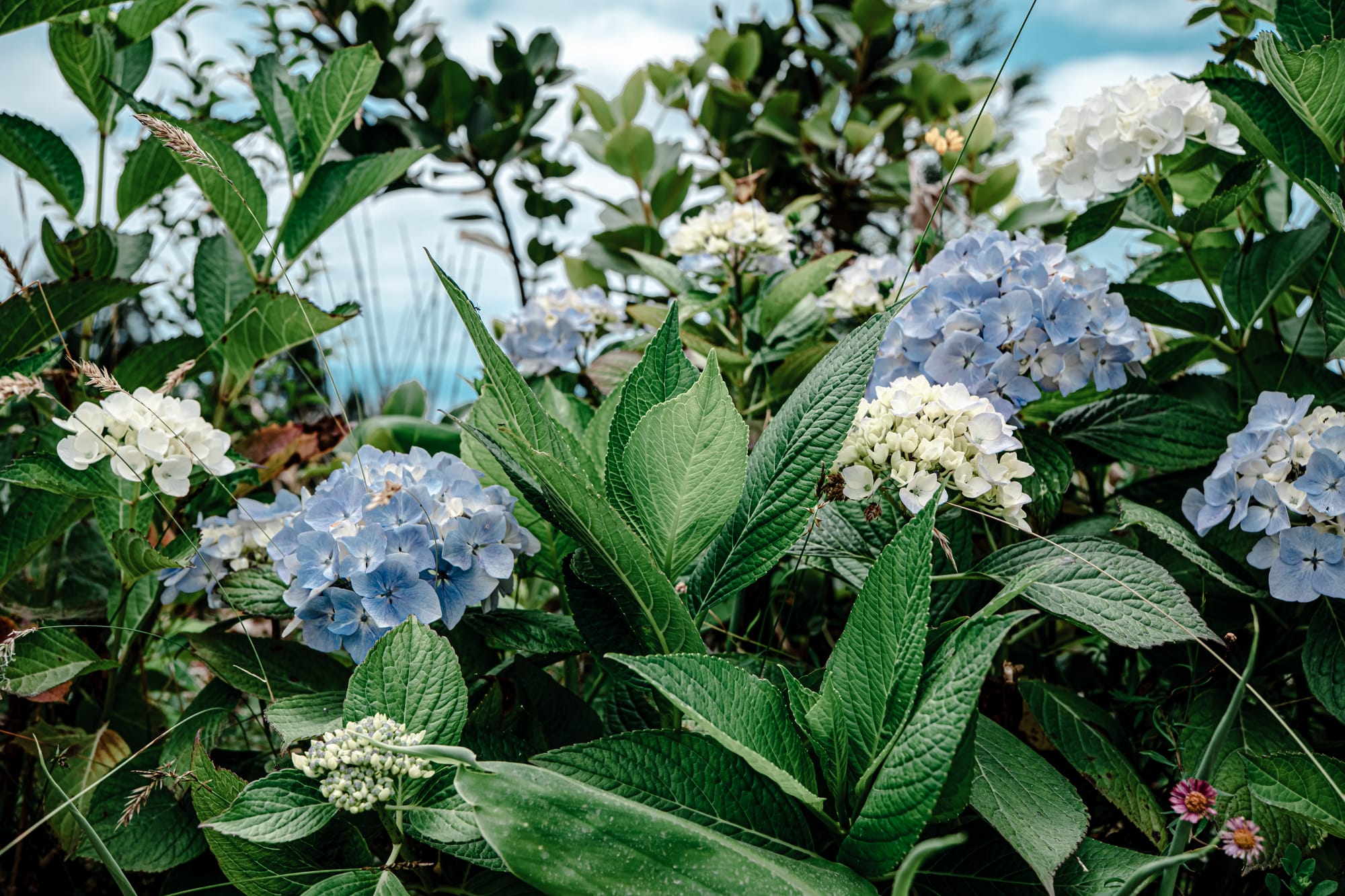 As you continue down, the trail passes through dense botanical corridors. You'll see thick hedges of white and blue hydrangeas lining the path, blooming madly as if untamed. Patches of wildflowers shimmer.