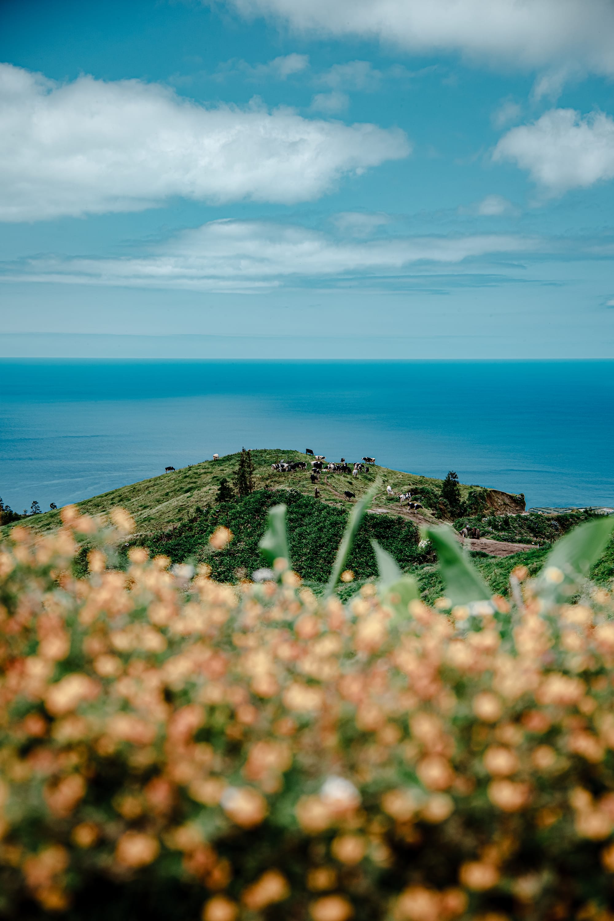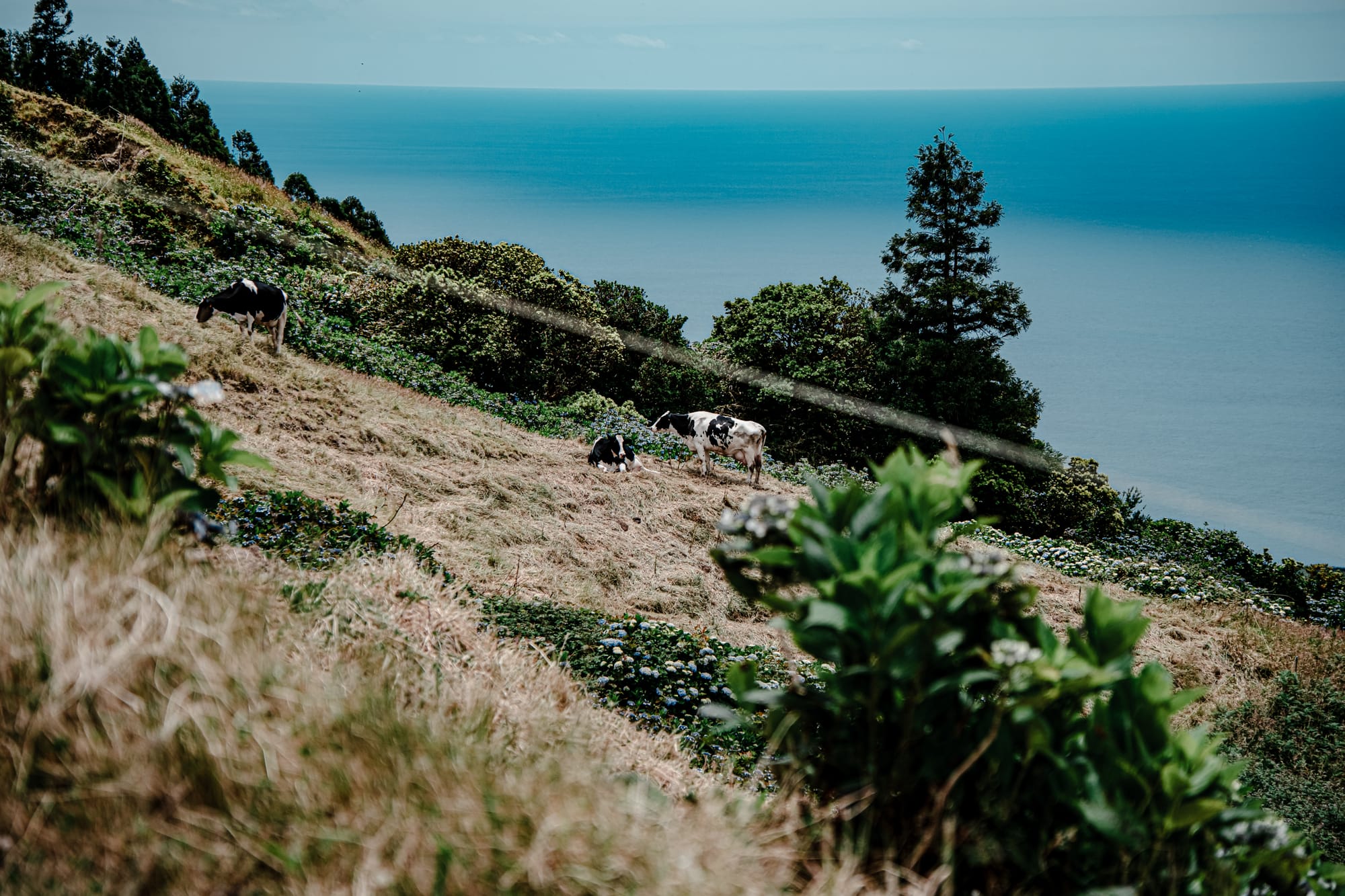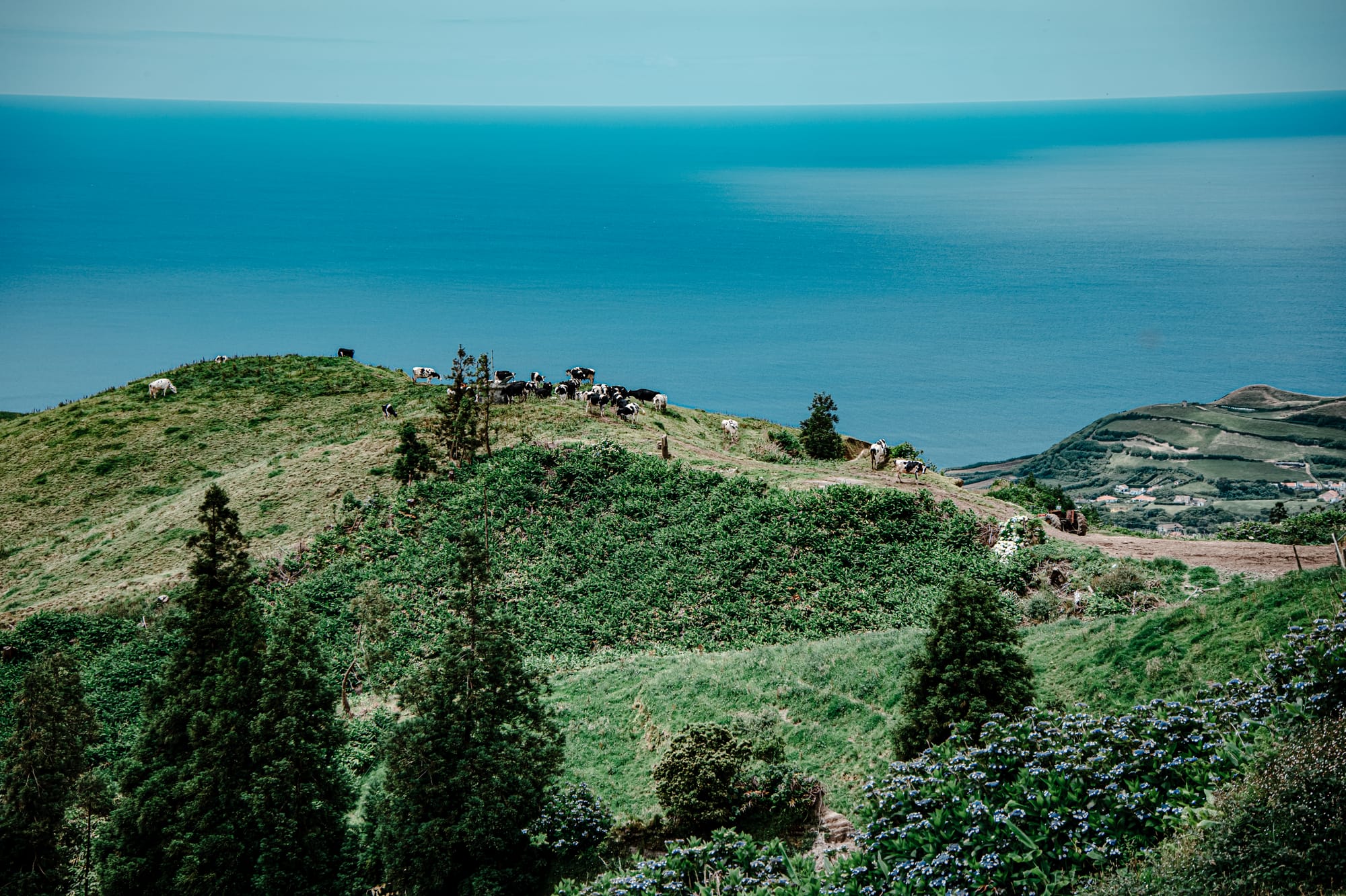 Cows graze along steep pastures with sweeping views of the Atlantic Ocean on the PR3-SMI trail
