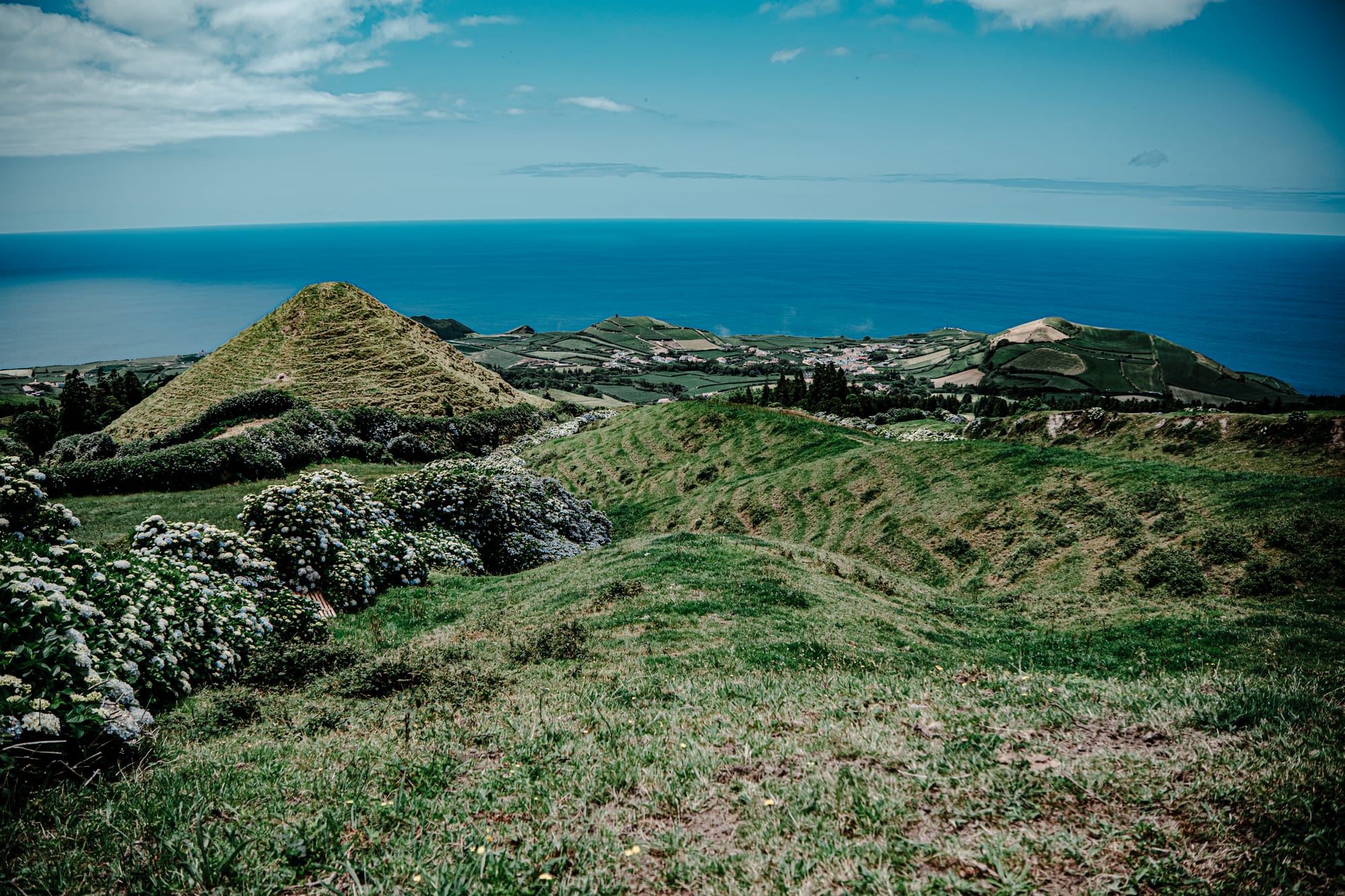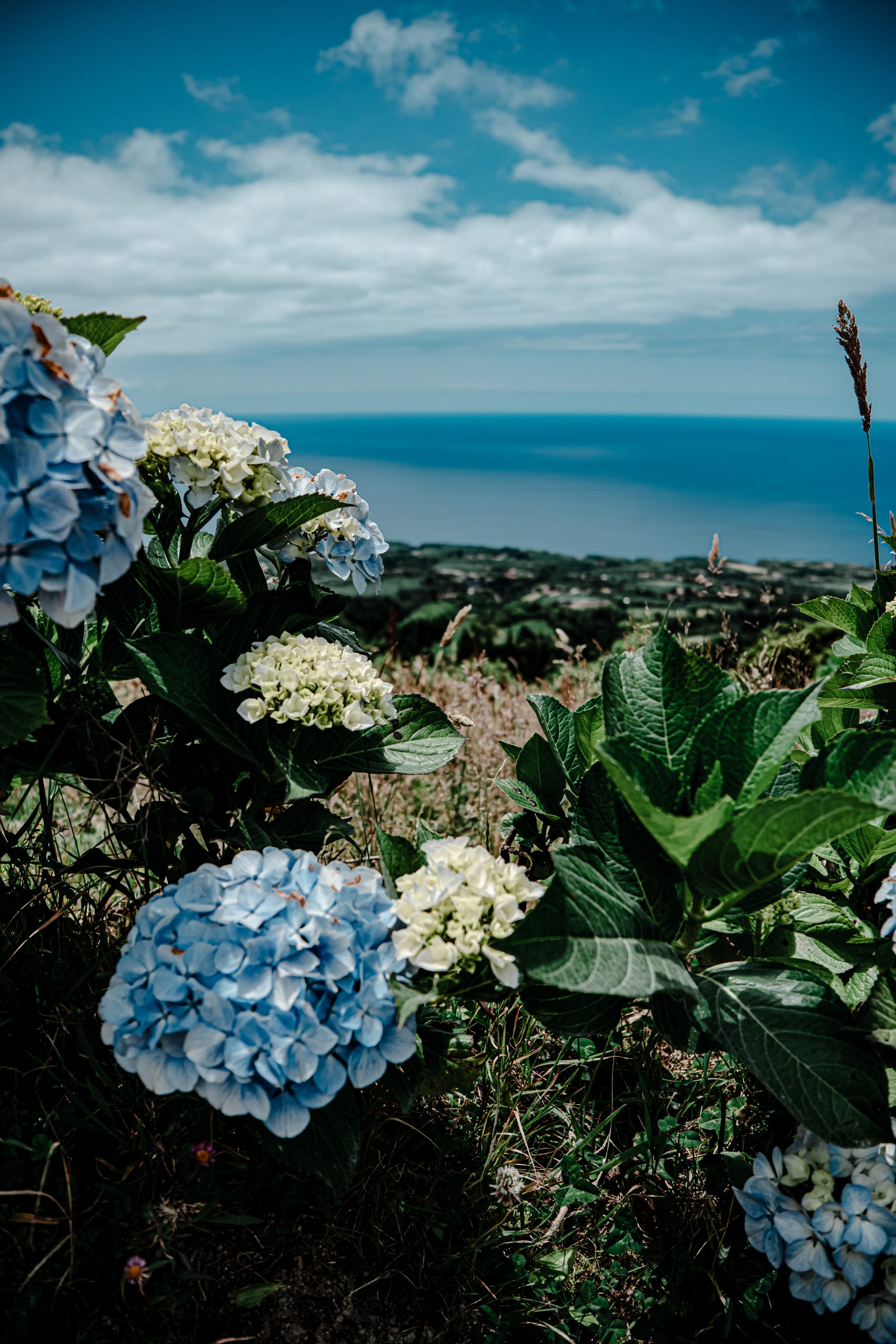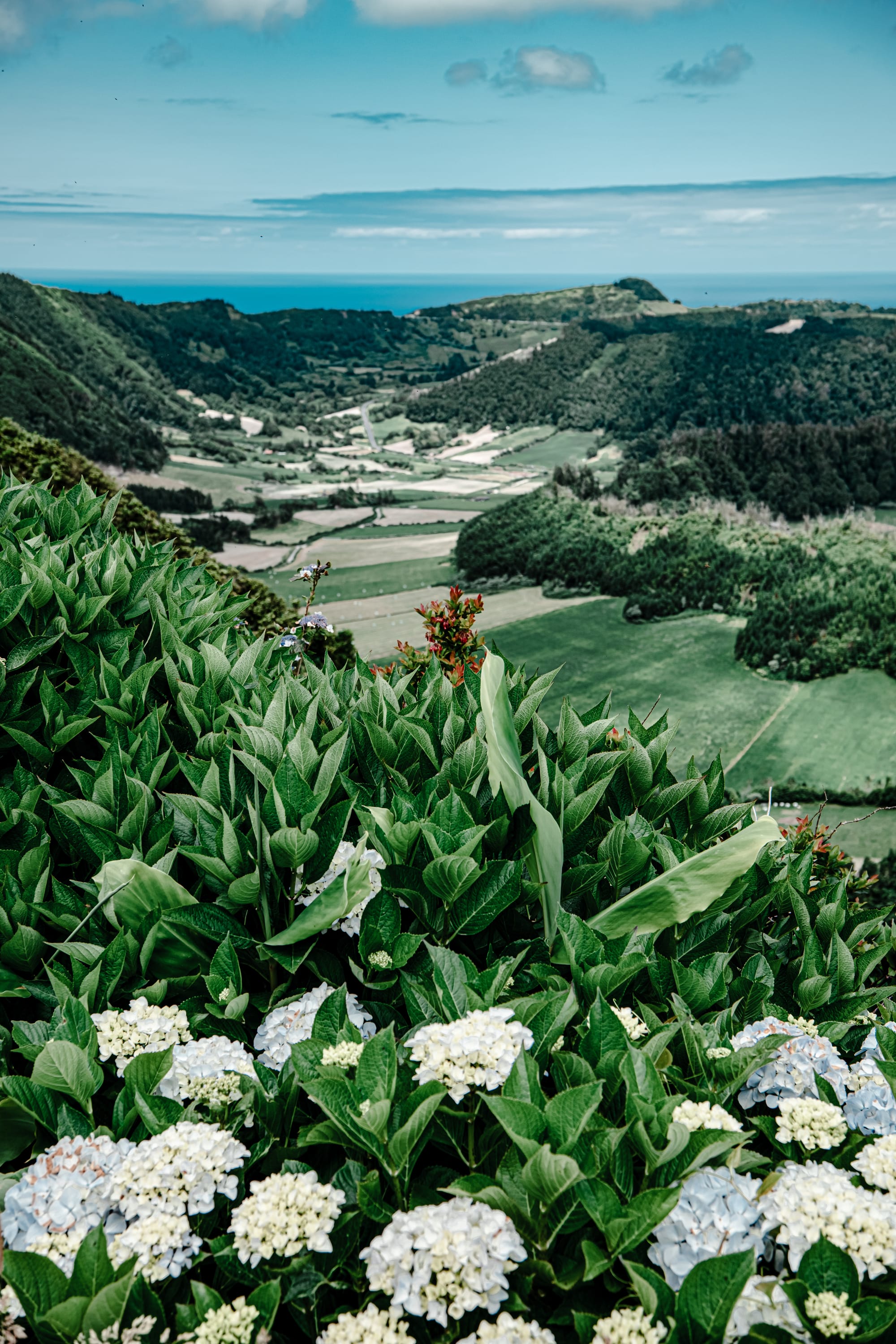 Hydrangeas bloom along the edge of the PR3-SMI trail, framing views of the inland valleys and the Atlantic