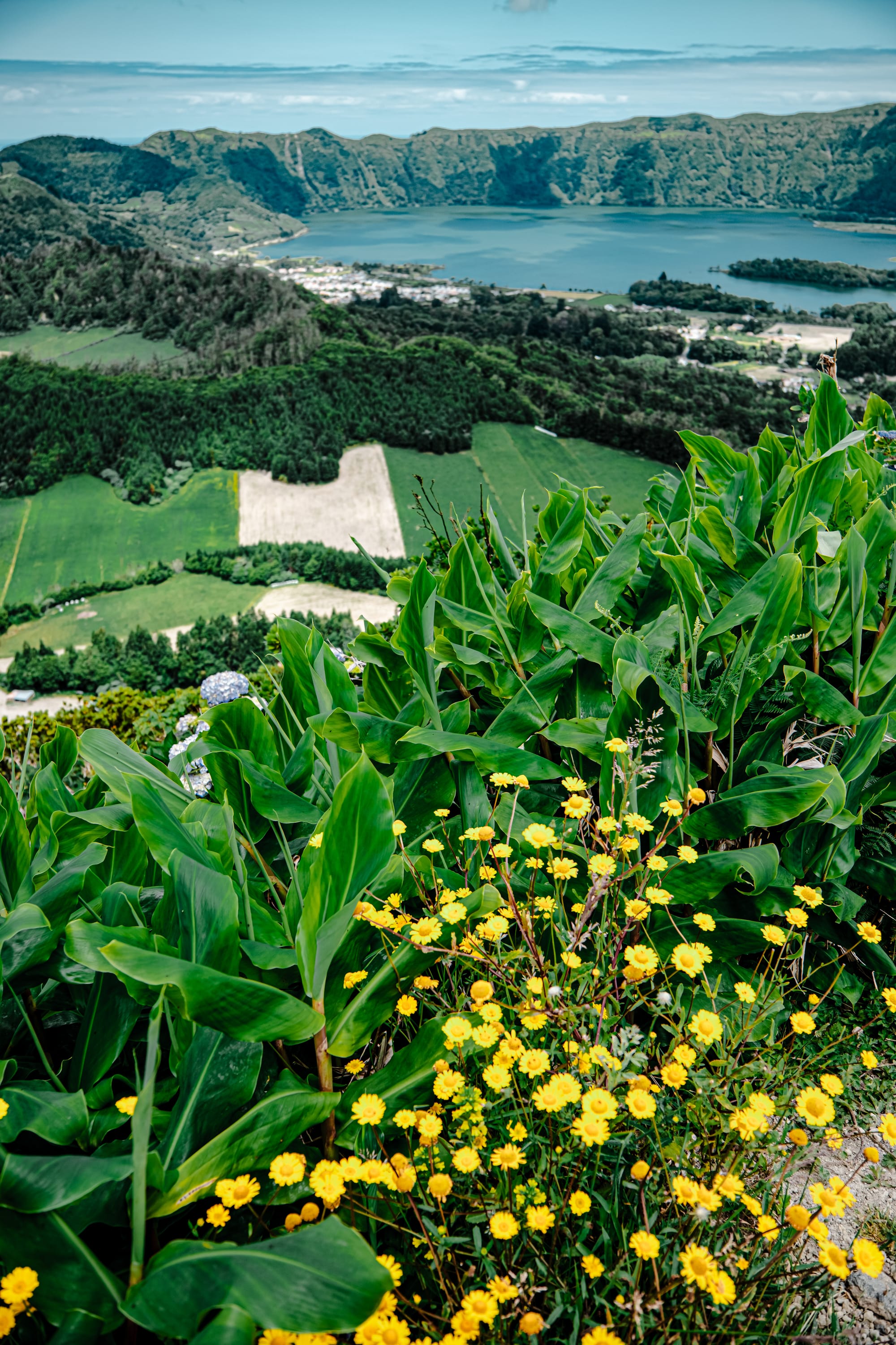 Much of the hike skirts the edge of the caldeira. On one side: sheer green slopes, sometimes covered in fields of wildflowers. On the other: sudden openings that reveal the blue and green lakes, stacked like reflections.