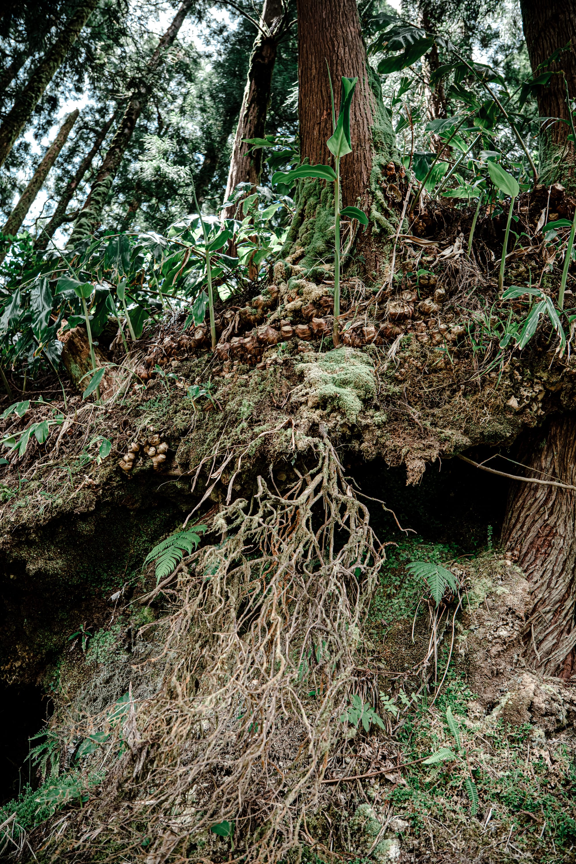 There’s a small whitewashed church—Igreja de São Nicolau—with a black basalt trim, gothic windows, and a sharp steeple. Its courtyard is shaded by towering trees, one of which you photographed with a spiraling root system that looks older than the church itself.
