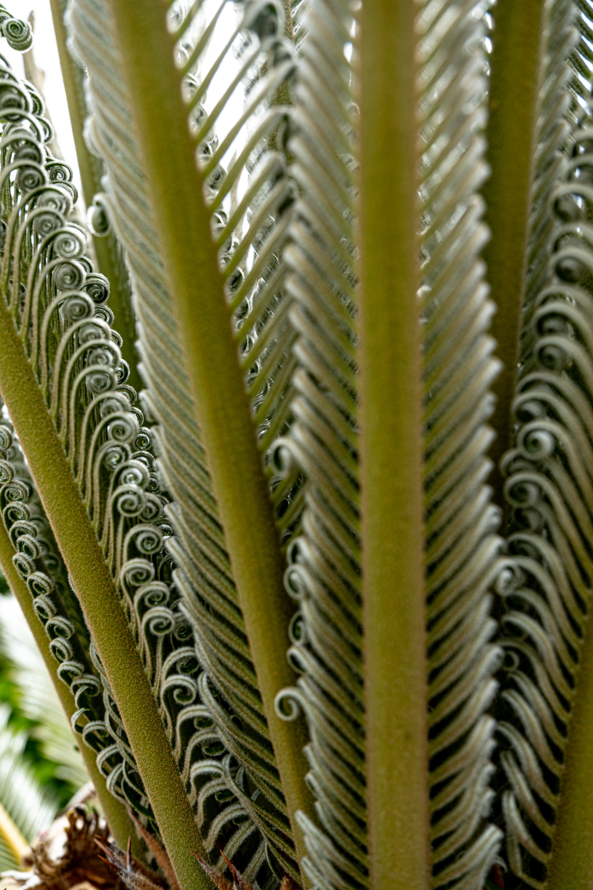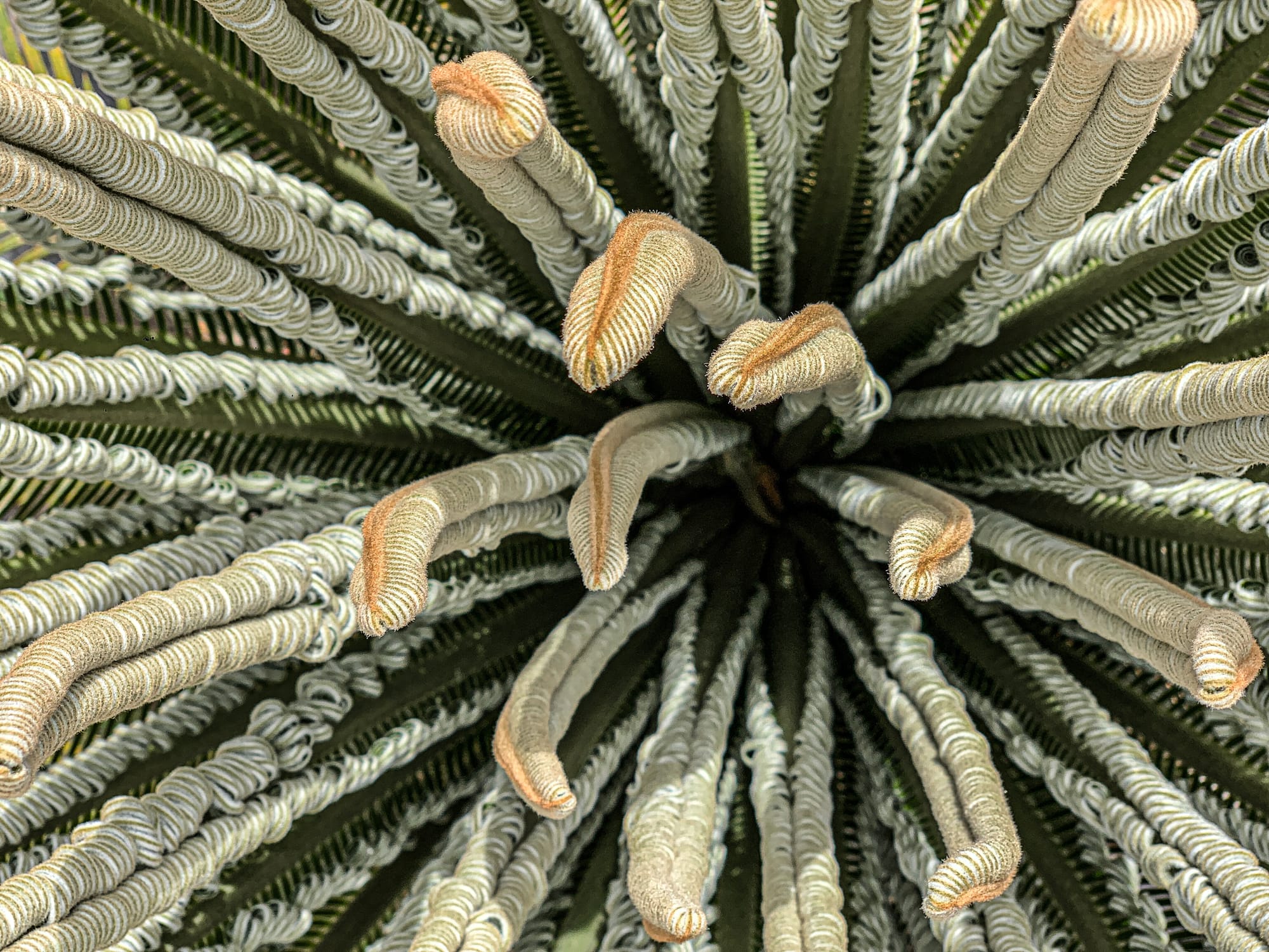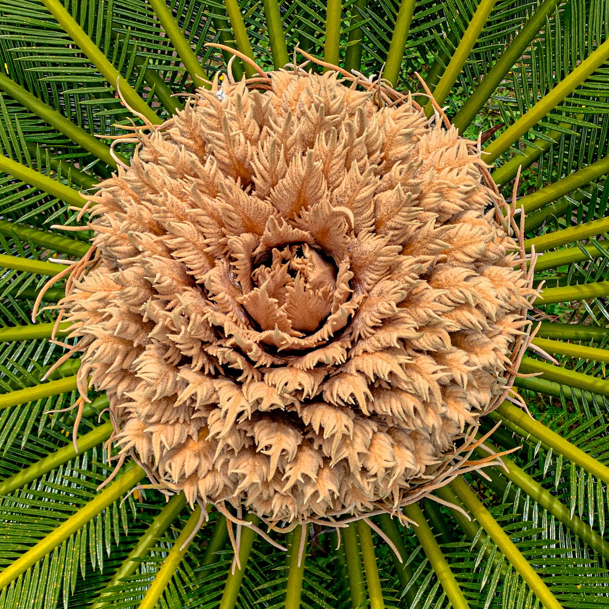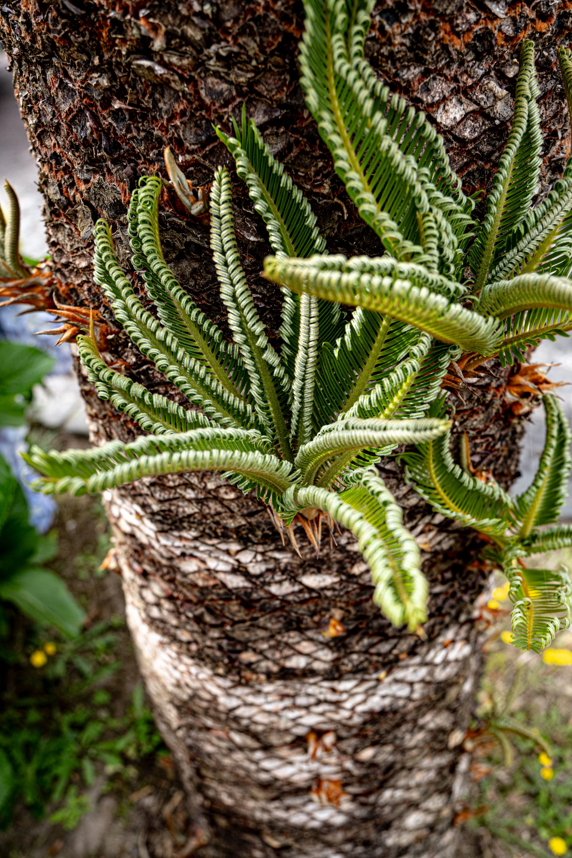 Close-up views of cycad fronds and cones, a striking prehistoric plant found in the Azores’ lush volcanic gardens