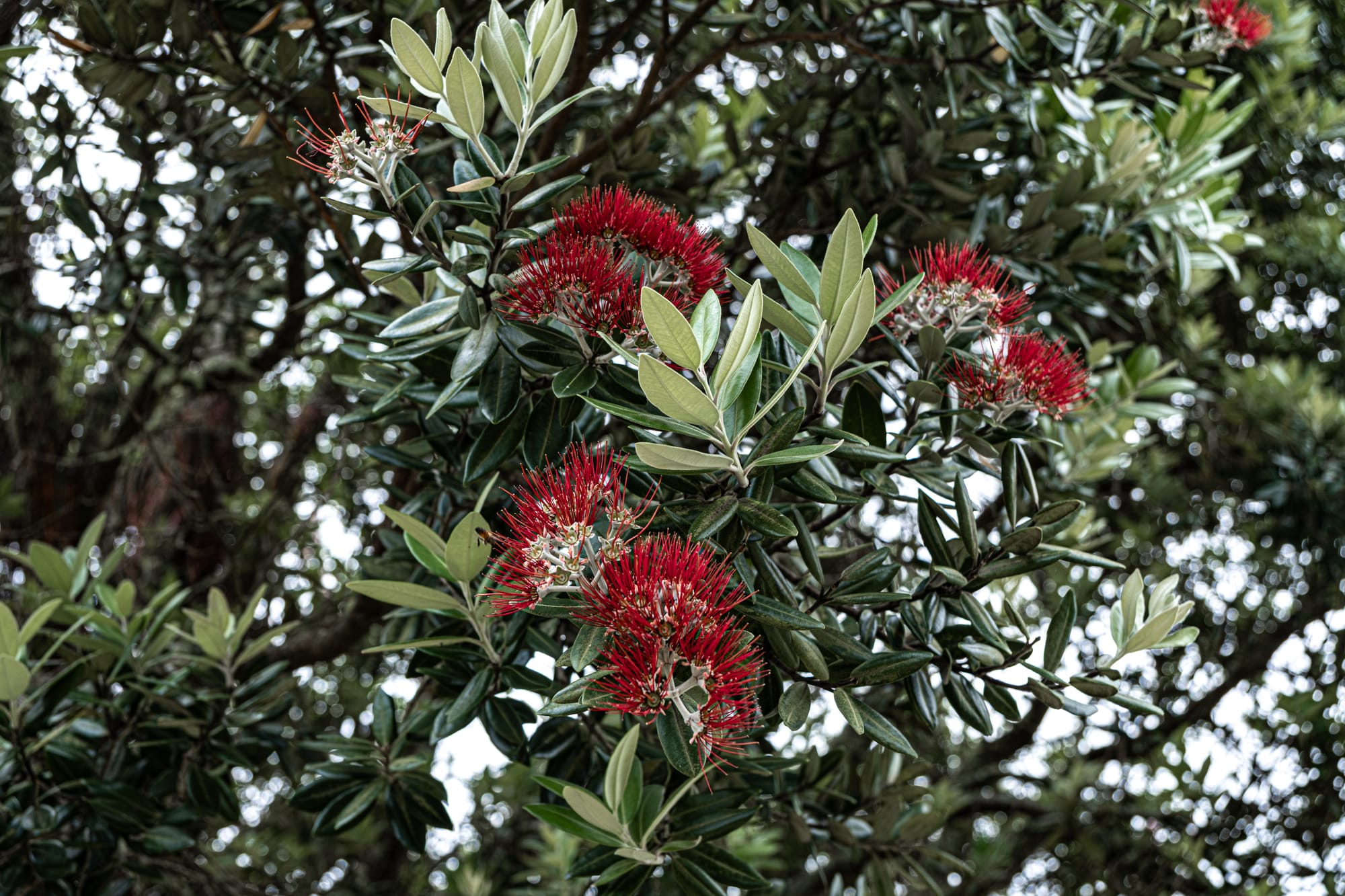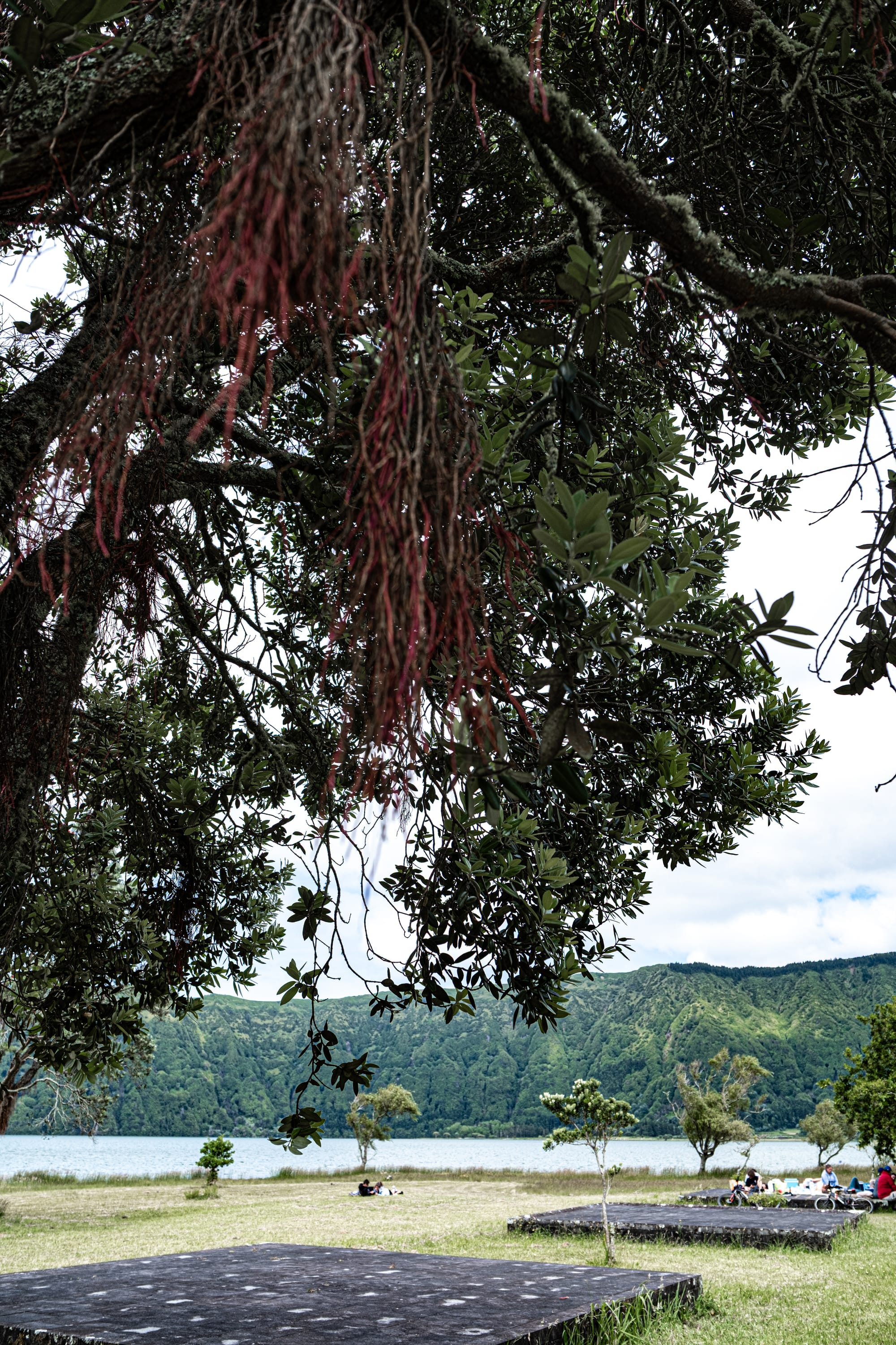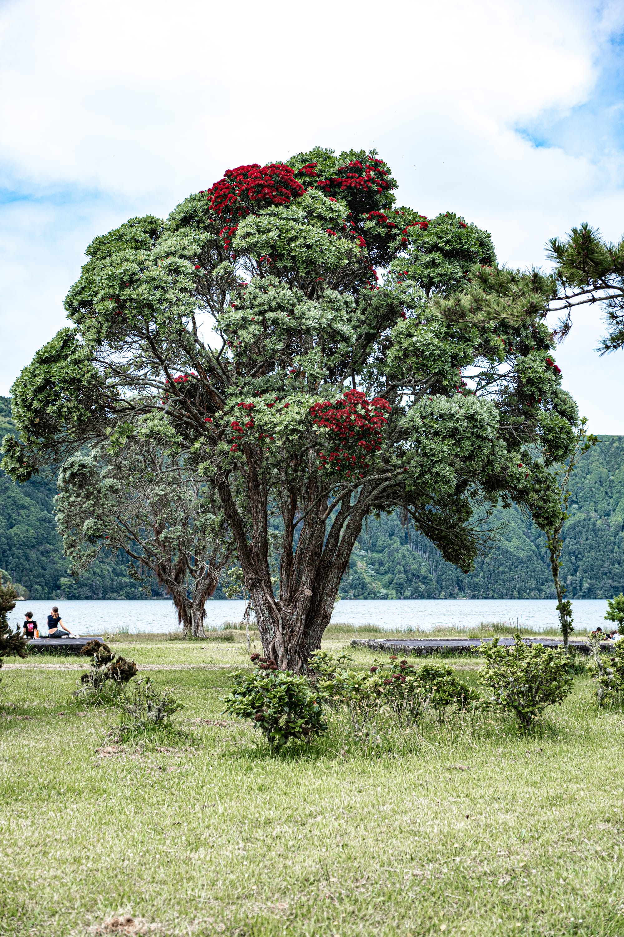 Lakeside pōhutukawa trees bloom in Sete Cidades, offering color, shade, and a sense of stillness