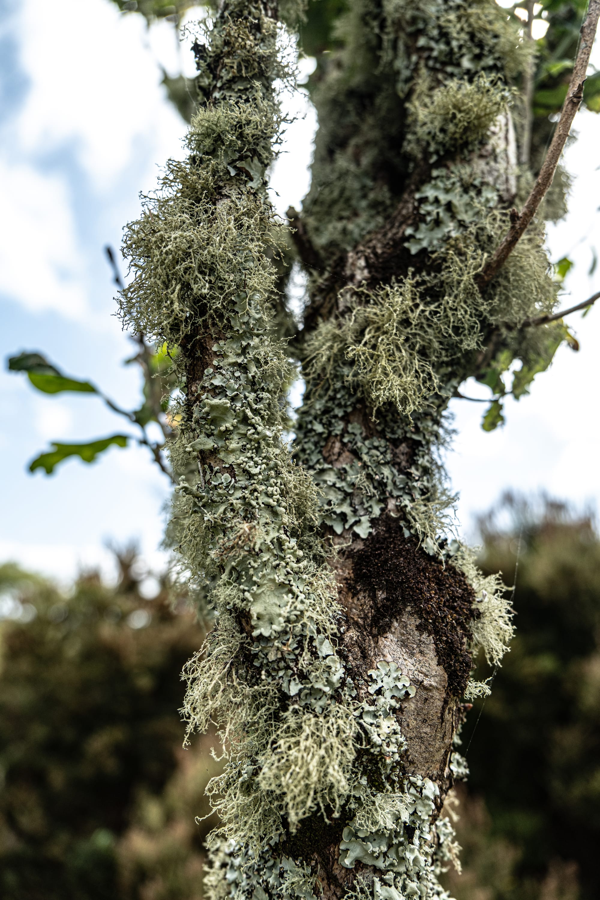 Moss carpets the ground beneath conifers, and in some places, tree trunks are bearded with lichen. A split log, half-decayed, sits covered in mushrooms and ferns.