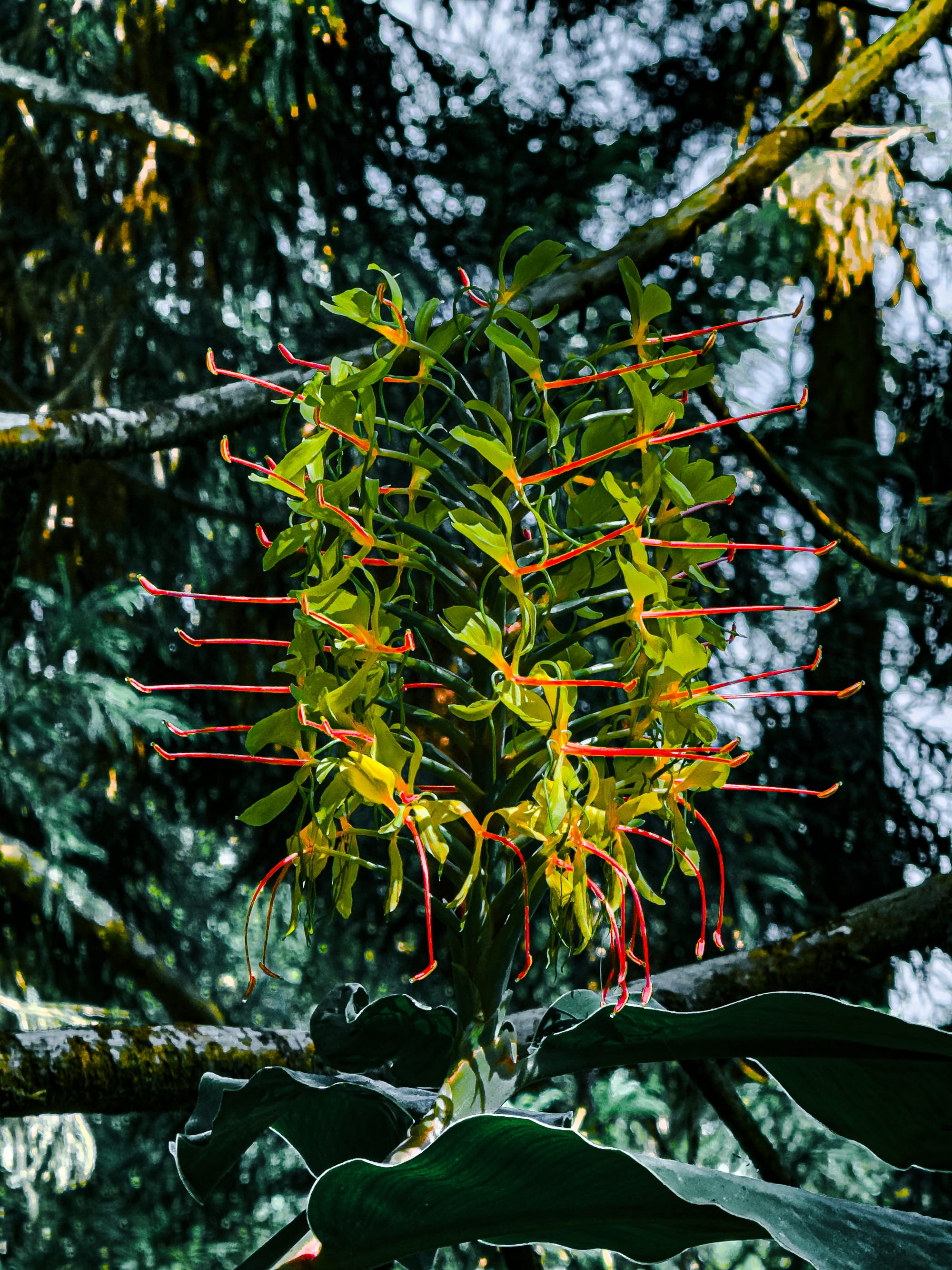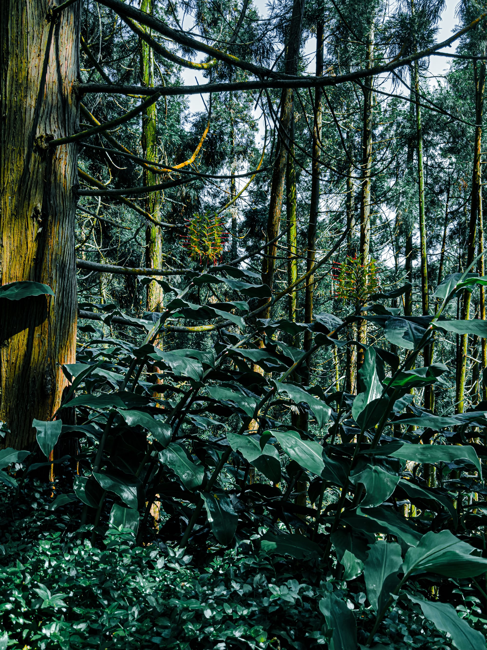 Ginger lilies growing in dense clusters beneath the cryptomeria canopy