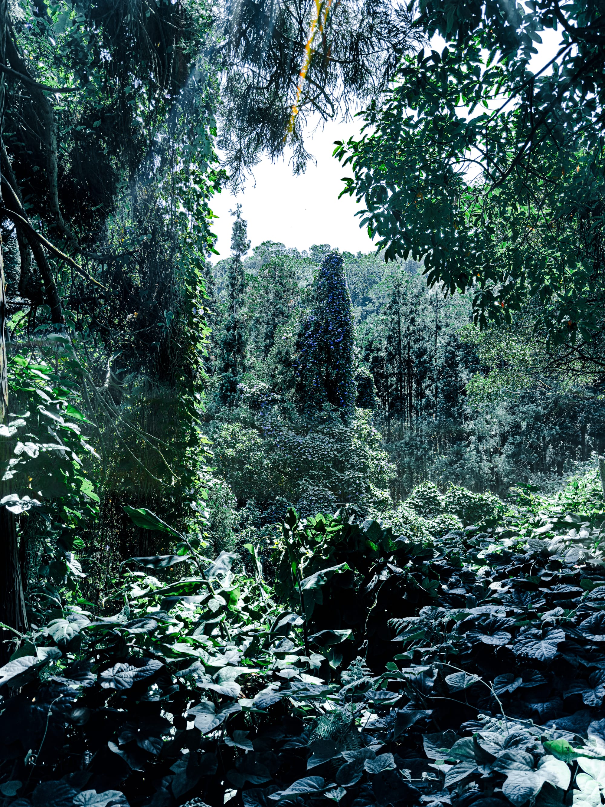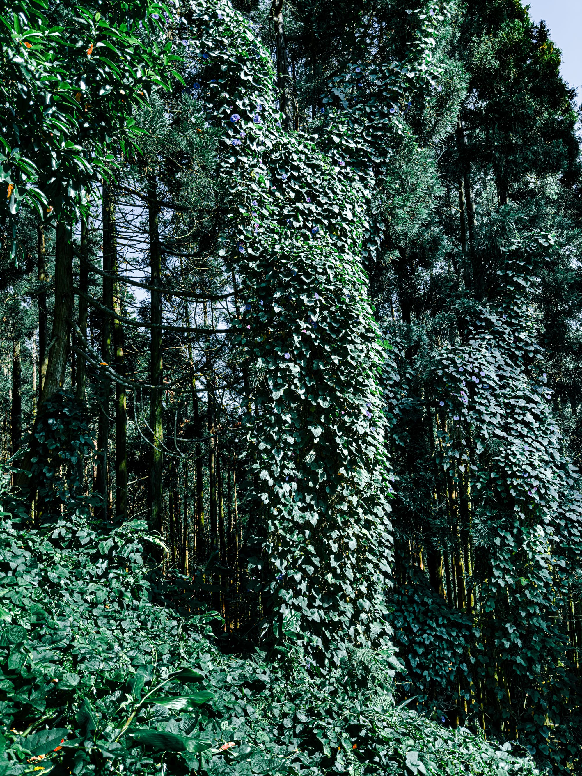 Towering trees wrapped in wild morning glory vines, their purple blooms cascading like soft vertical rivers