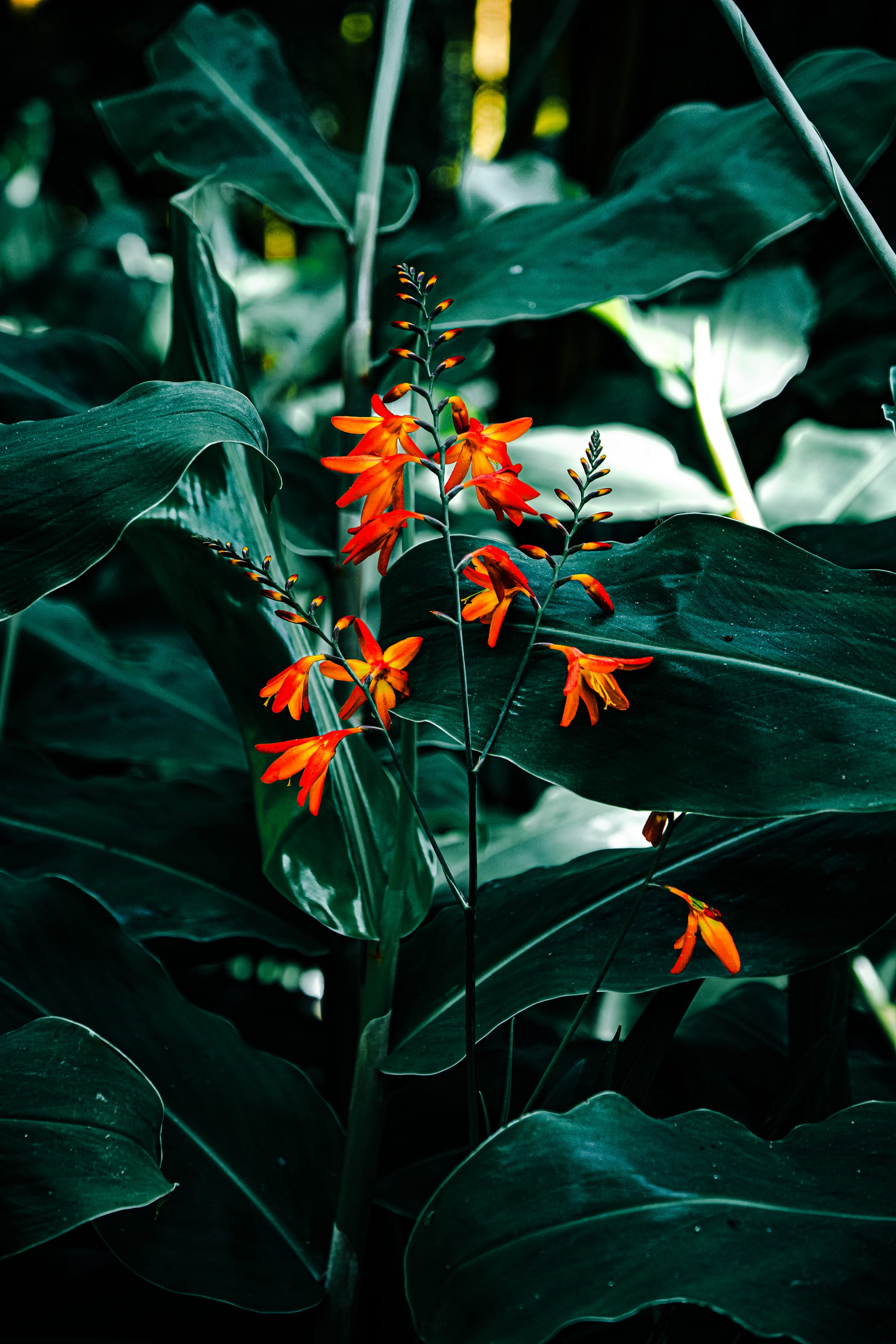Two signatures of the trail: bright orange crocosmia blooms and spiky green seedpods of wild canna