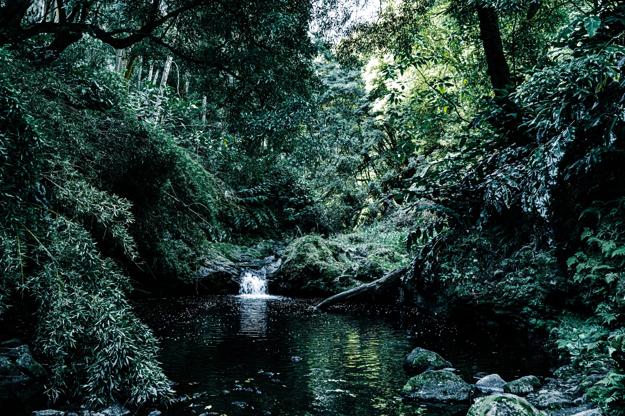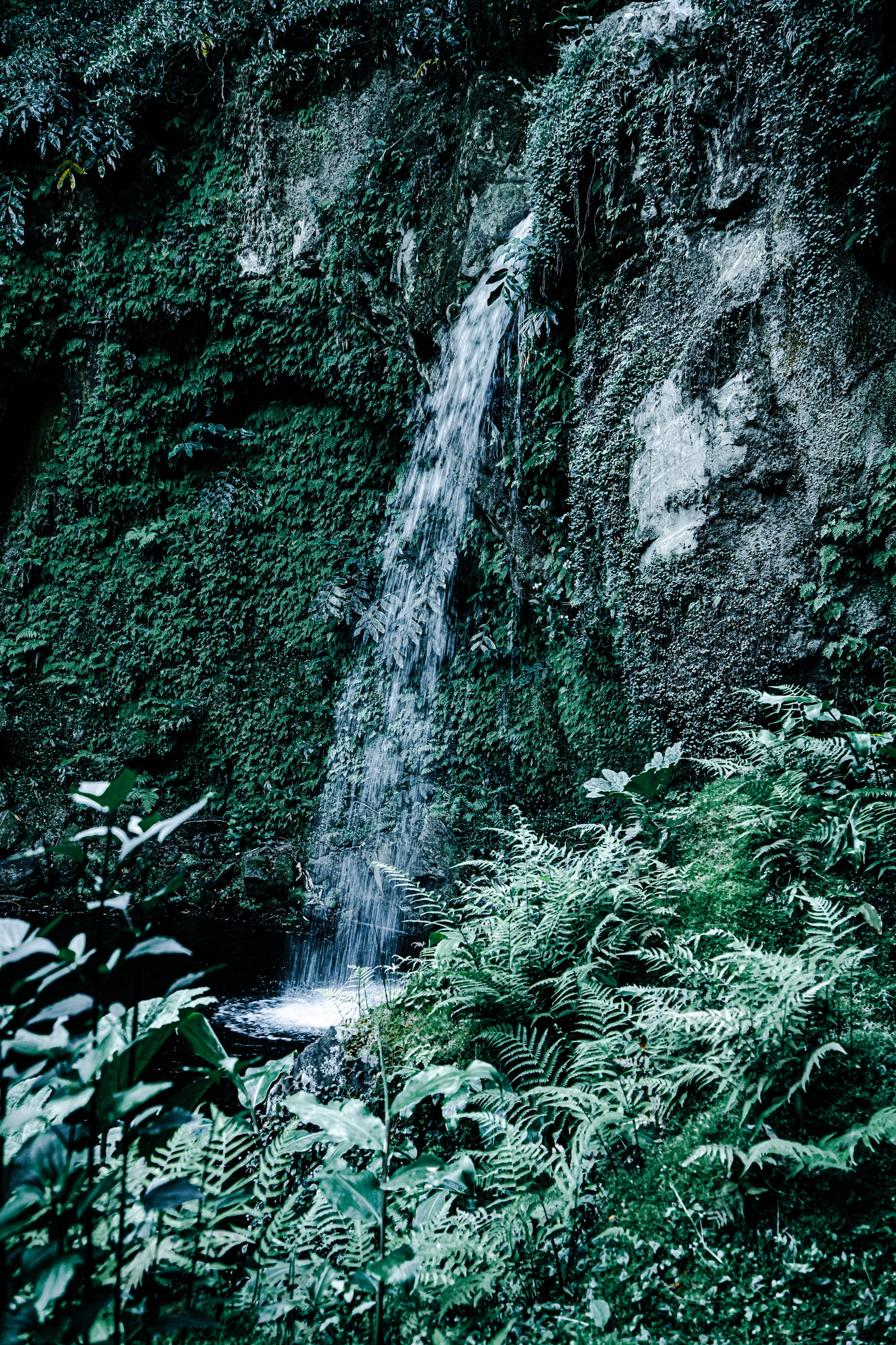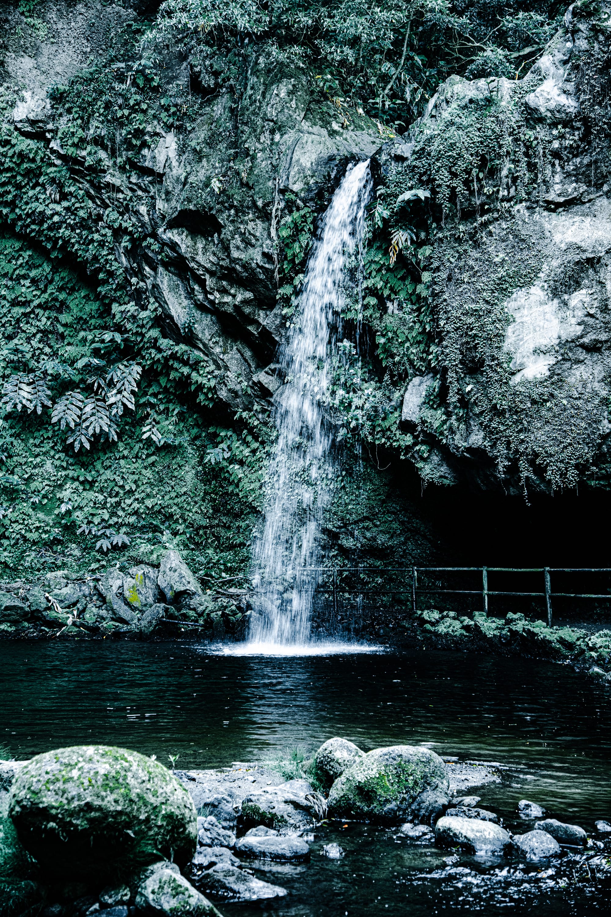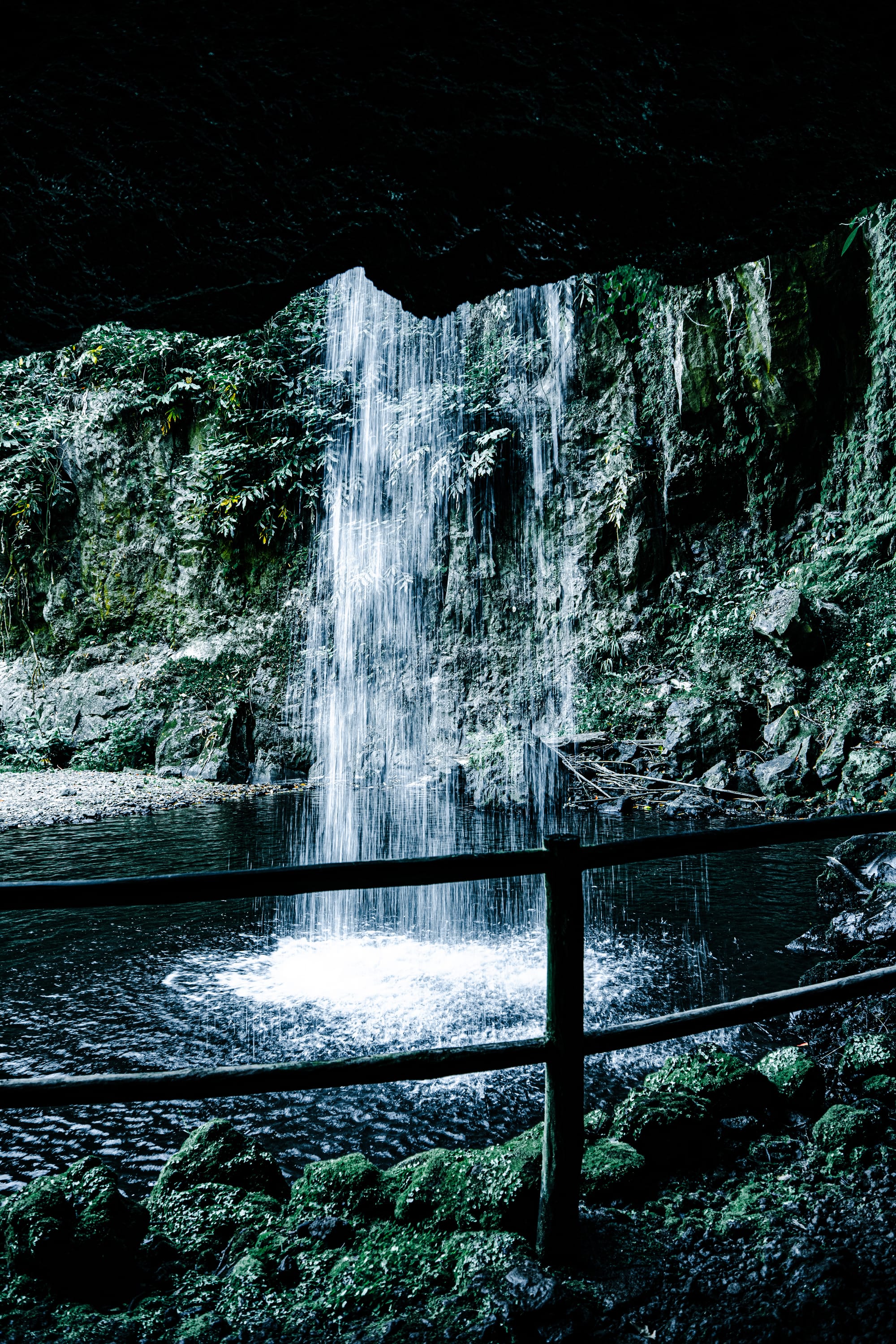 Each waterfall has its own mood. Some cascade narrowly over black volcanic rock, like veins of silver. Others plunge in wide white fans into shaded pools. At many of them, you’ll find wooden bridges, benches, or mossy stone ruins to rest beside. One is framed by dense fern walls; another falls just beyond a narrow tree tunnel.