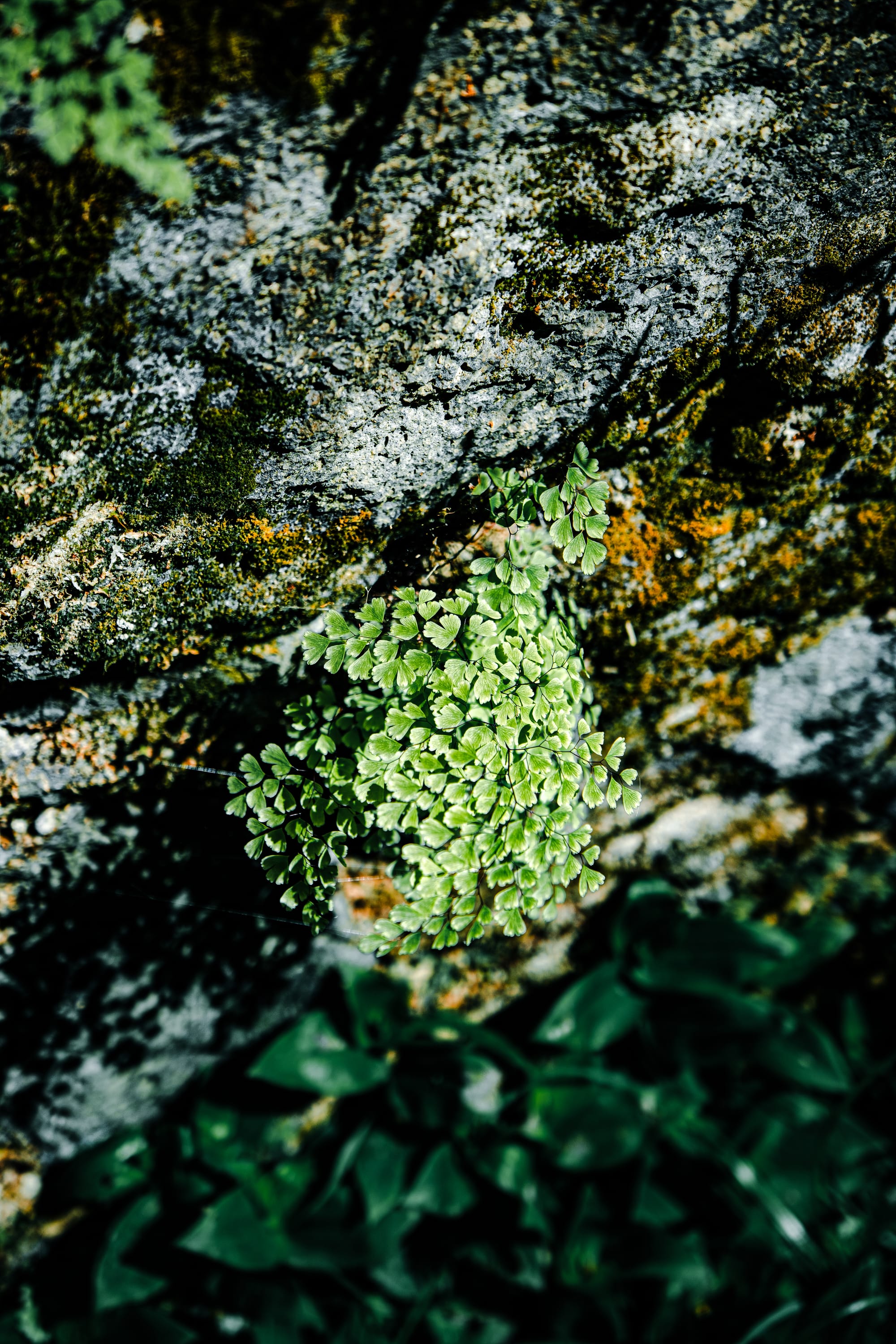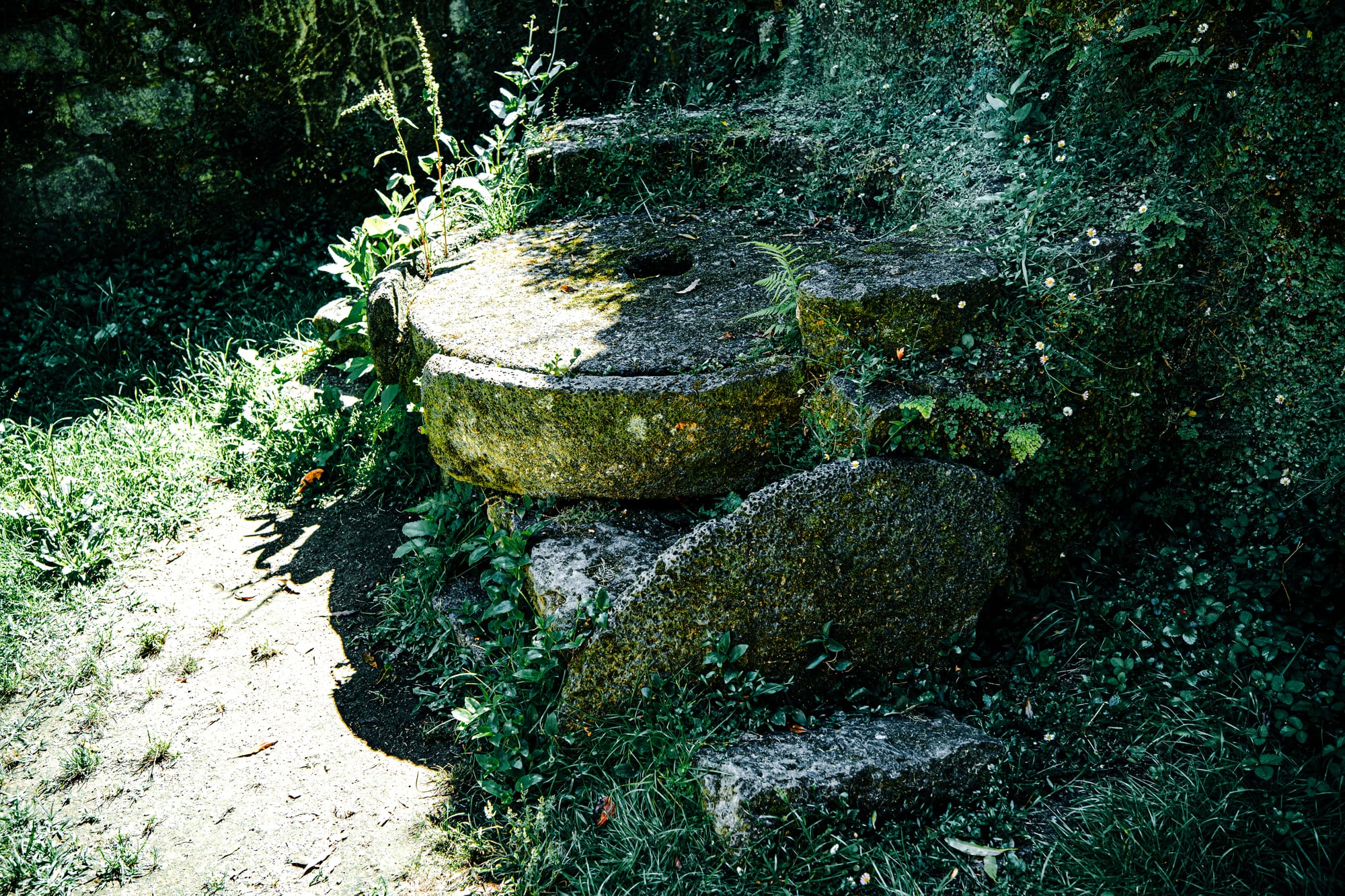 Stone mill remnants and wall flora along the trail