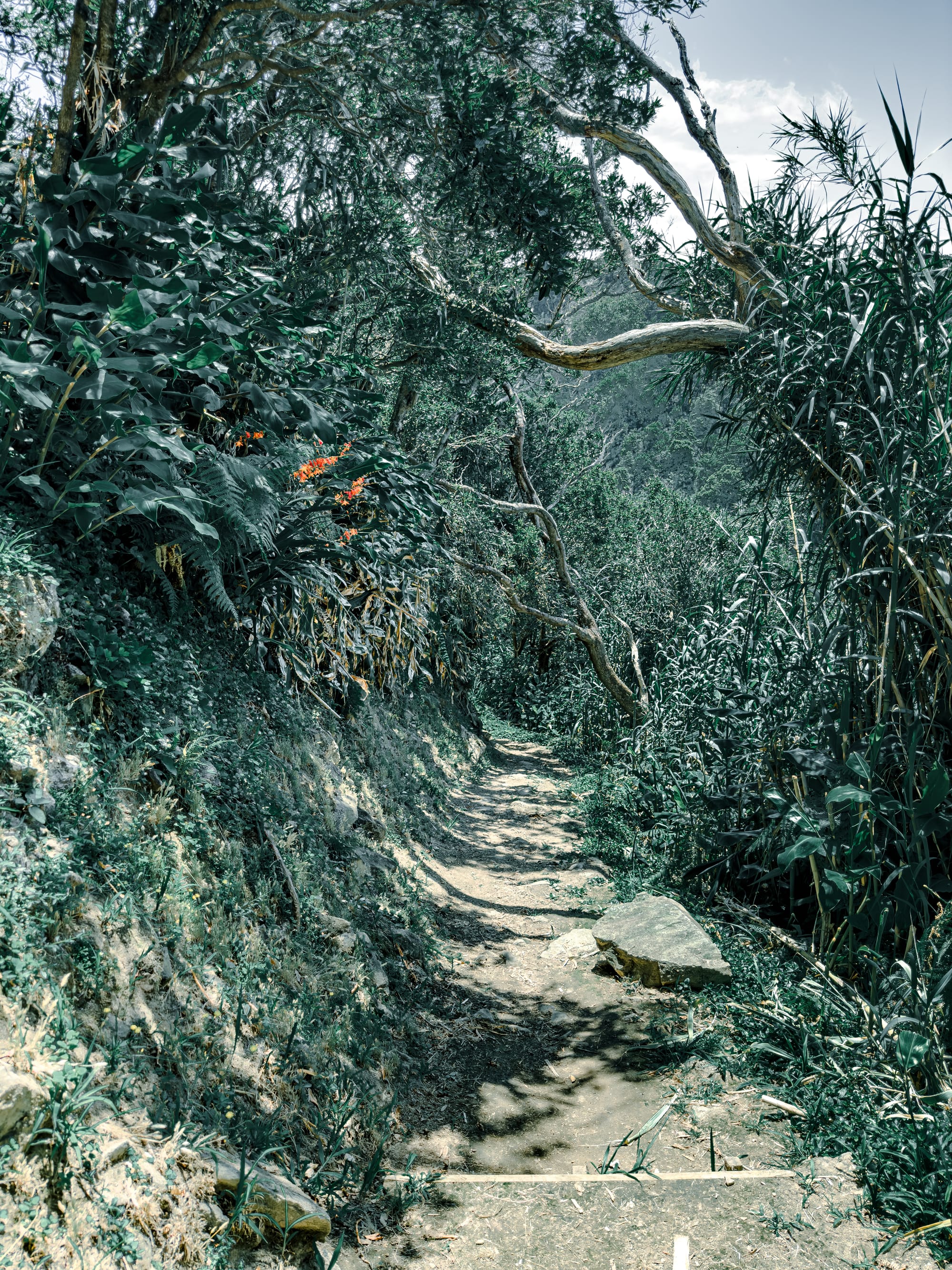 Dense ginger plants and tangled tree canopy surround sections of the trail with immersive shade and filtered light