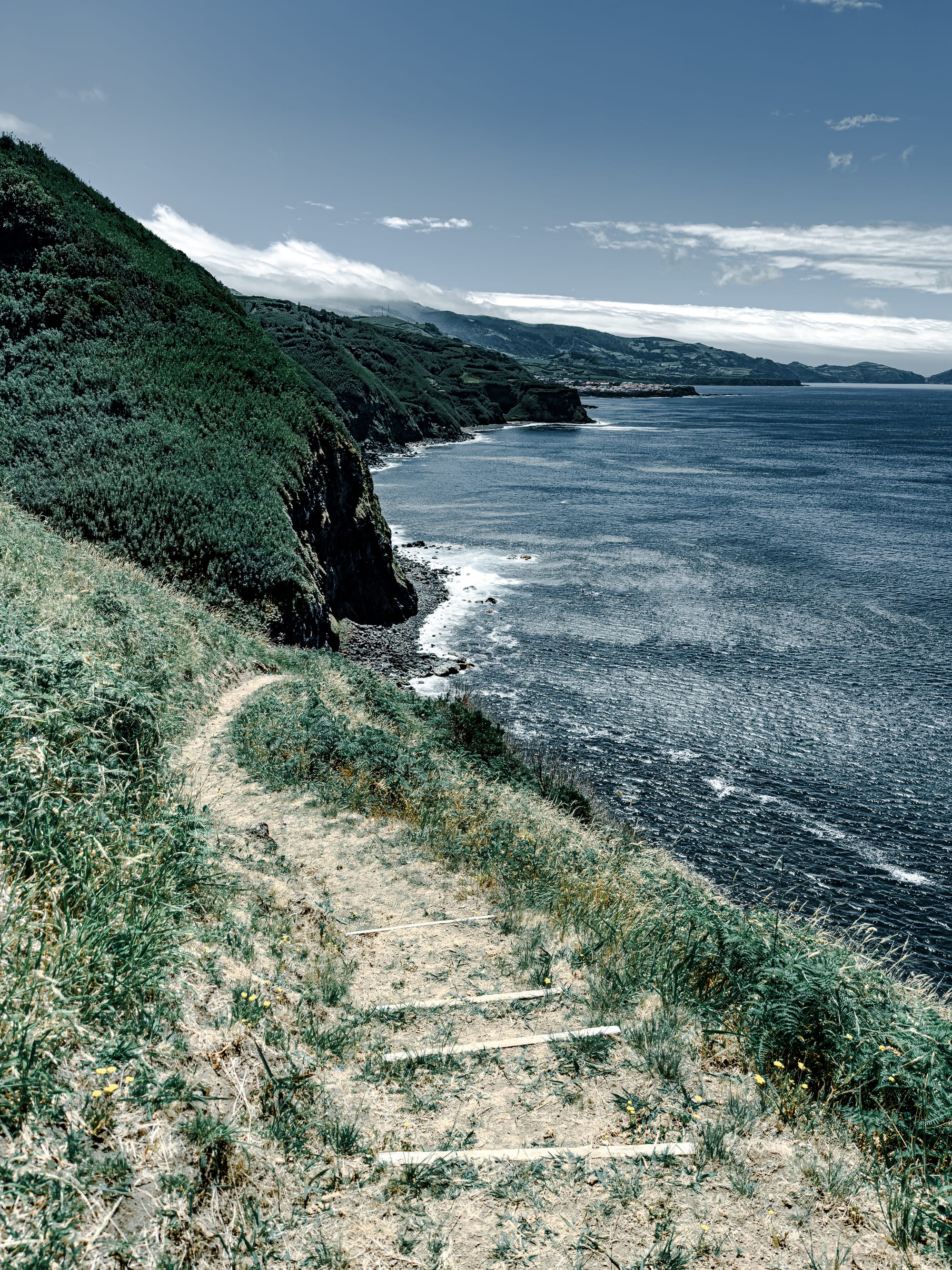 This is where the trail becomes cinematic. A few stretches quite literally look like you're walking a stairway to the sky—a dirt path fading into the Atlantic horizon, with nothing but blue in front of you.