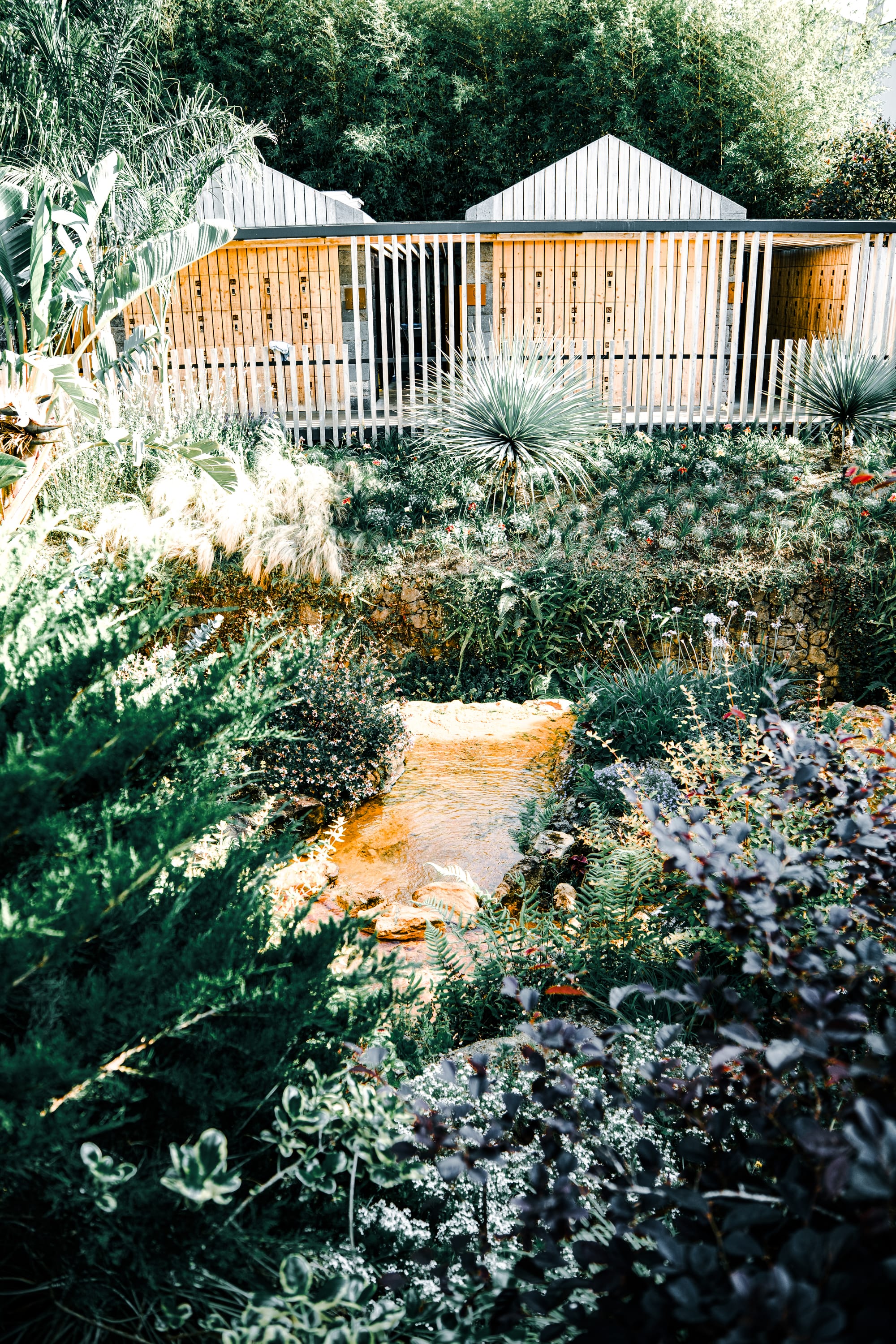 A stream of ochre-colored water snakes through the site, trickling past flower beds, moss-covered stairs, and tropical plants.