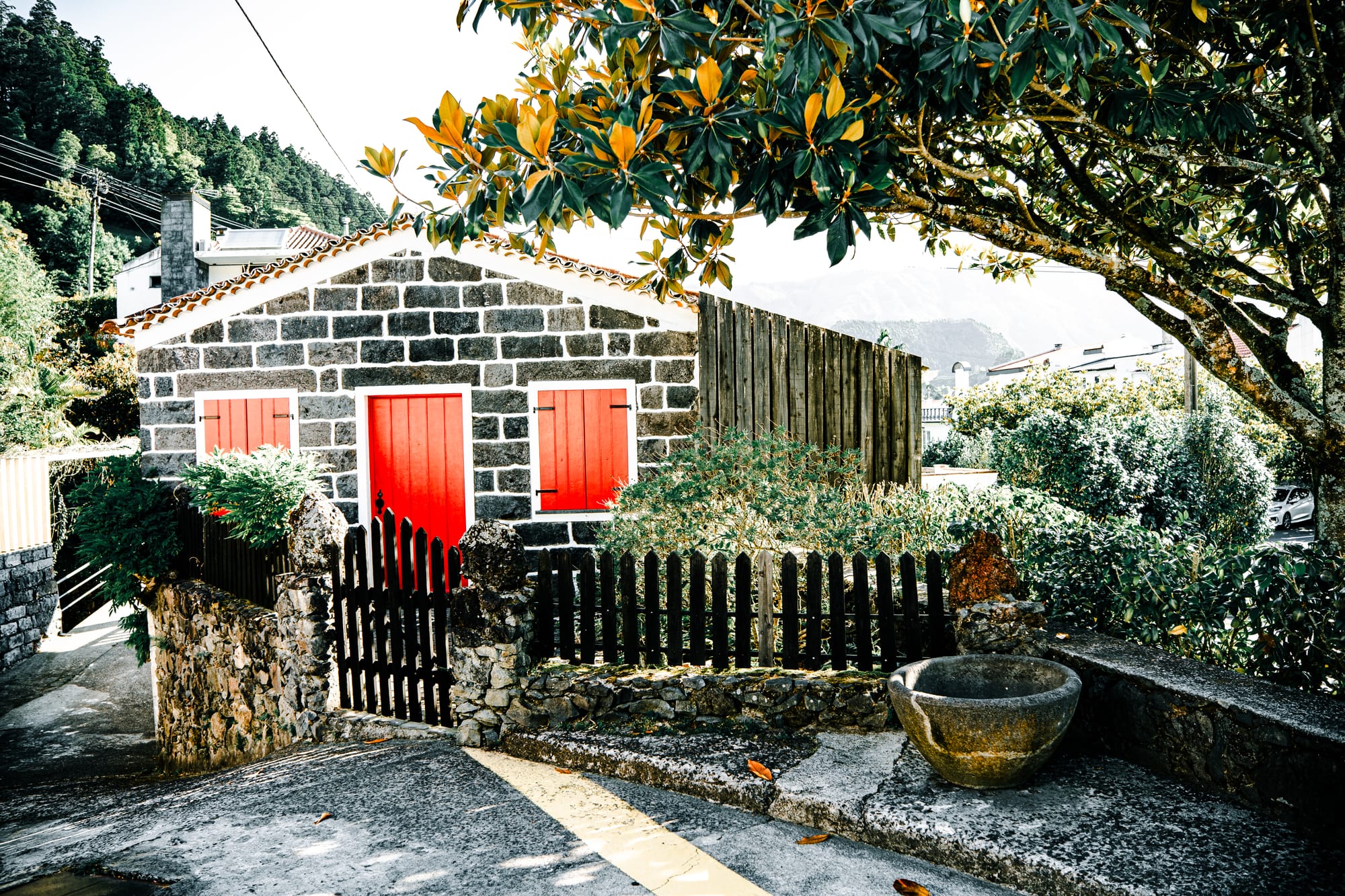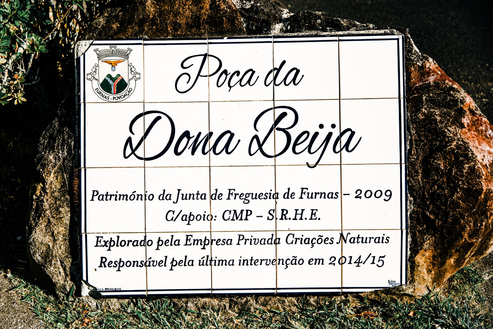 Entrance signage and a nearby basalt-stone house mark Poça da Dona Beija’s village setting