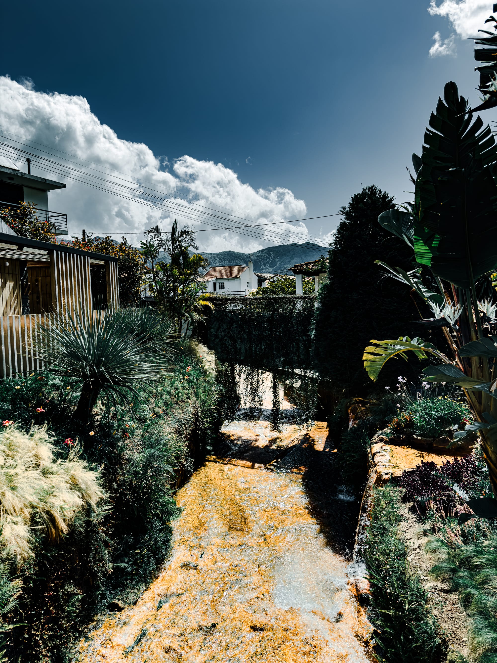 Framed by lush, tropical vegetation and flowing streams of ochre-orange water, the site feels like a cultivated pocket of warmth and rest, suspended in time.