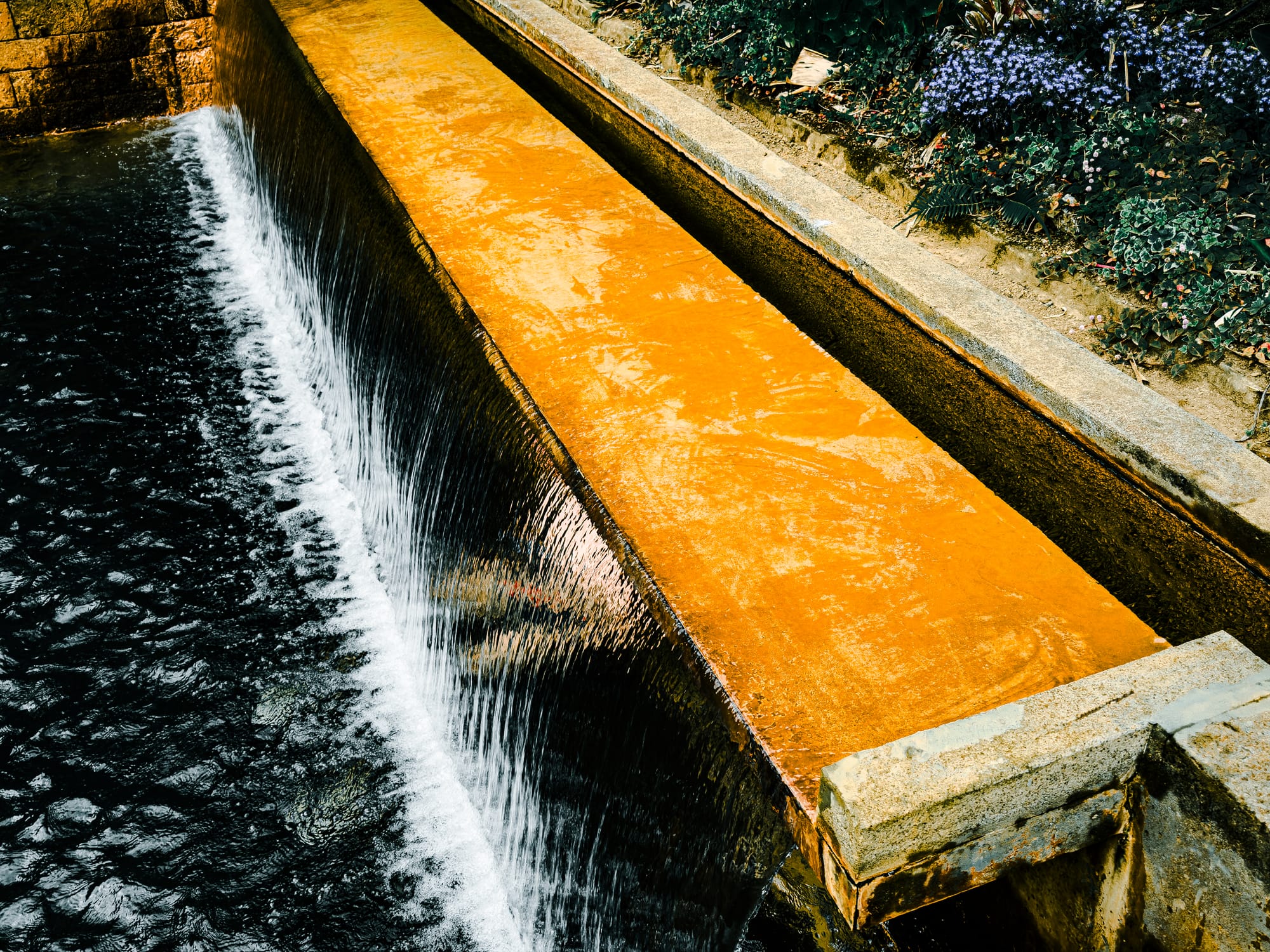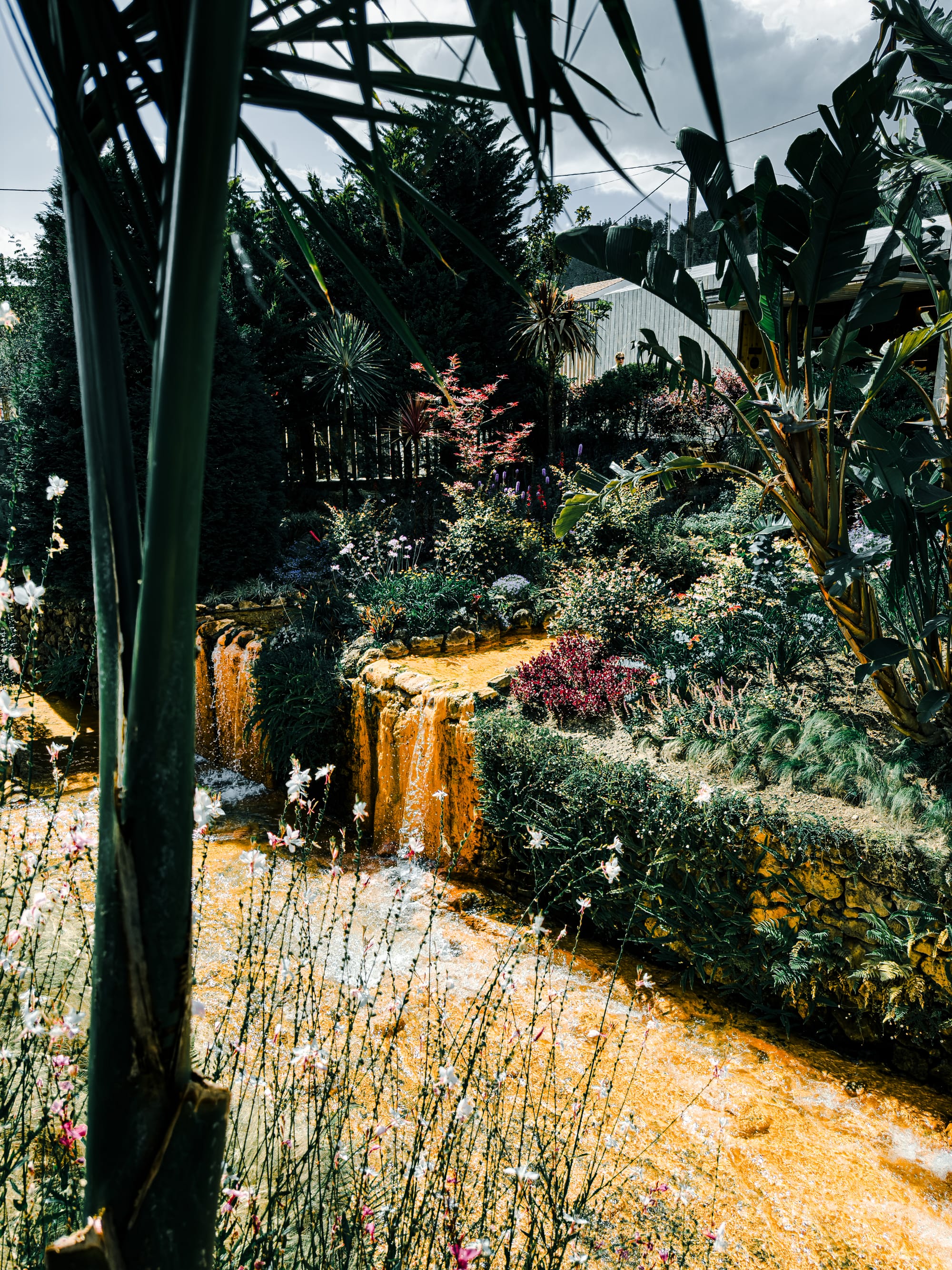A stream of ochre-colored water snakes through the site, trickling past flower beds, moss-covered stairs, and tropical plants.
