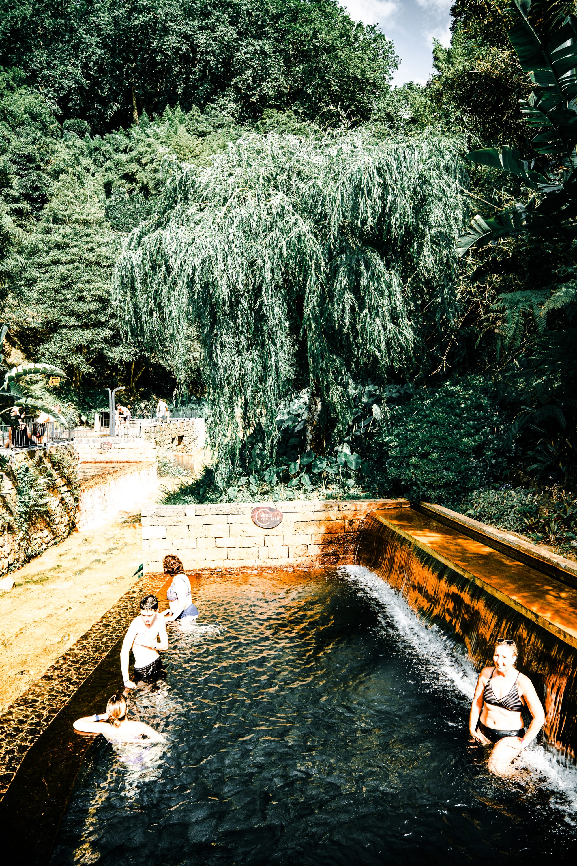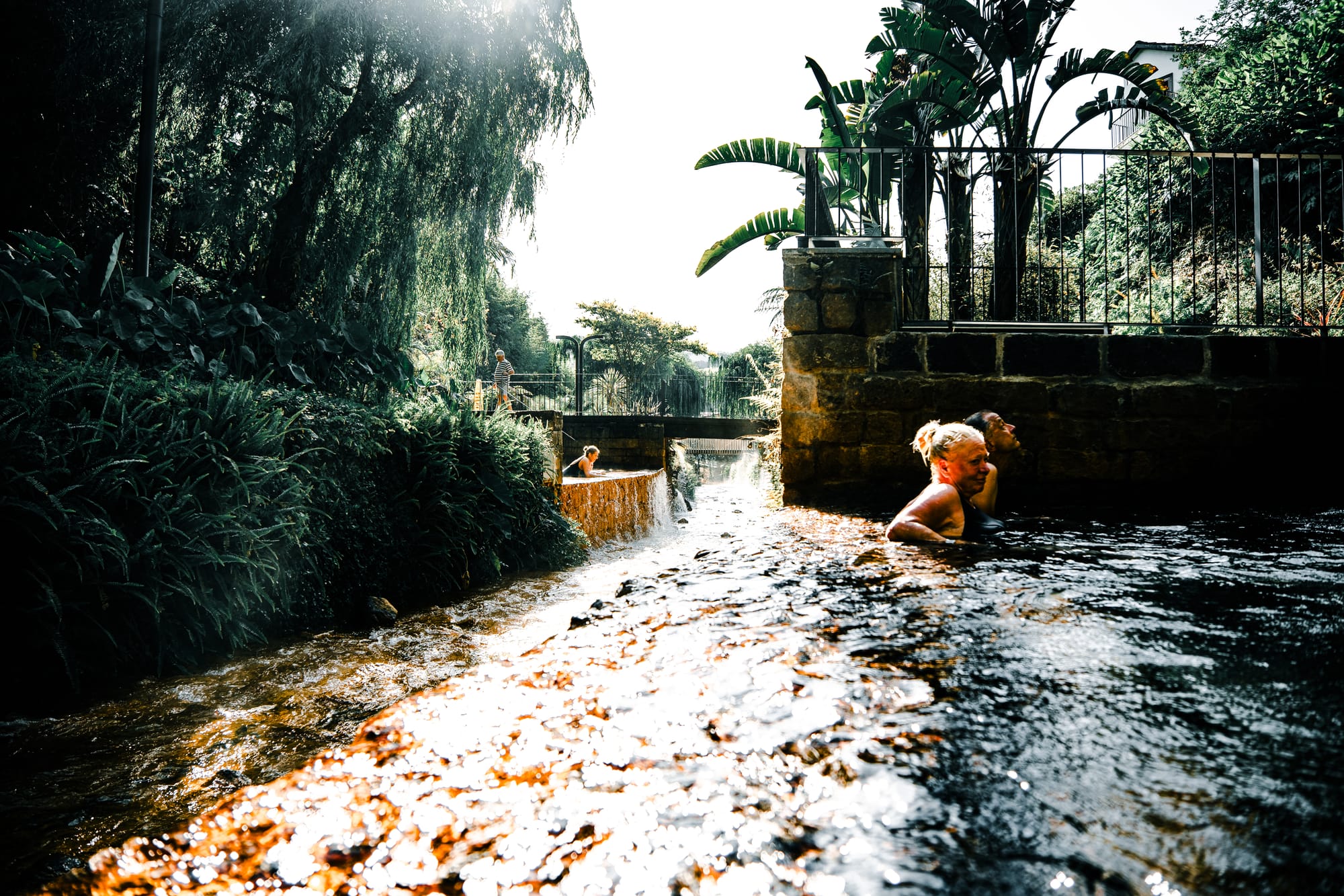 Poça da Dona Beija is made up of five open-air pools, each built from carved stone and fed by steady flows of thermal spring water. The water glows a deep amber from its high iron content, its warmth enveloping you instantly on entry. The surfaces of the pools are smooth and slightly slippery with natural minerals; red sediment clings to the stone walls and gathers between the toes.