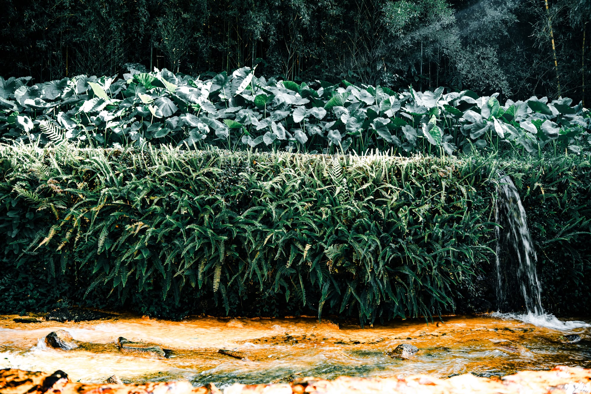 Hot spring runoff flows beside a riot of unusual tropical flora including white bird of paradise and bottlebrush blooms