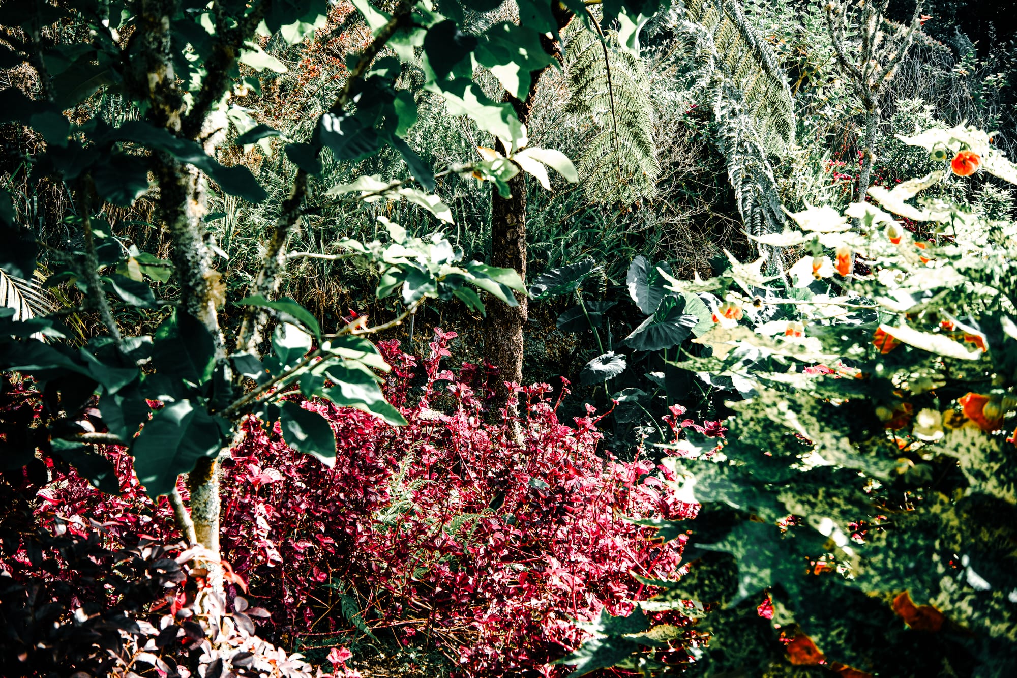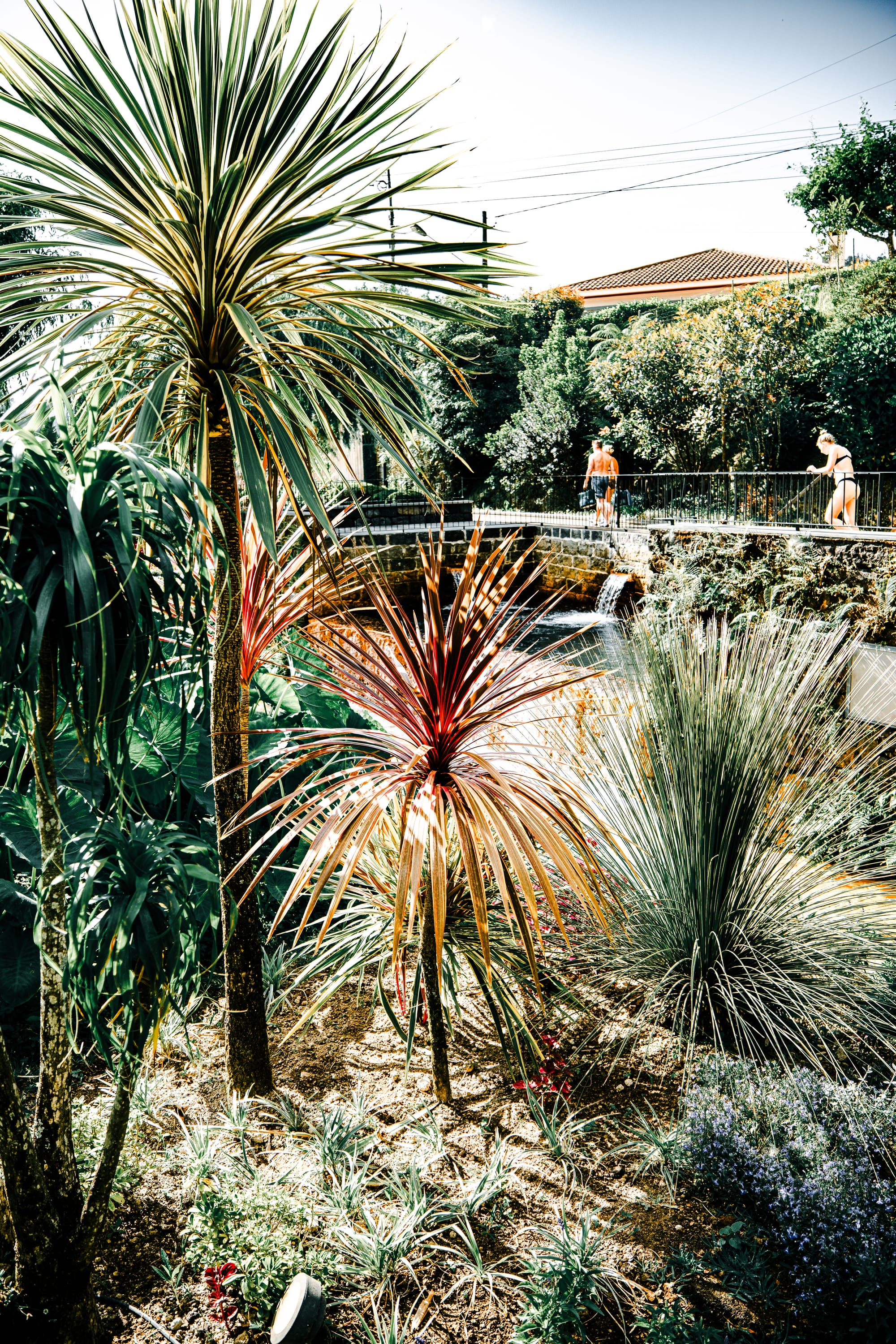 What makes Poça da Dona Beija especially striking is not just the pools, but the environment that cradles them. Bottlebrush plants with crimson spikes lean over the pathways. White birds of paradise bloom in sculptural clusters—rare cousins to the orange variety—with pale petals and blue tongues. Bursts of chartreuse ferns and soft, sage-colored moss line the edges of walkways. Taro leaves, large and waxy, ripple in the breeze, their stems dipping into thermal streams.