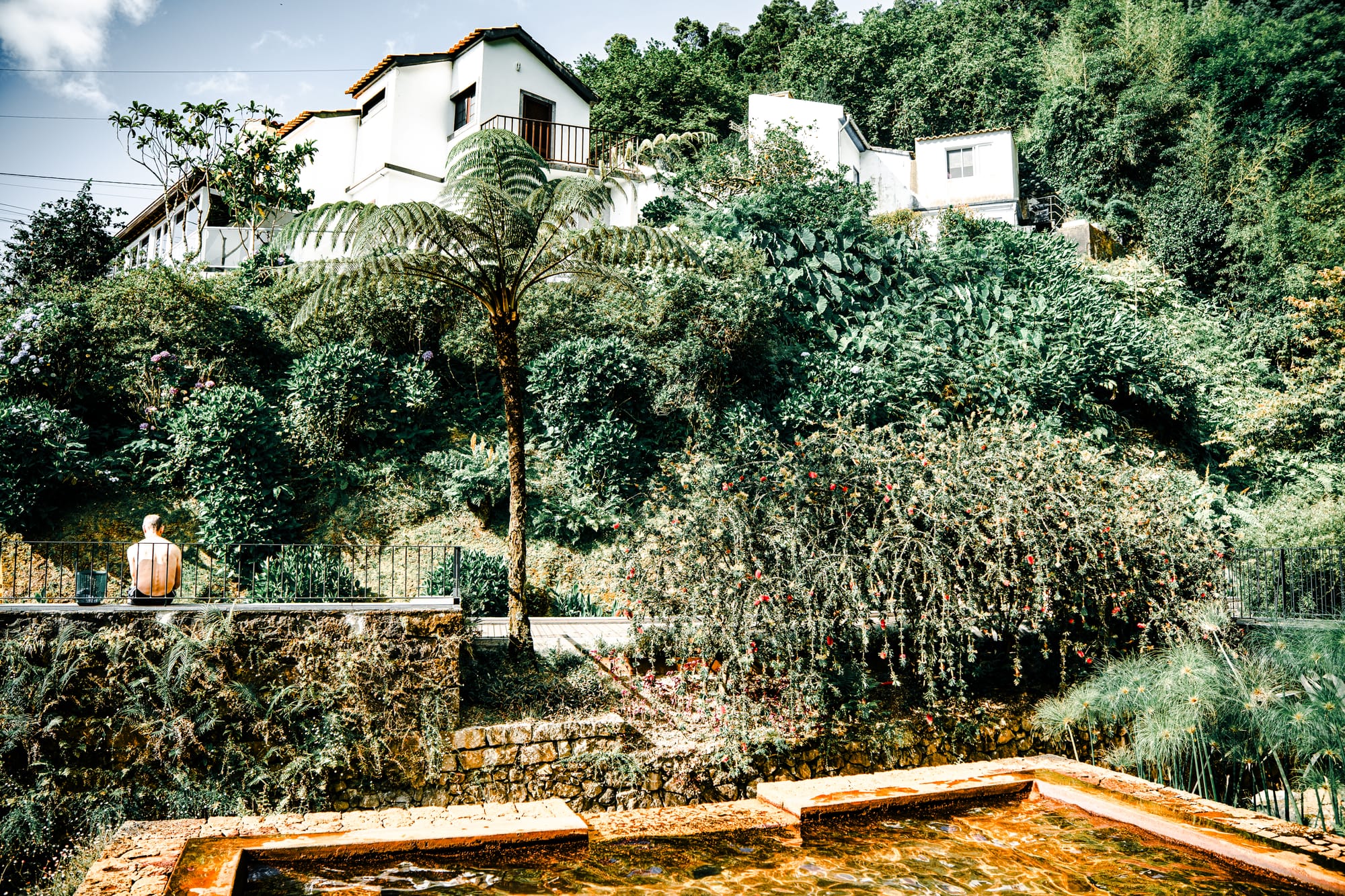 Golden waters, stone pools, and tropical plants at Poça da Dona Beija thermal springs
