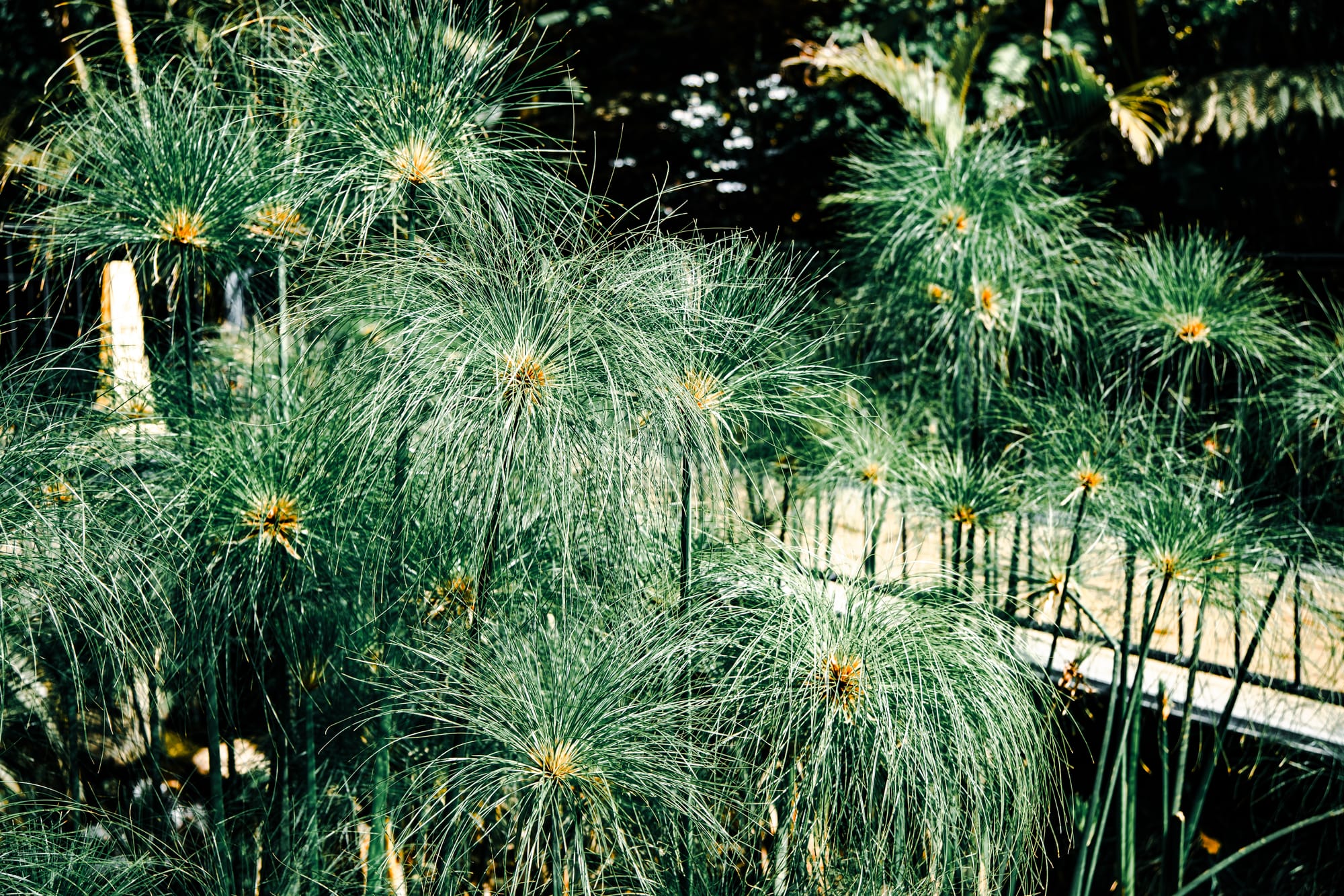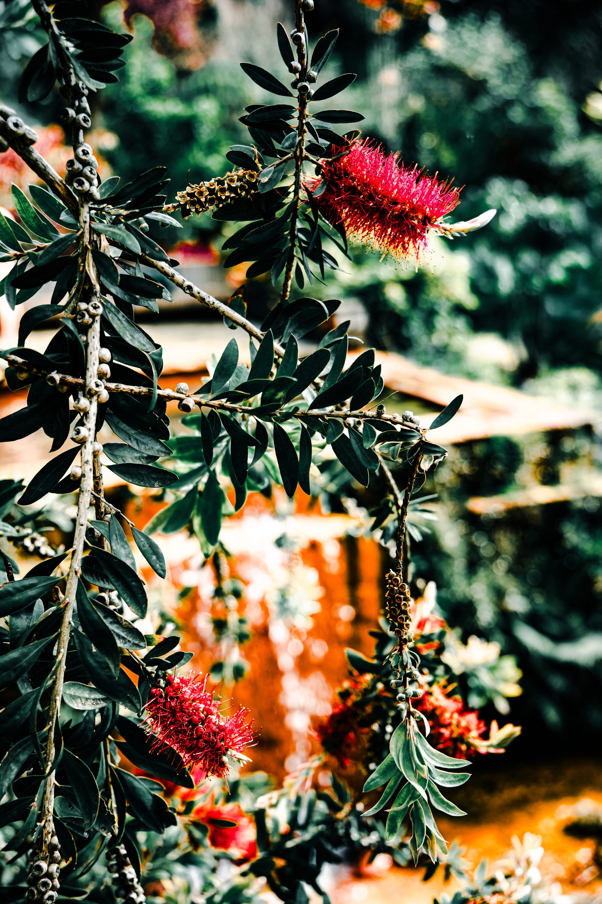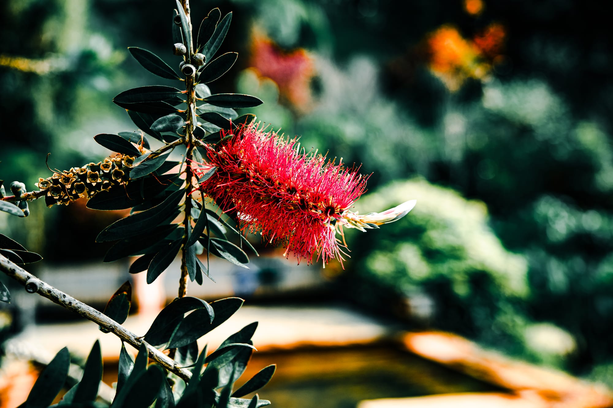 Flora at Poça da Dona Beija includes bottlebrush, papyrus, white birds of paradise, and poppies