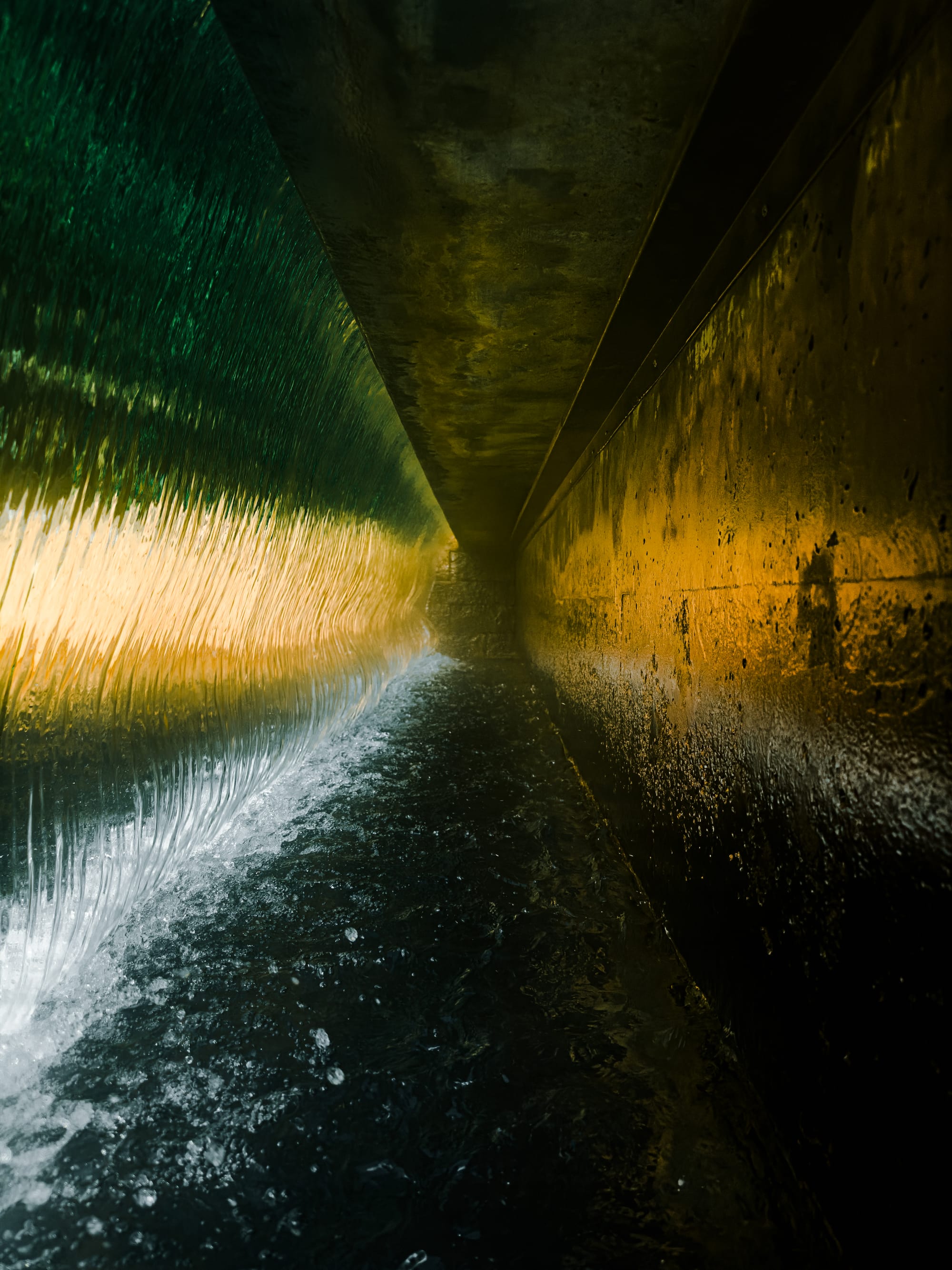One of the most popular features is a shallow stone corridor that culminates in a long, horizontal waterfall. Visitors often sit behind it, letting the hotter water steam their face and chest—creating a makeshift sauna, quiet and immersive.