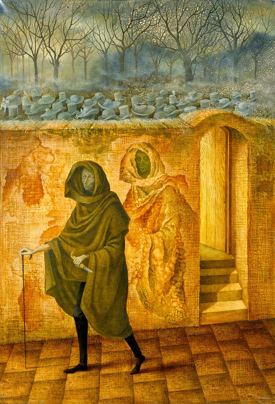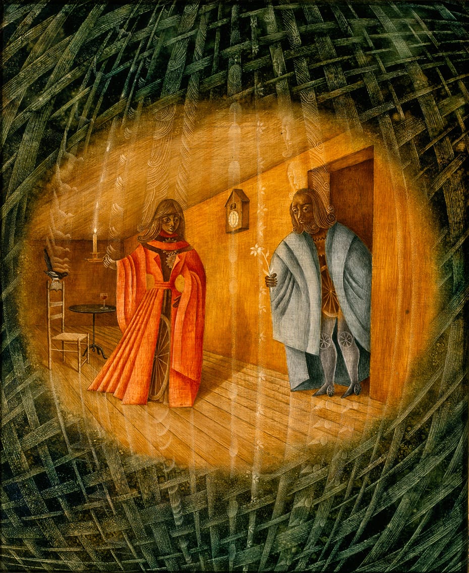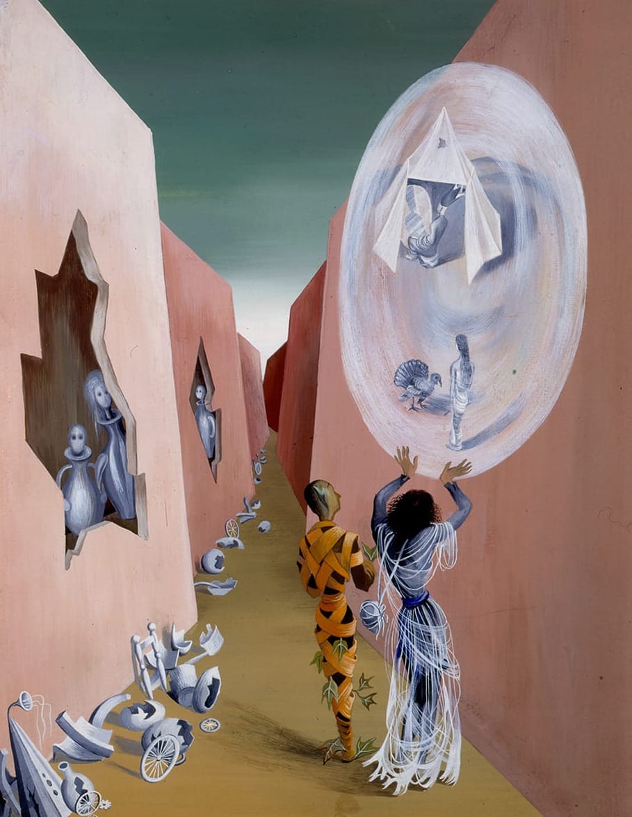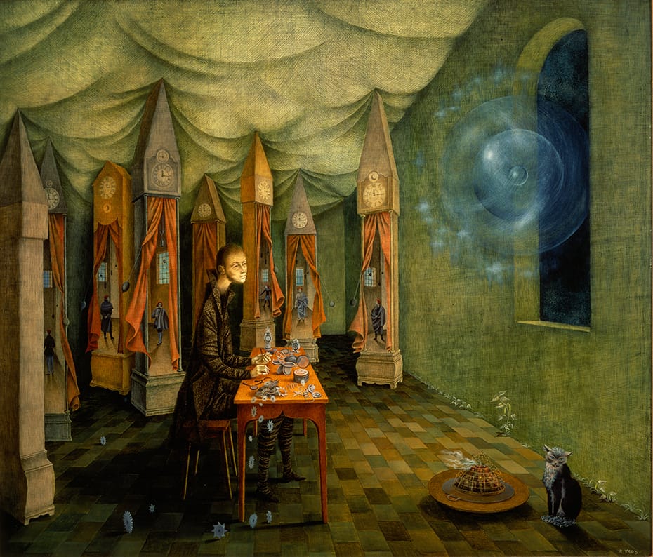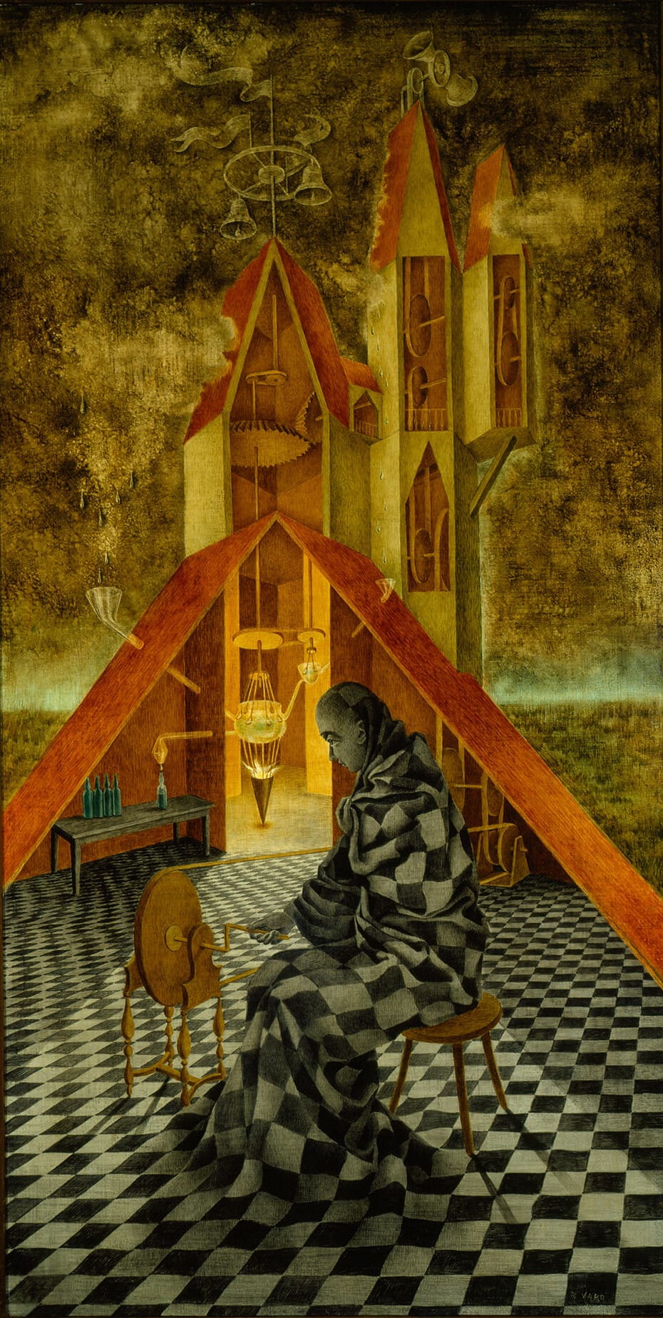 In Mexico, Varo’s work deepened into a distinct visual language. It moved beyond orthodox surrealism’s fixation on the unconscious and instead constructed intricate inner worlds governed by their own logics. Her paintings often depict solitary figures: alchemists, travelers, and inventors, engaged in quiet, ritualistic processes such as distilling light, weaving time, and navigating labyrinthine architectures. These are not dreamscapes in the passive sense. They are active systems, worlds in which knowledge is sought, transformed, and embodied.