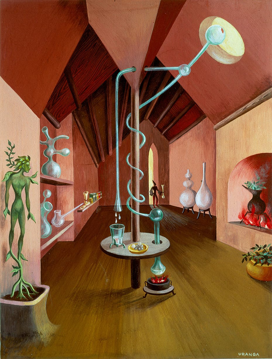 Varo’s compositions unfold like diagrams of inner work. Delicate lines, elongated forms, and muted, earthy palettes create environments that feel both medieval and futuristic. Monastic laboratories. Cosmic vessels. Rooms that seem to breathe. Influenced by alchemy, Gurdjieff’s teachings, and various strands of occult philosophy, her paintings propose a form of knowledge that is experiential rather than empirical, a way of knowing through transformation, solitude, and attention.