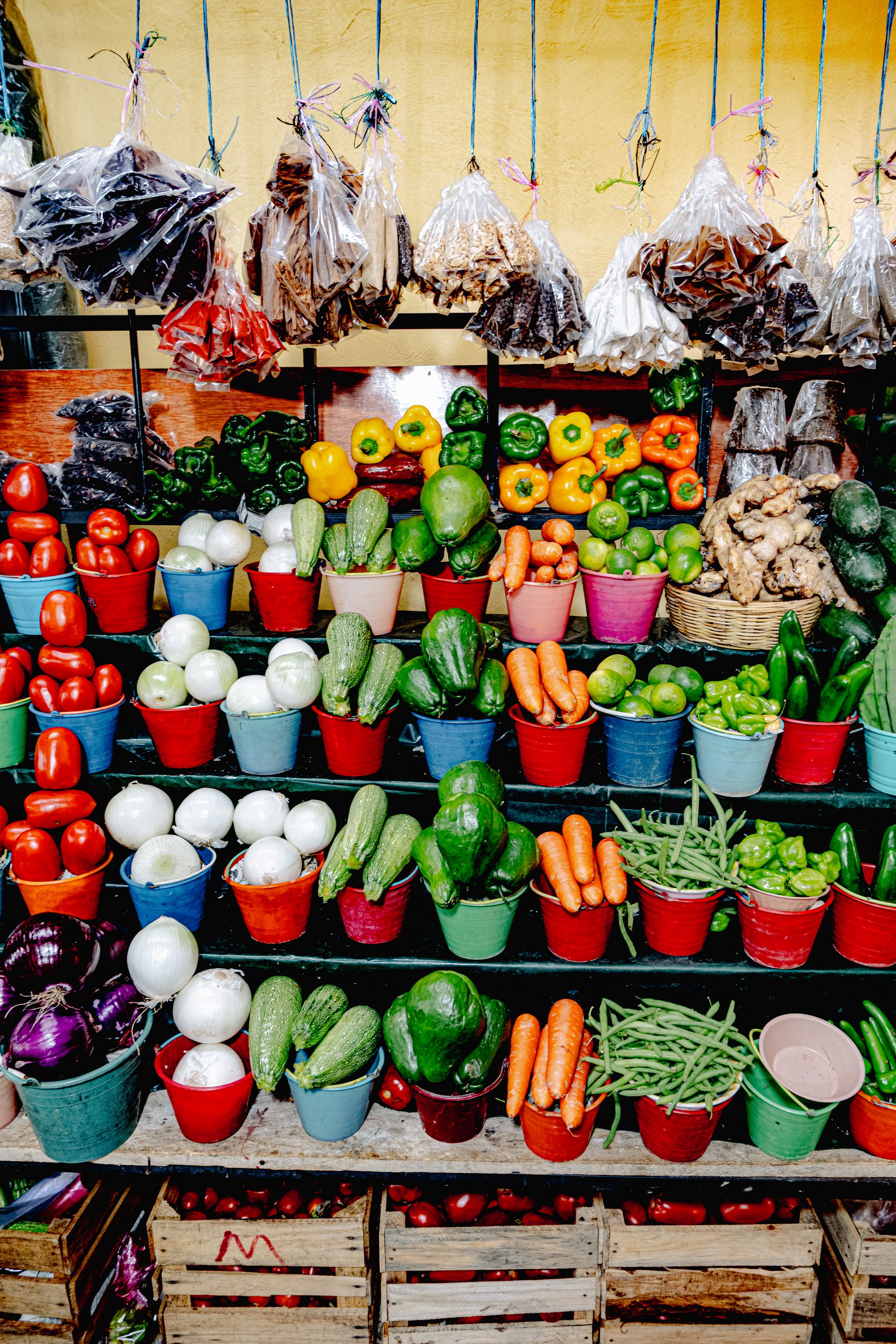 Colorful market produce and decorated church facade in Chamula