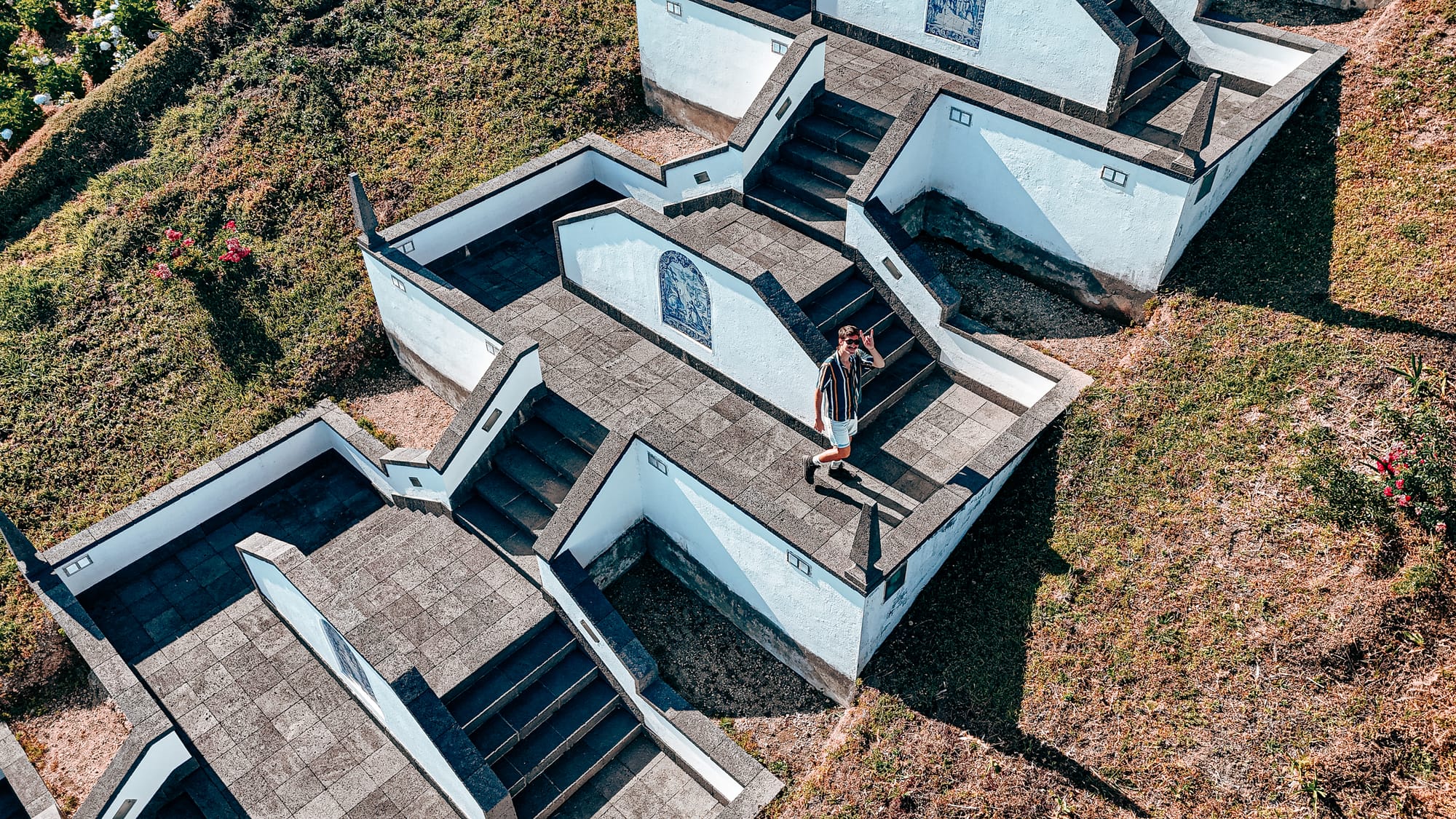 The dramatic zigzagging staircase to Santuário de Nossa Senhora da Paz, each landing marked by hand-painted blue tile panels