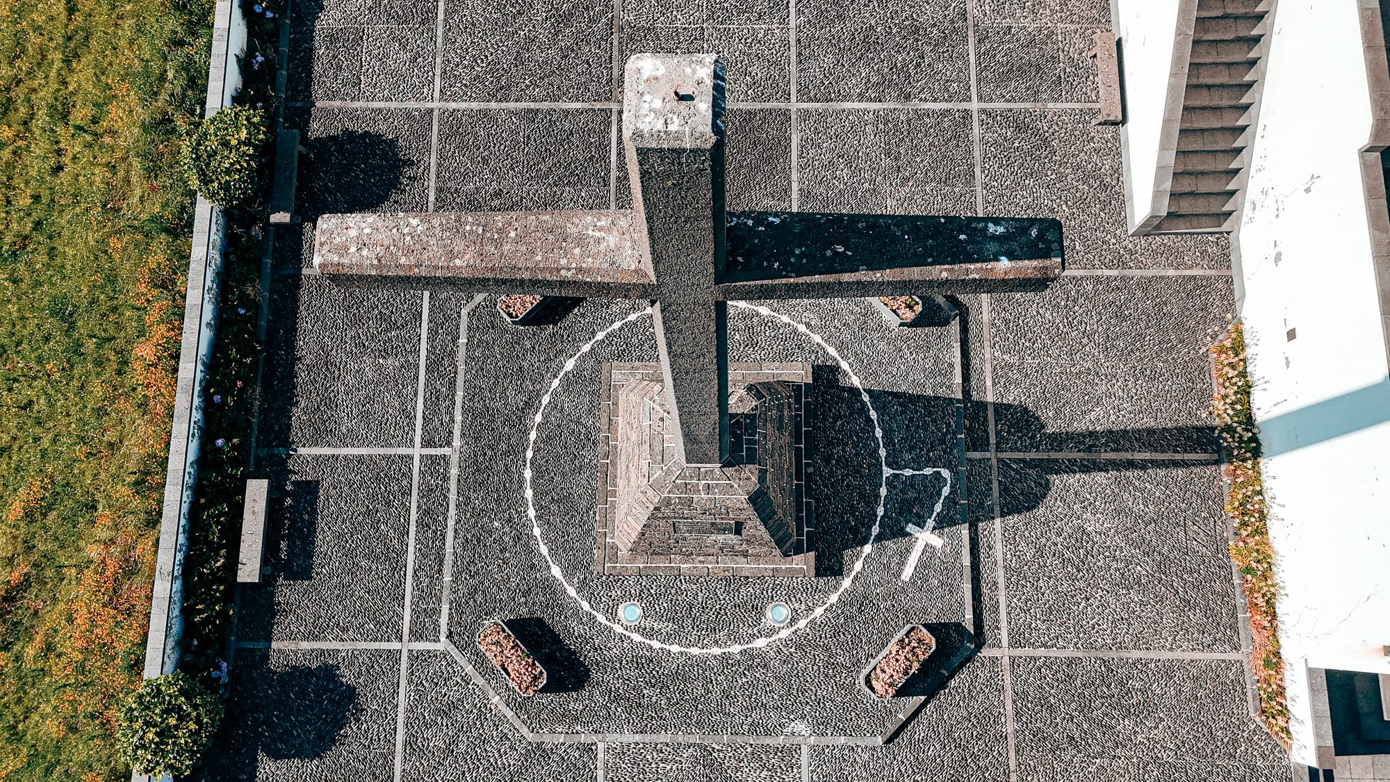 A striking cross casts its long shadow over the basalt-tiled forecourt of the sanctuary