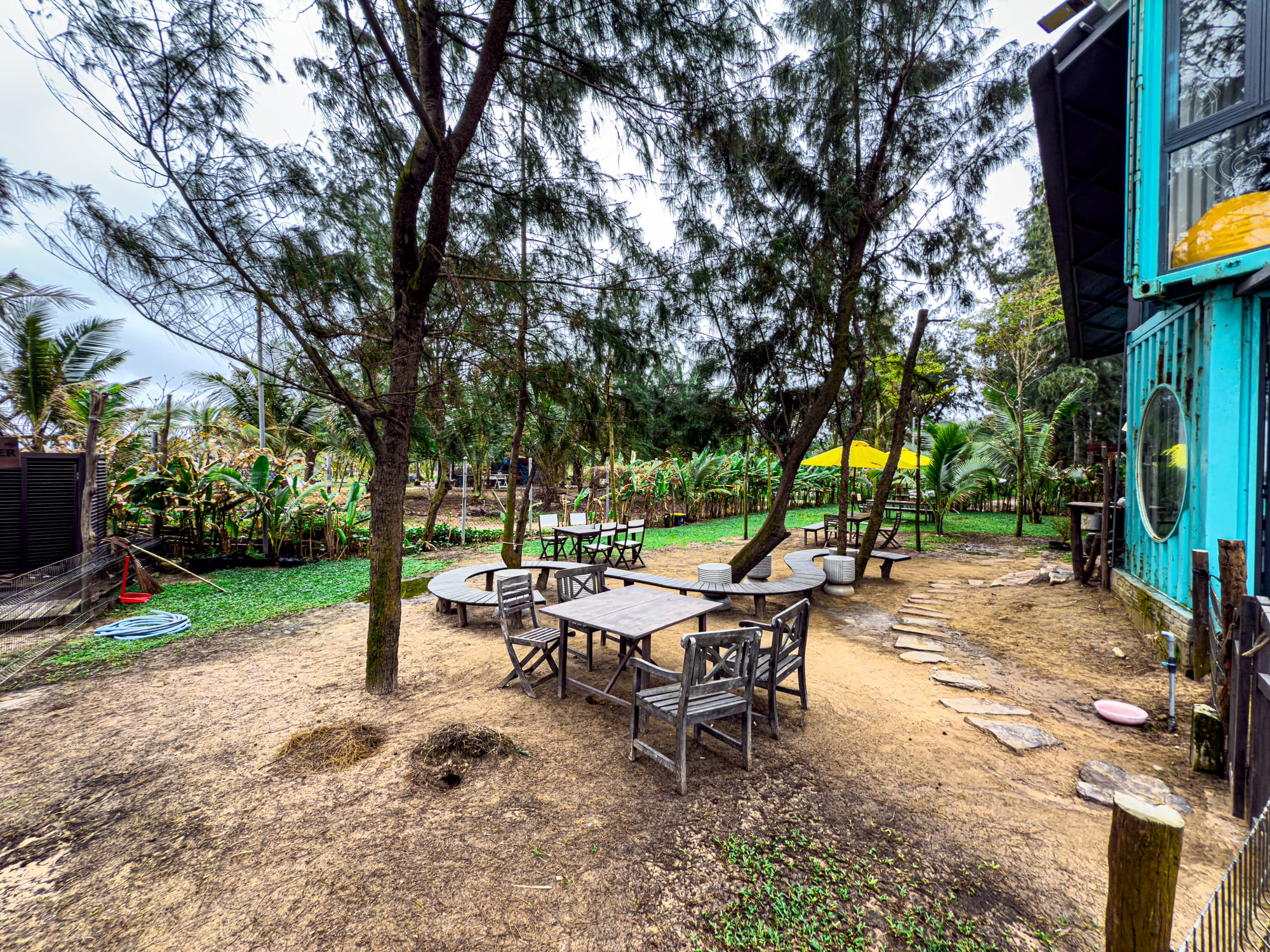 Outdoor seating and tree-shaded corners at Hít Hà Cafe in Hội An
