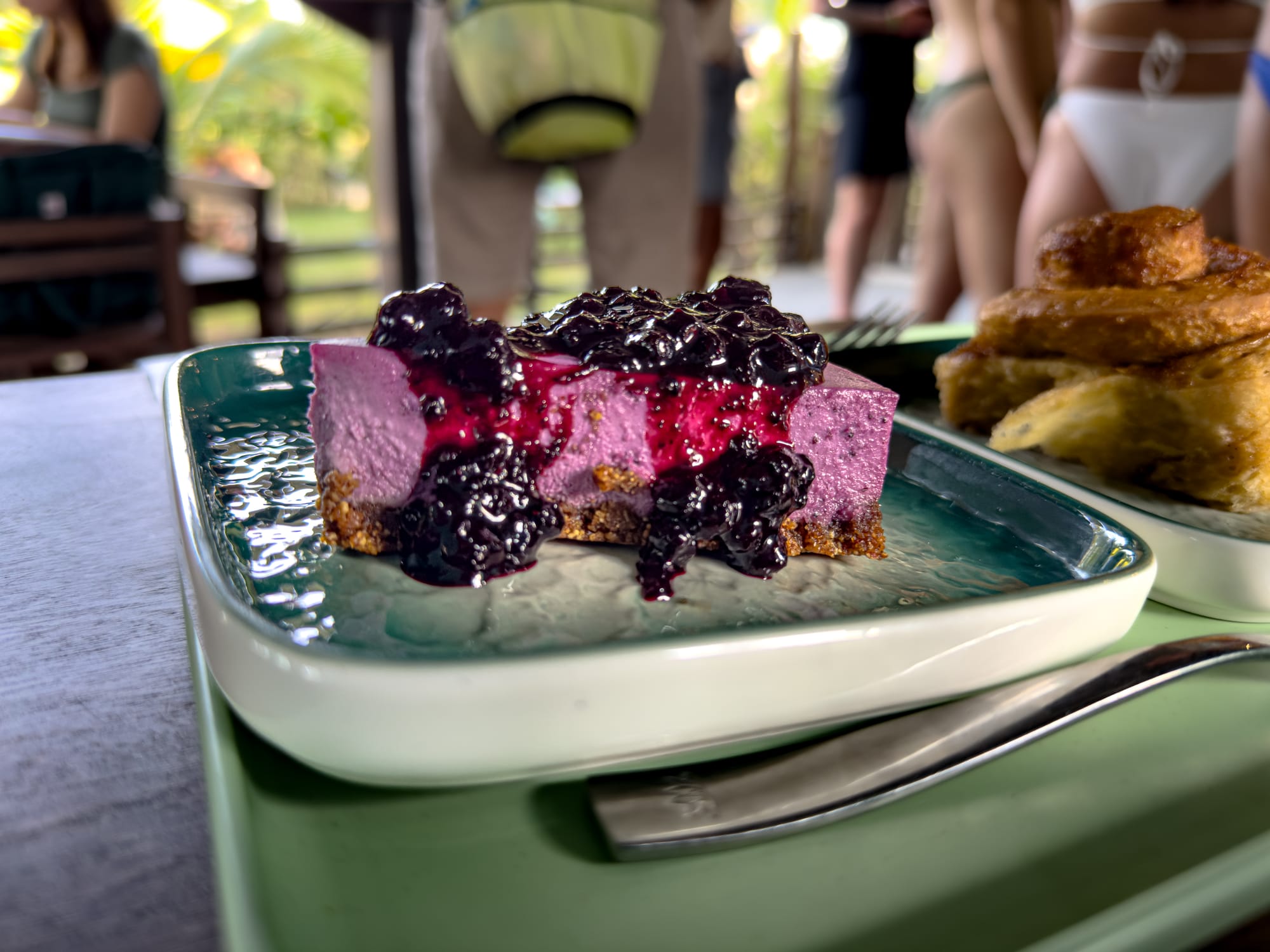 We tried a raw vegan cake—light, layered, and surprisingly decadent—and the vegan focaccia sandwich, which felt like the kind of hearty, simple meal you want after a swim.