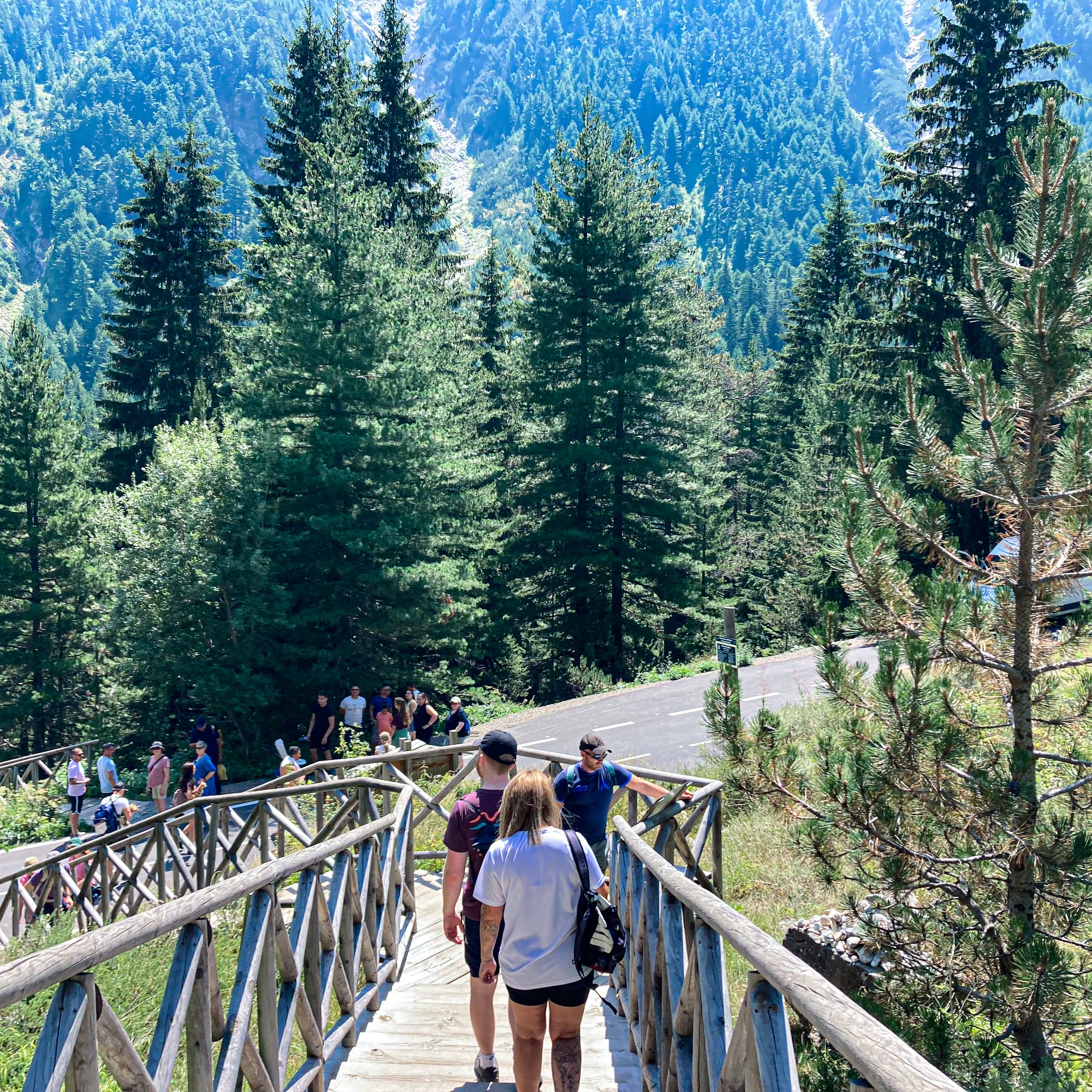 People walking down a wooden bridge surrounded by tall pine trees in the Pirin Mountains near Bansko, Bulgaria, on a bright summer day