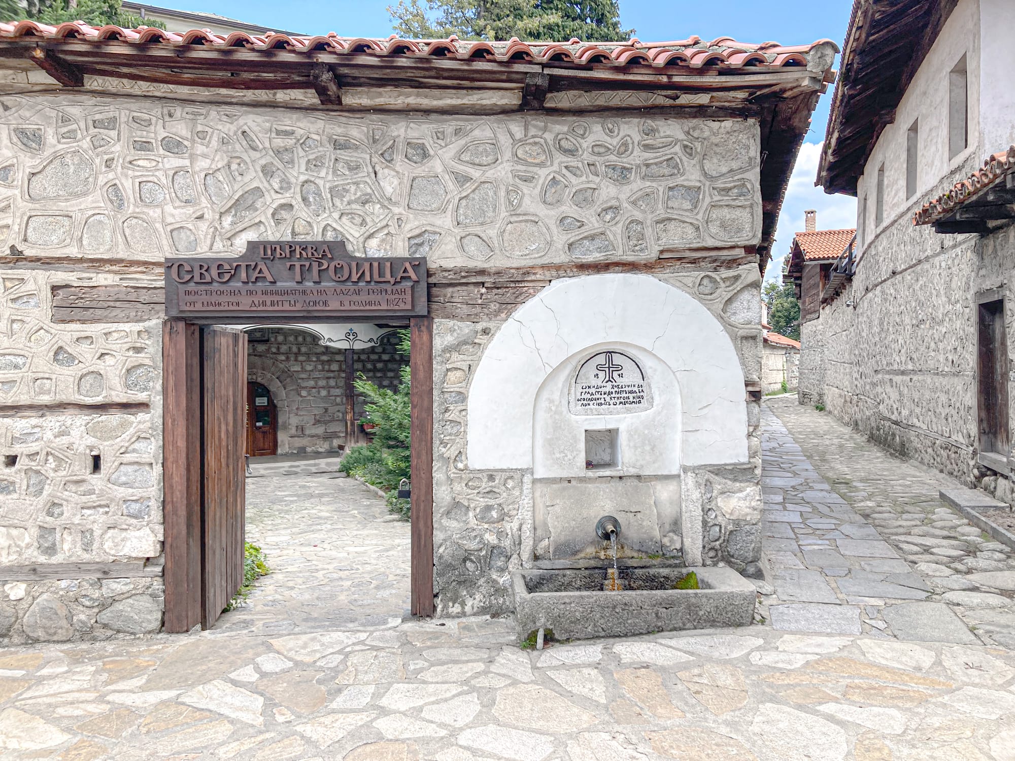A peaceful street in Bansko with a narrow stone water channel running through the center