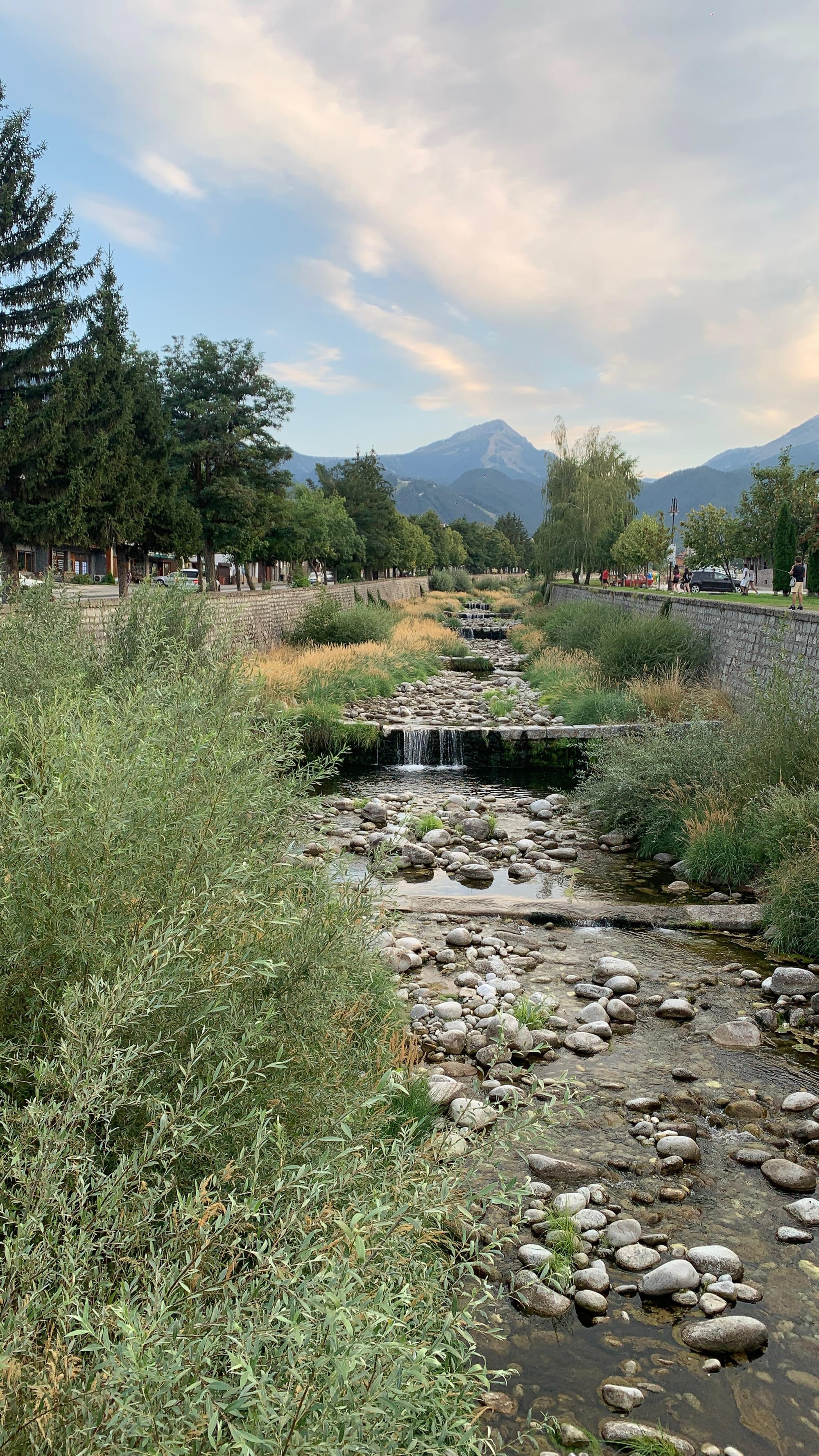 Narrow stone-lined water channel flowing through a quiet street in Bansko, with houses, greenery, and the Pirin Mountains in the background