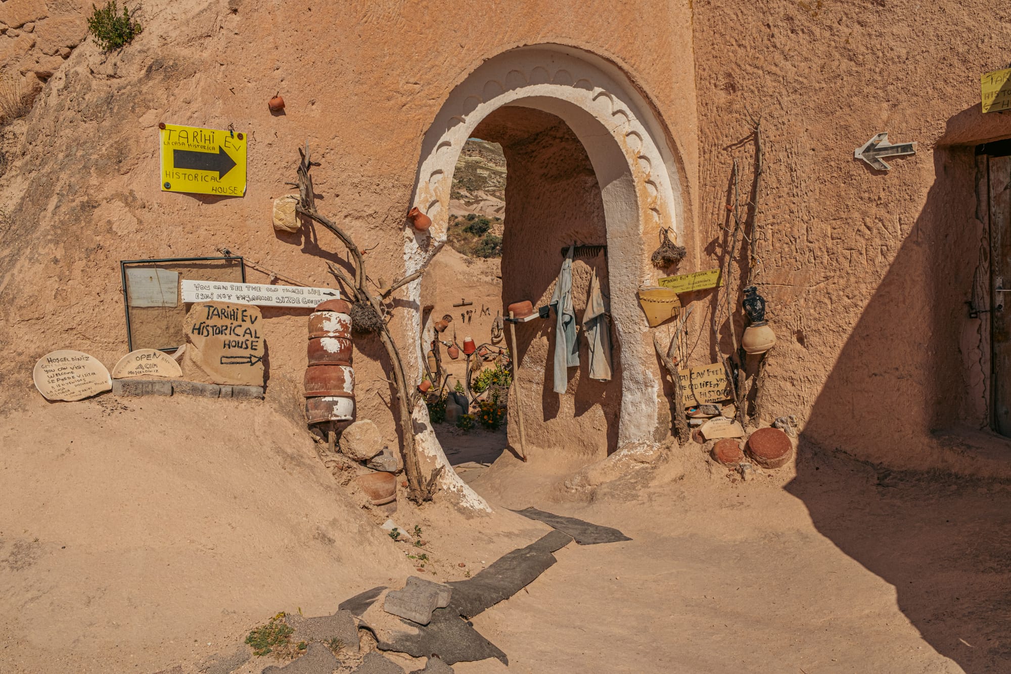 Arched entrance and a display of rustic clay vessels at Tarihi Ev Historical House