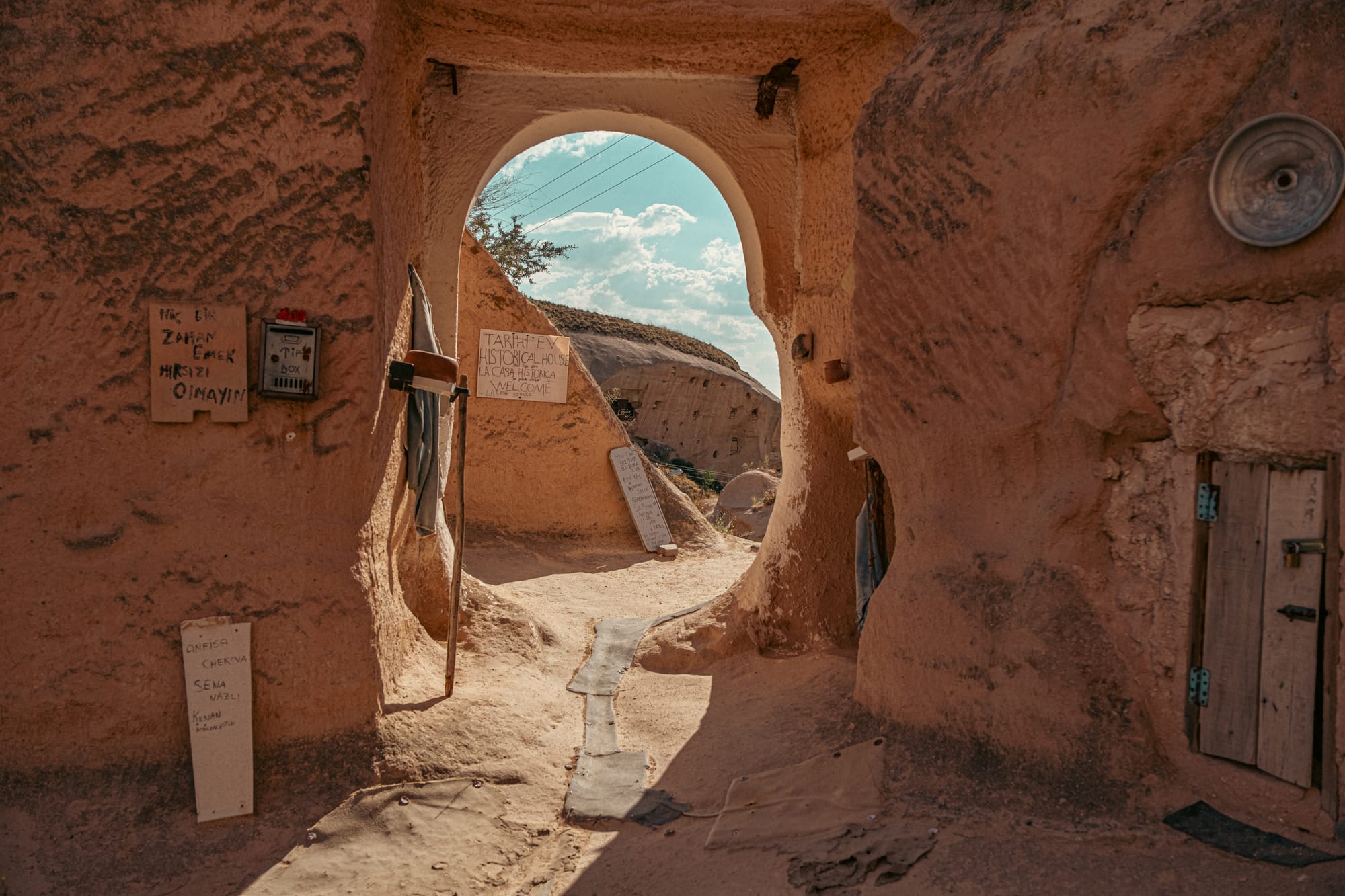 Entrance to Tarihi Ev Historical House, marked by rustic signs and weathered stone archways