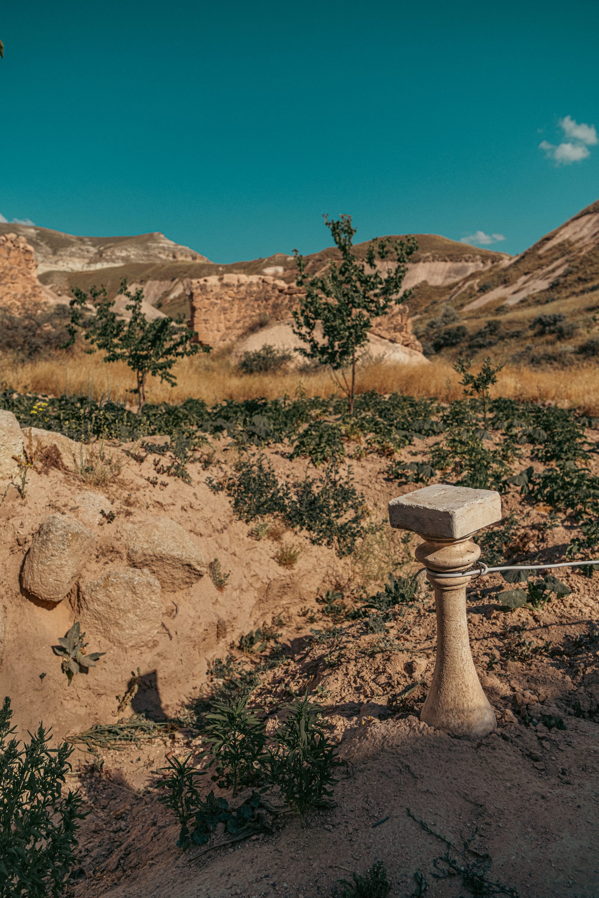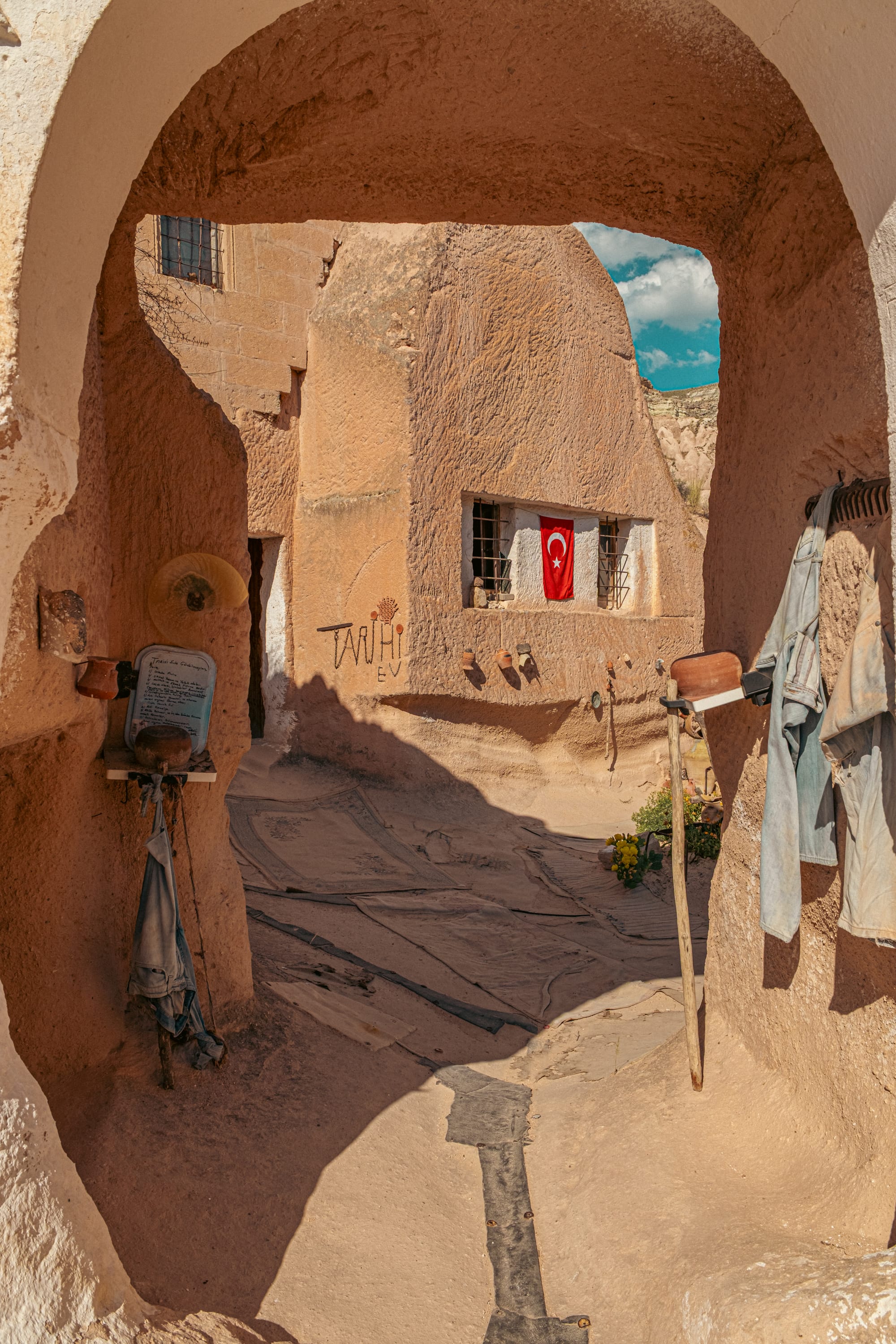 The village fades quickly into the raw forms of Cappadocia’s landscape: cliffs etched by erosion, ridges painted in shades of cream and rust, and distant slopes softened by time. Standing here feels like being on a threshold between the enclosed intimacy of the home and the vast openness beyond.