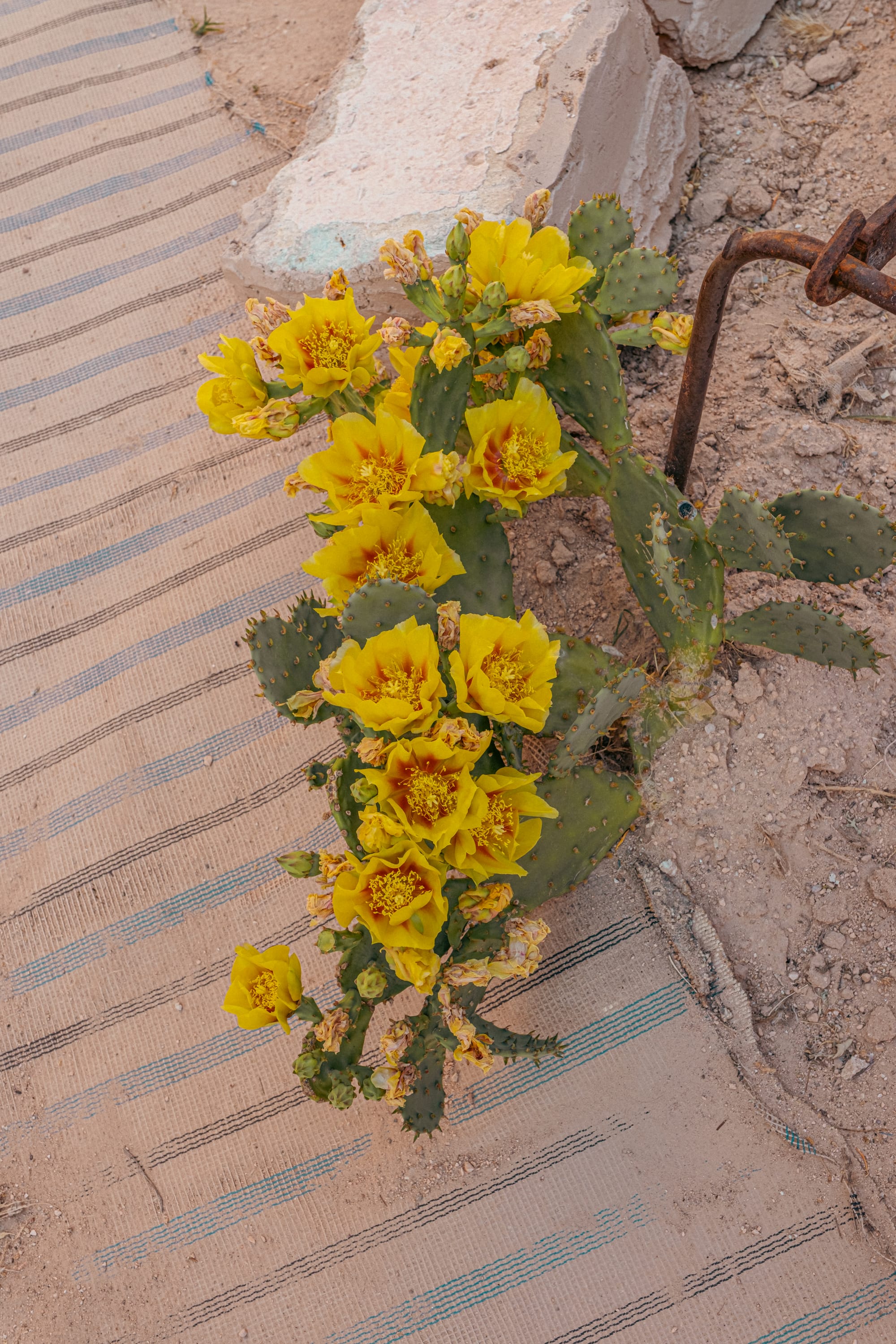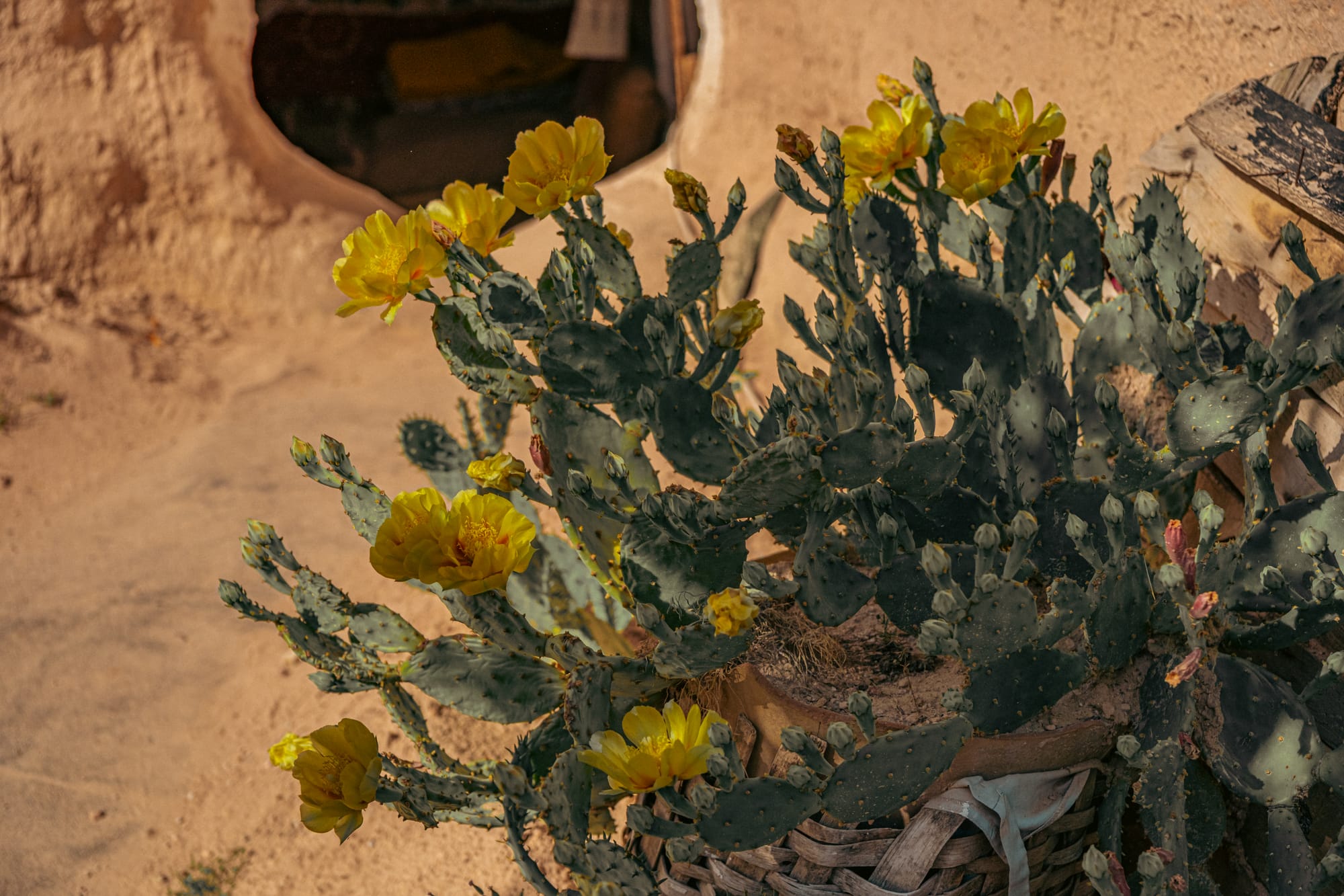 All the rooms face inward toward the courtyard, which blooms with life. Clusters of potted plants line the walls, and tall cactus plants crowned with vivid yellow flowers rise above them.