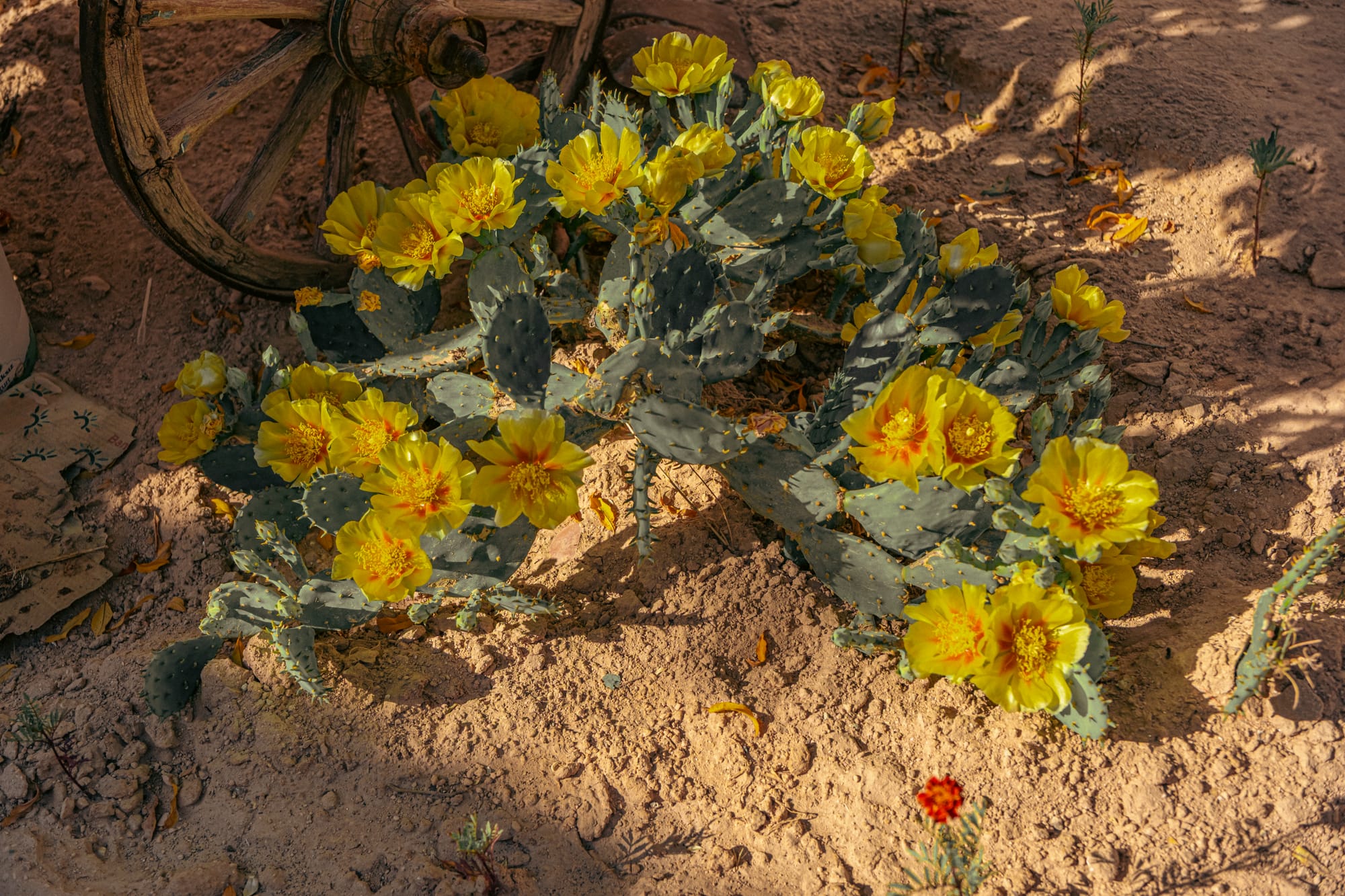 Vibrant yellow cactus blooms brighten the sunlit courtyard of Tarihi Ev Historical House