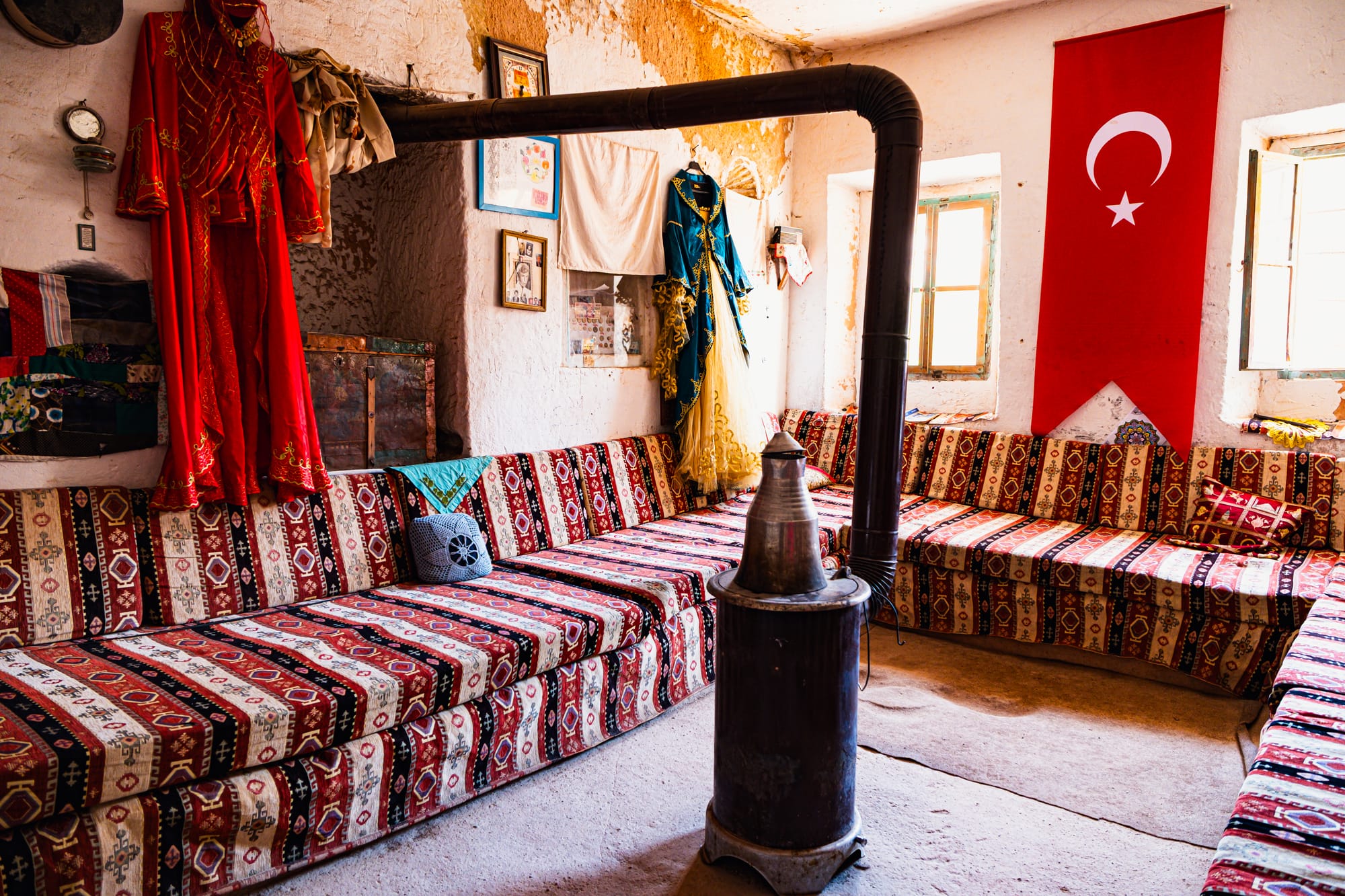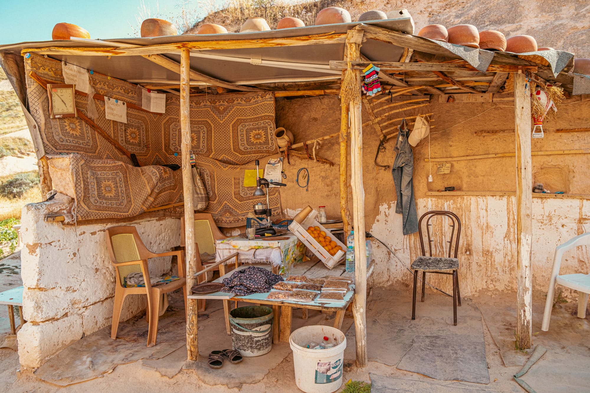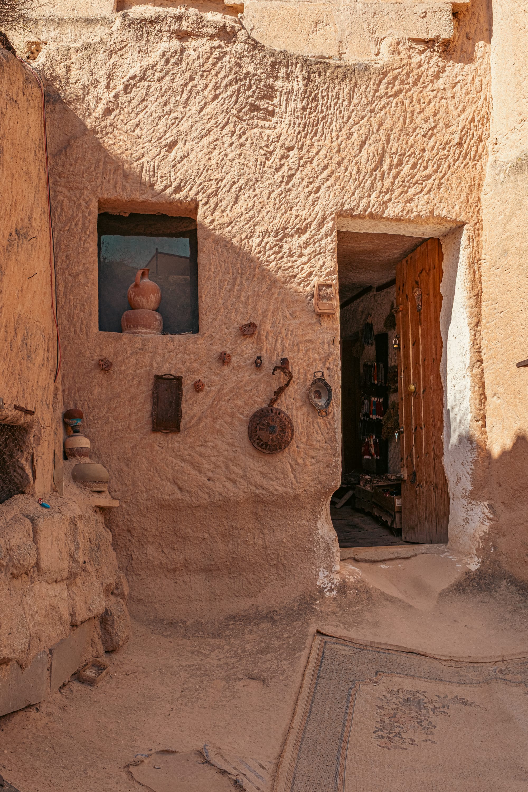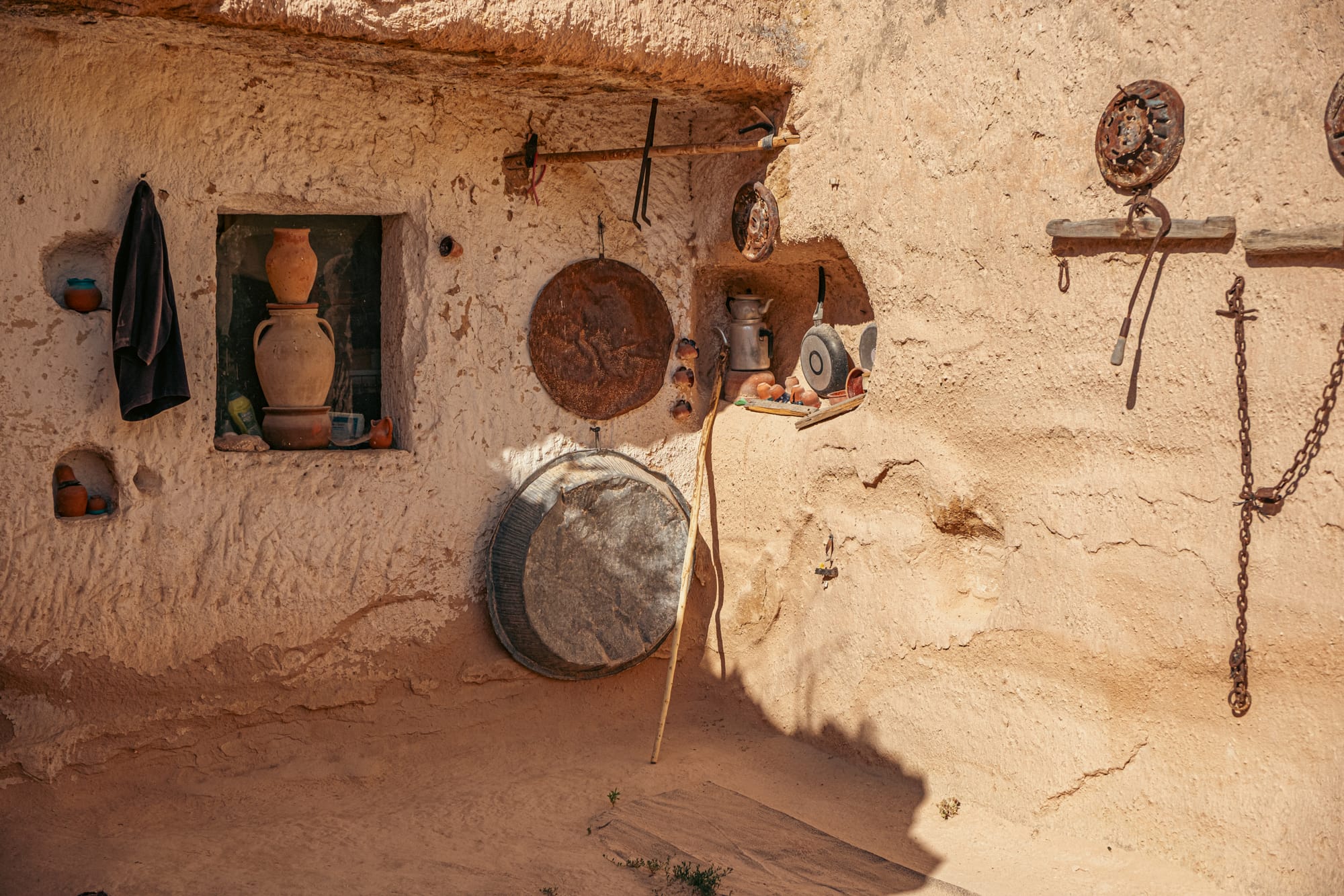 Some rooms hold wood-burning stoves encircled by cushions, ready for winter gatherings. Others are dedicated to storage and display—shelves lined with brass trays, clay jars, and delicate glassware. In one room, a row of amphorae stands against the wall, their curved surfaces marked by decades of handling.