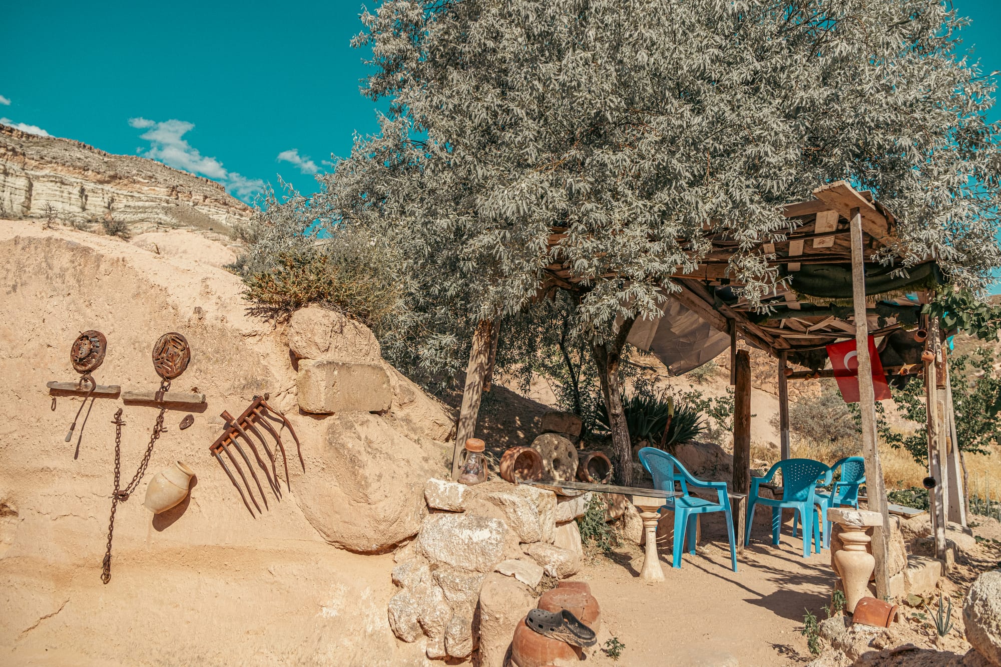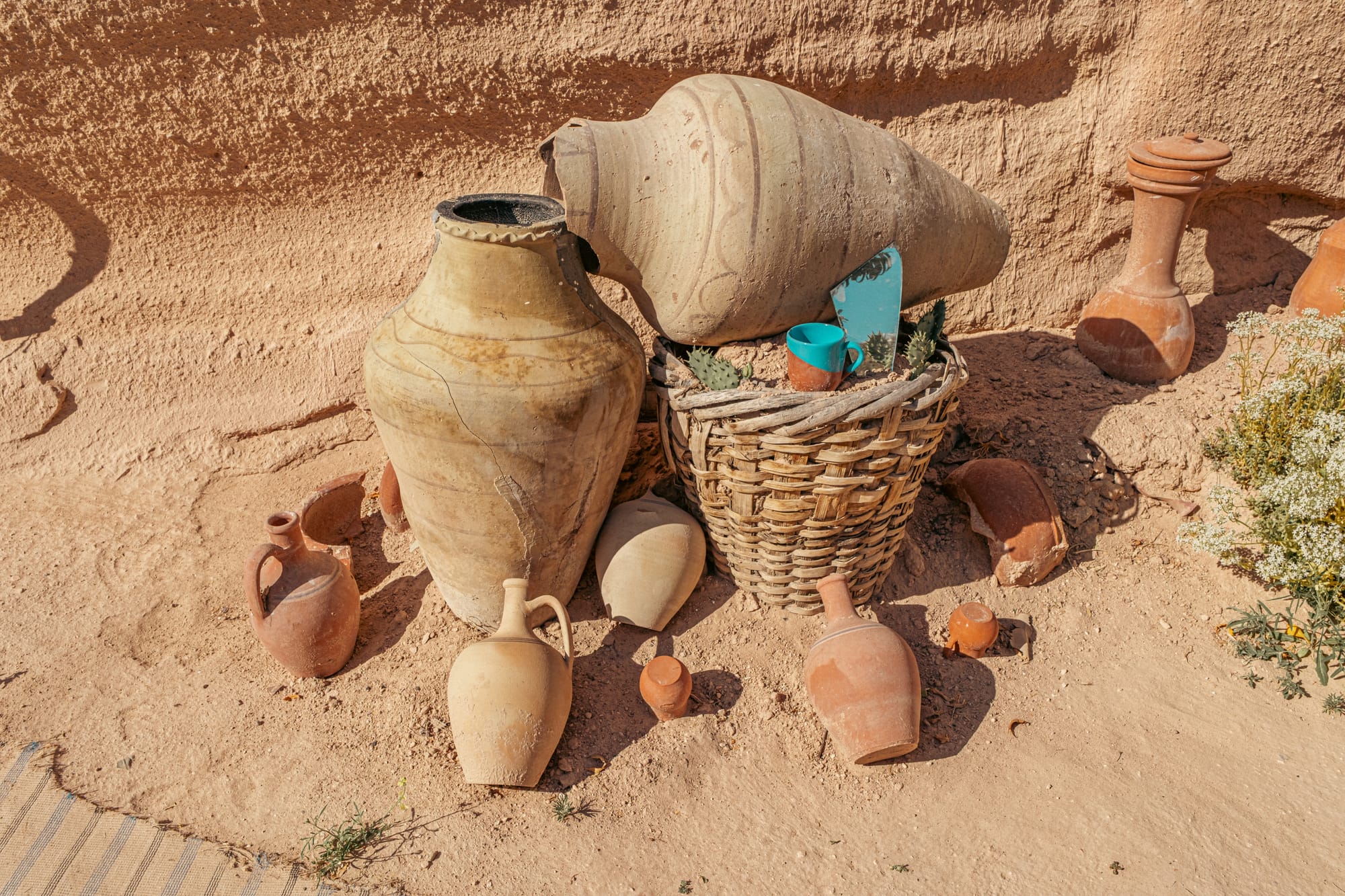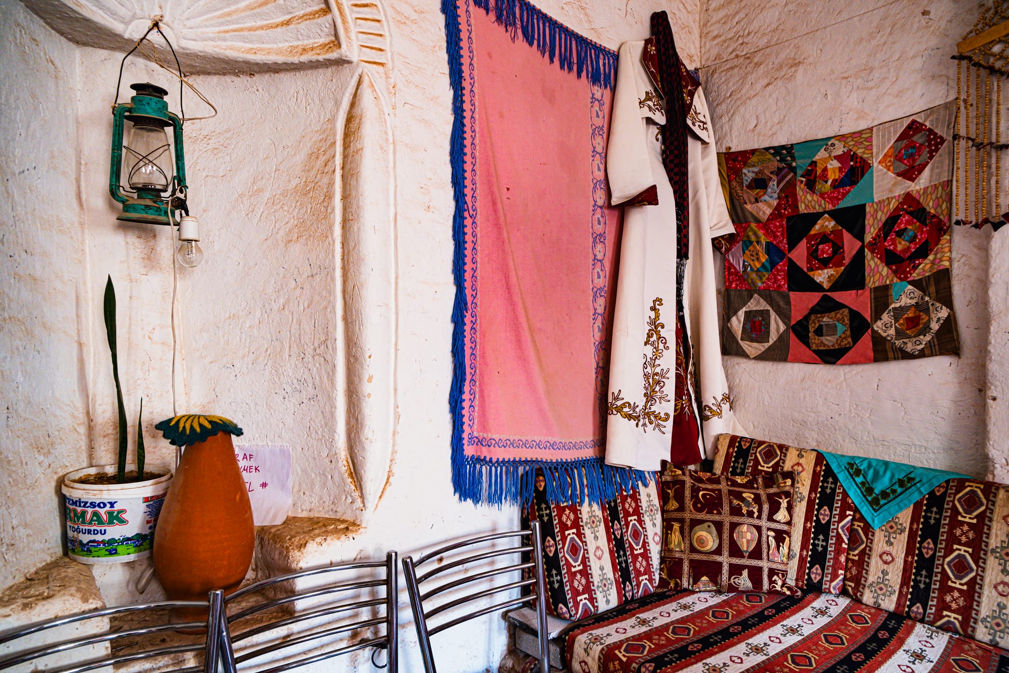 Some rooms hold wood-burning stoves encircled by cushions, ready for winter gatherings. Others are dedicated to storage and display—shelves lined with brass trays, clay jars, and delicate glassware. In one room, a row of amphorae stands against the wall, their curved surfaces marked by decades of handling.