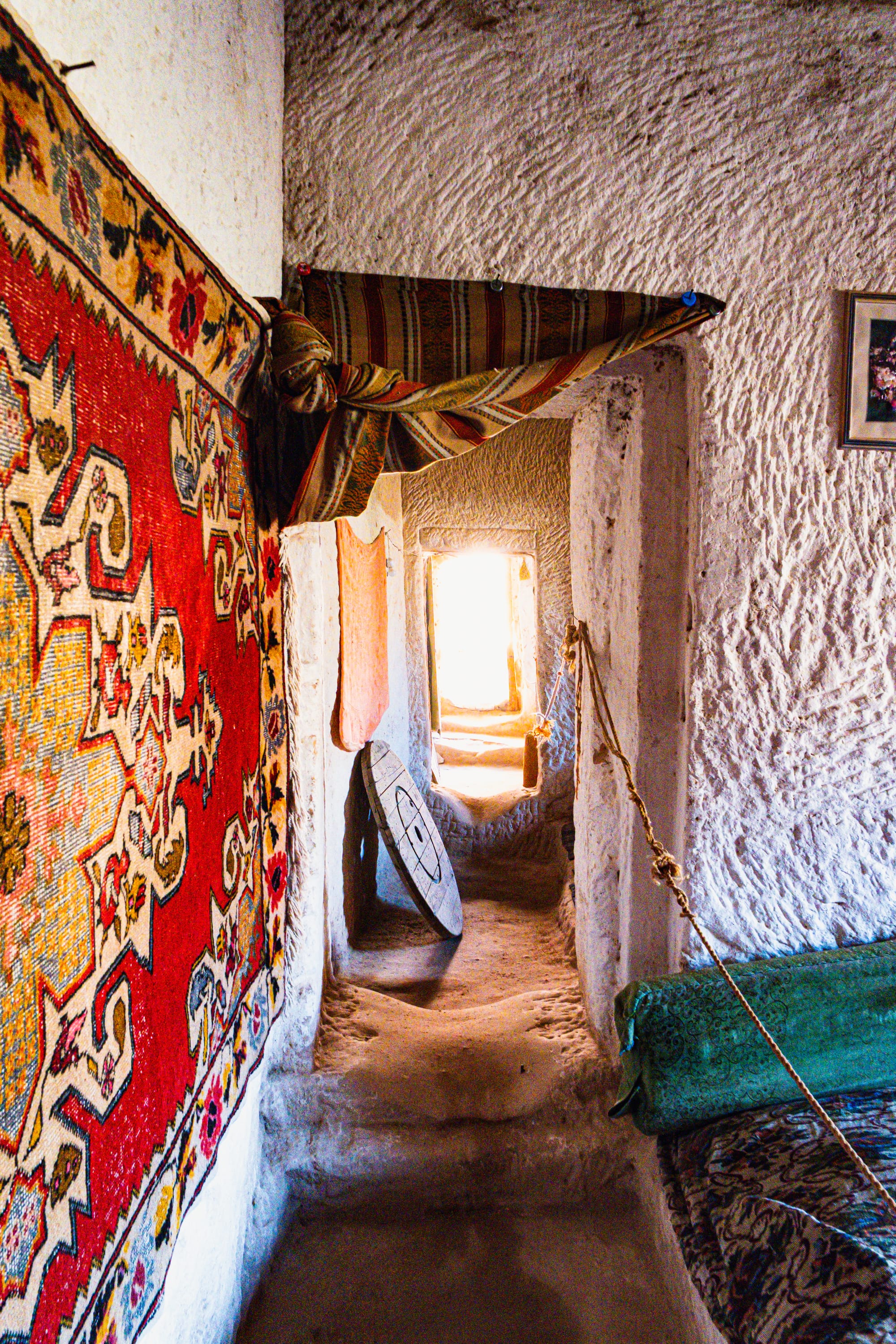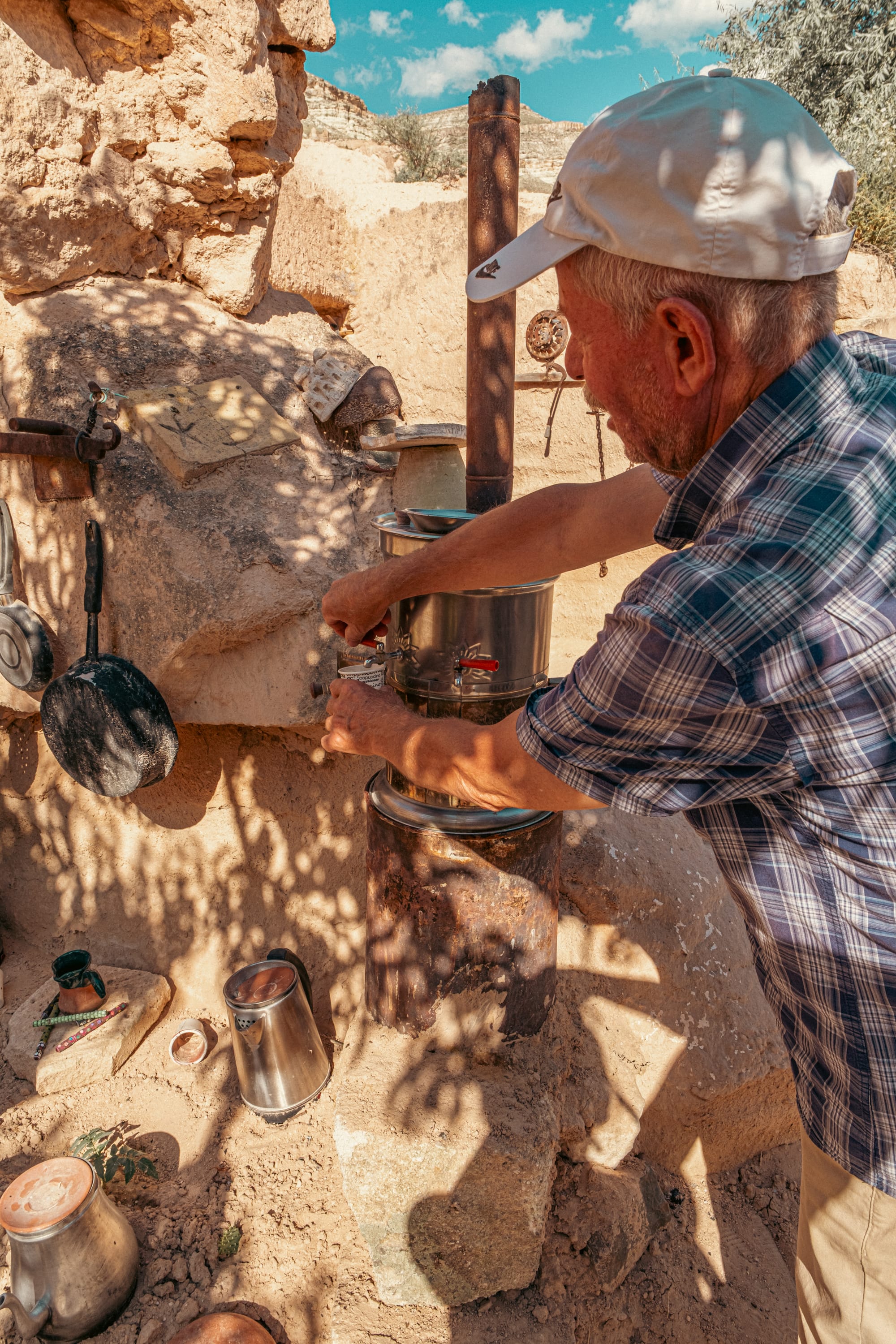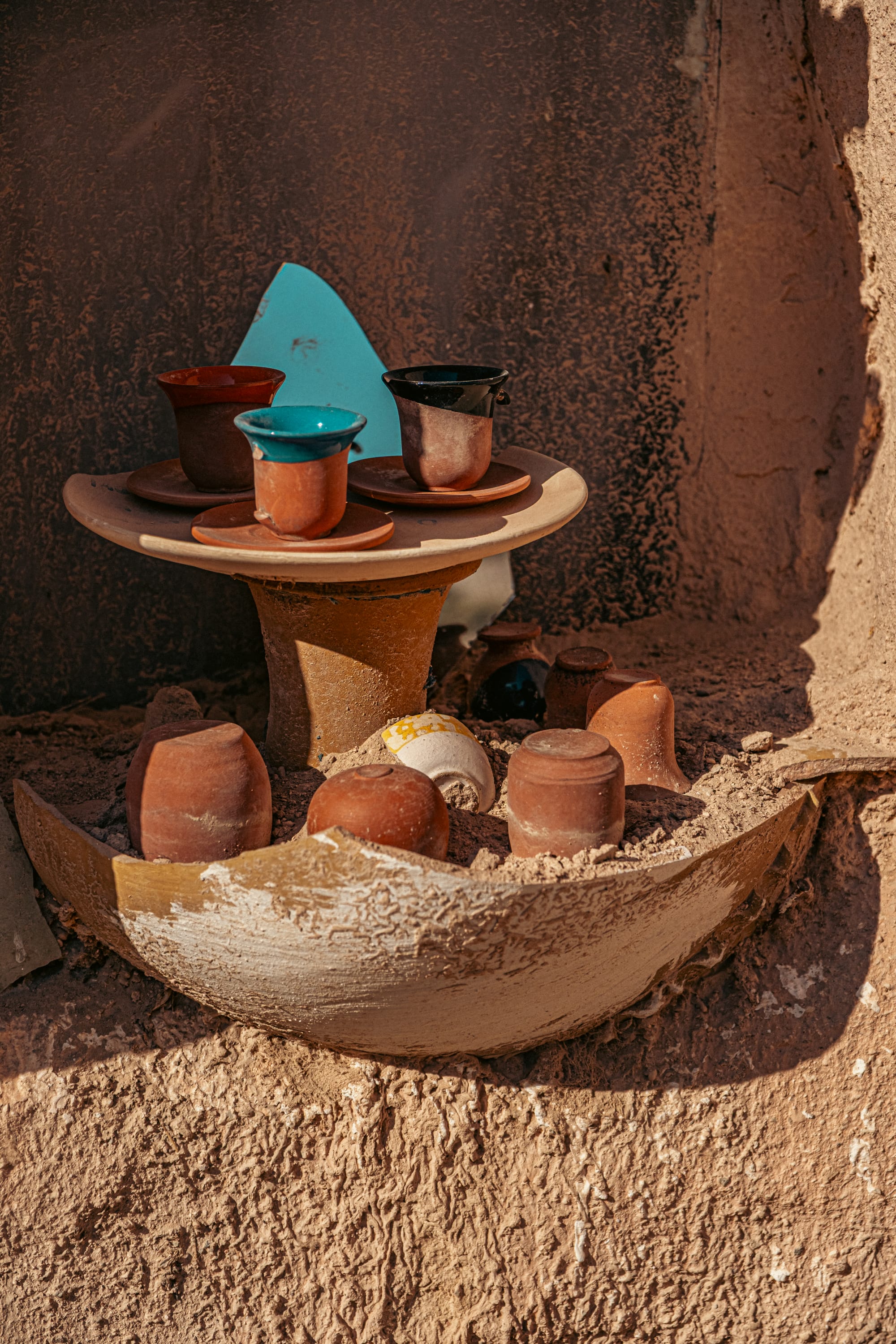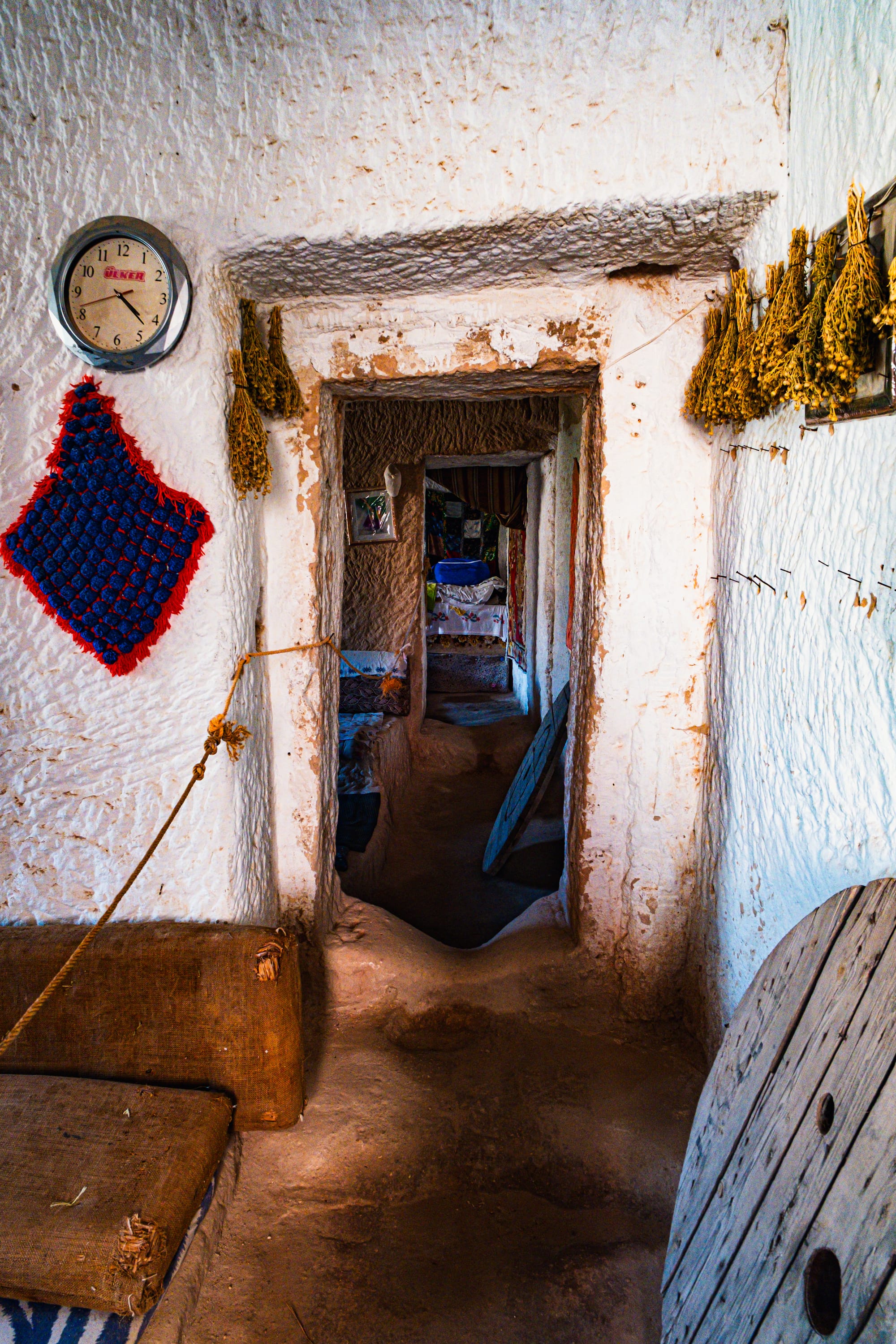 Some rooms hold wood-burning stoves encircled by cushions, ready for winter gatherings. Others are dedicated to storage and display—shelves lined with brass trays, clay jars, and delicate glassware. In one room, a row of amphorae stands against the wall, their curved surfaces marked by decades of handling.
